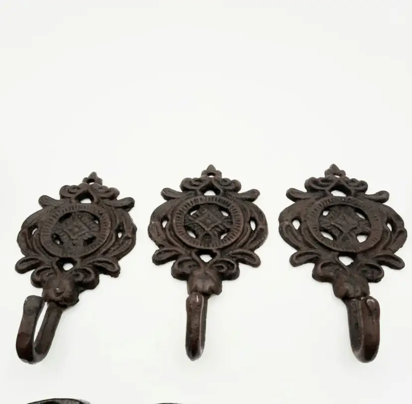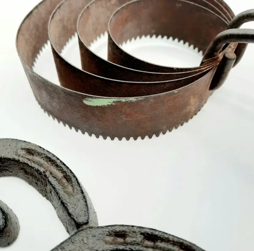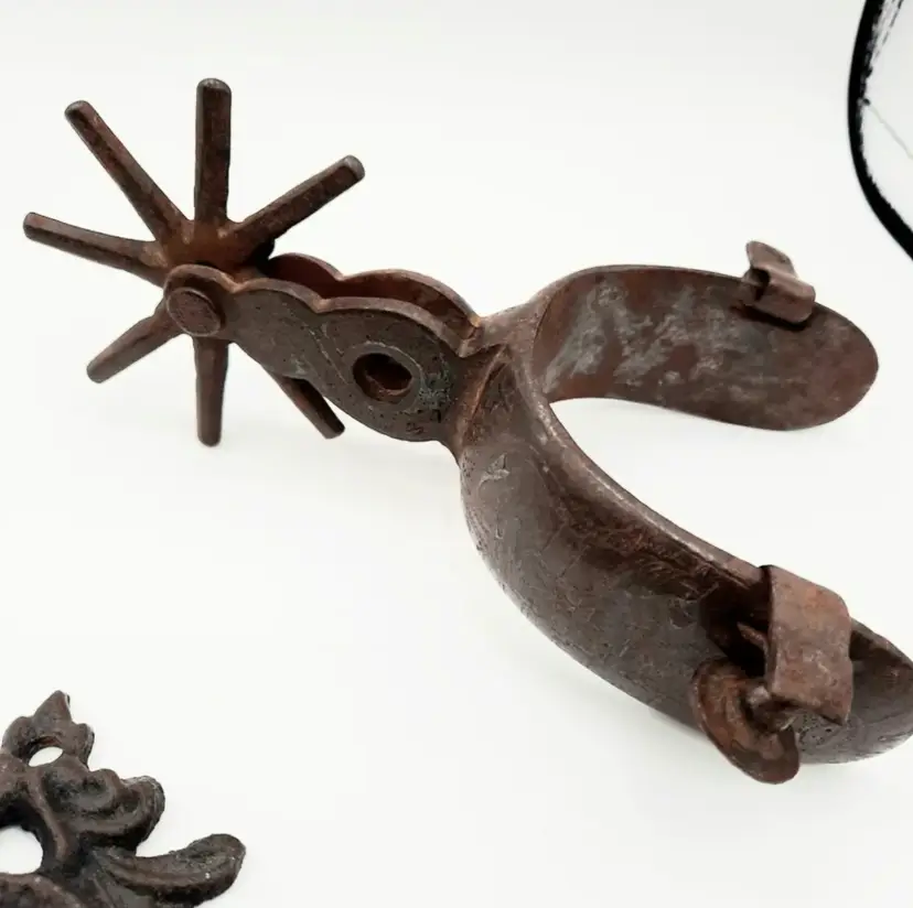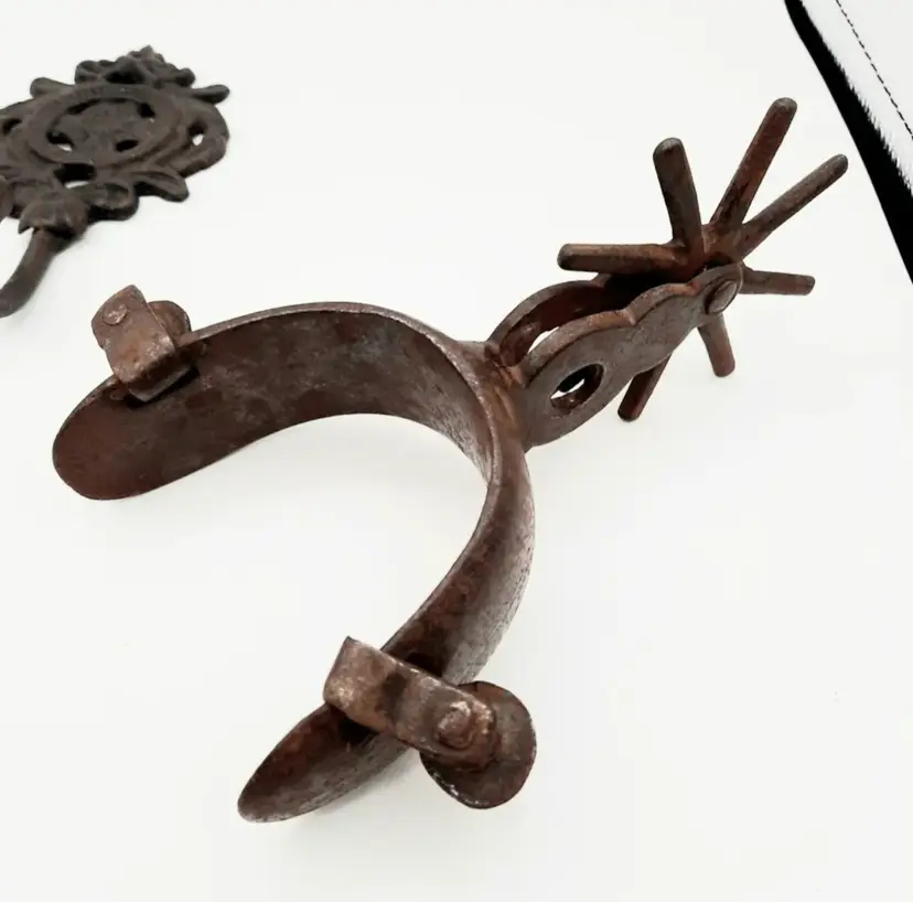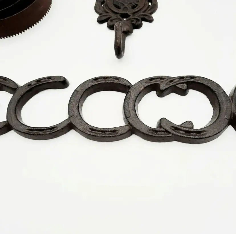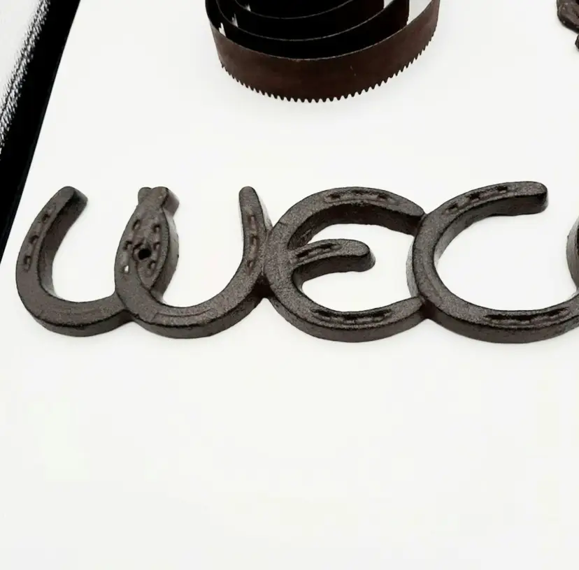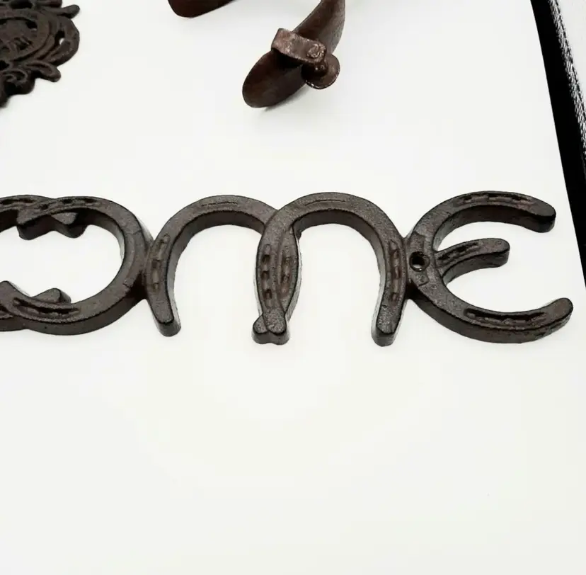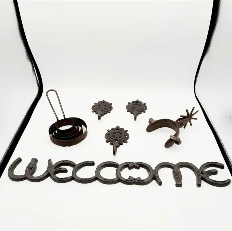 Fantastic Fun set of western decor!! Includes Welcome Horseshoe sign (21"L x 2 3/4"H), 3 wall hooks (5 1/4"H x 3"W), curry comb (does have some scuffs and paint marks) and a single spur that weighs almost a lb with a very interesting design.