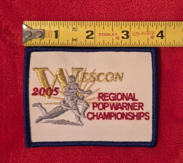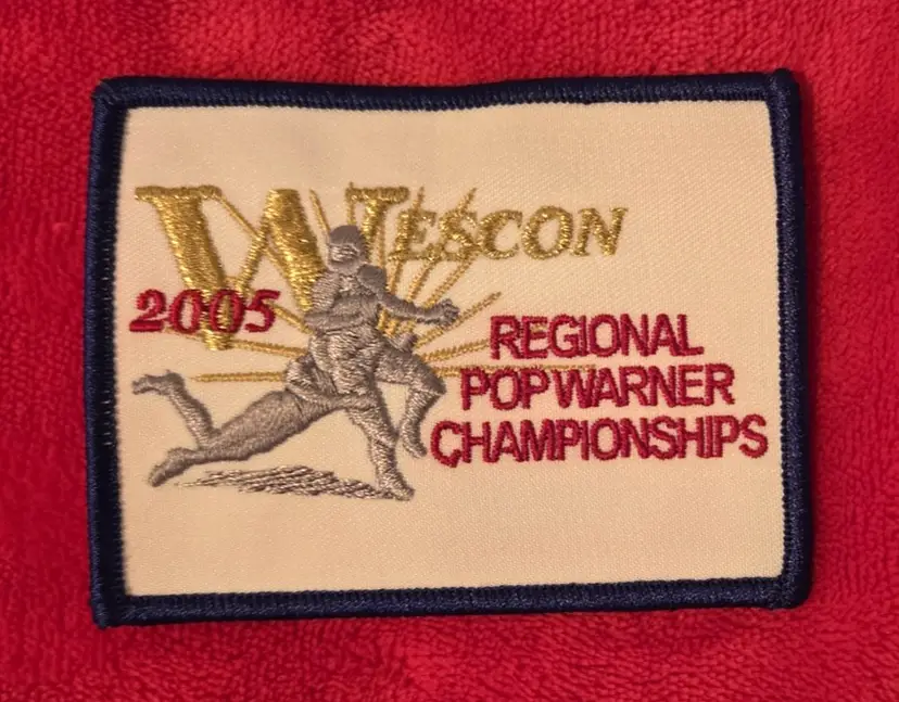 The Vintage Wescon 2005 Regional Pop Warner Championships football embroidered patch is a 3.75" wide accessory perfect for fans of football. The patch features intricate embroidery, this patch is a unique and eye-catching addition to any project or patch collection!