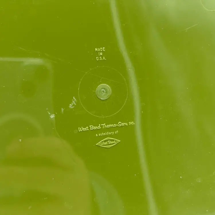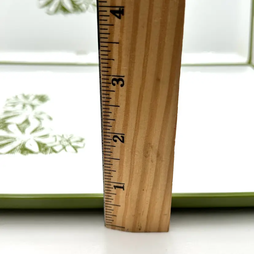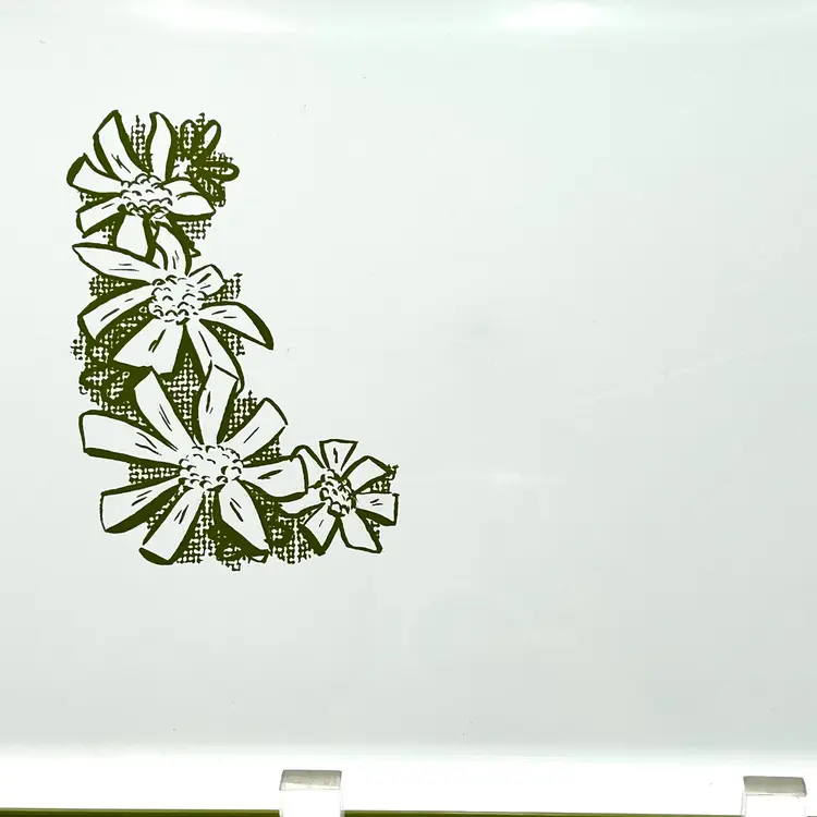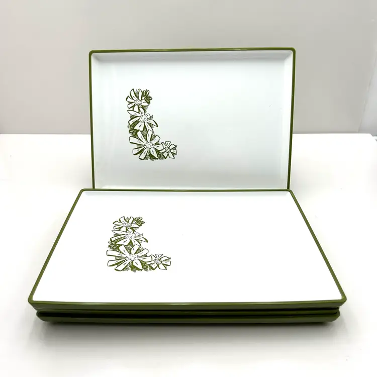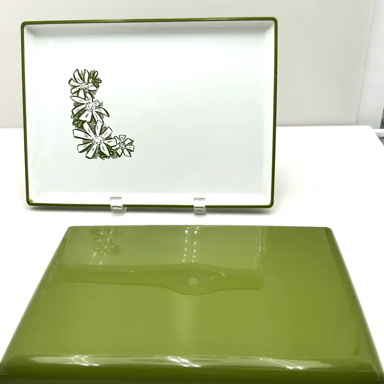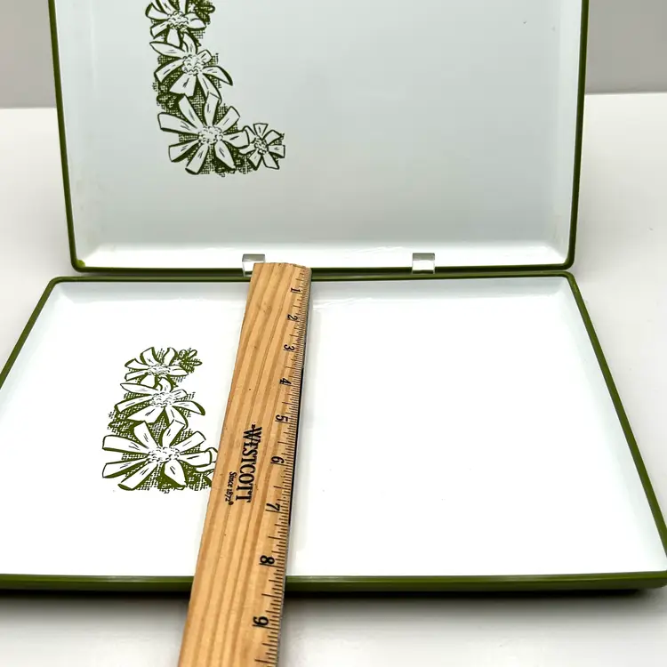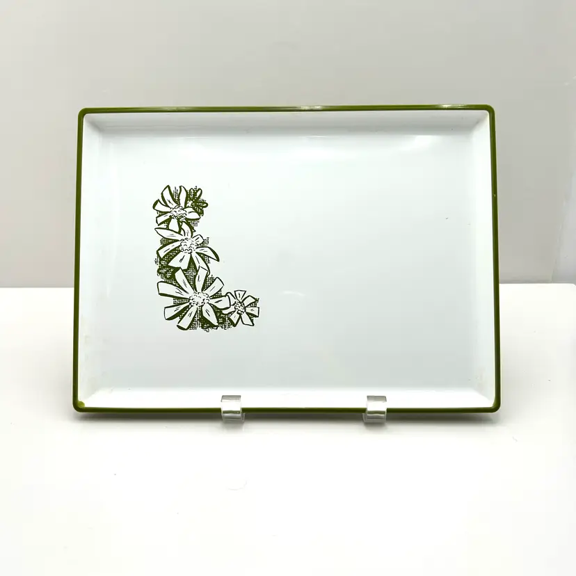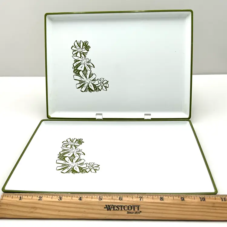 We loved this pretty vintage set of trays and thought what a great way to create little individual charcuterie boards for your friends. The trays are from West Bend and were part of the Thermo Serv line. They are a fun mid century design in avocado green and white with a retro floral design. Each tray is about 11 inches long, 8 inches wide and about ¼ inch deep. They are in great condition with no chips or cracks.