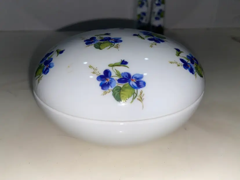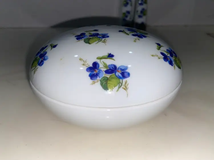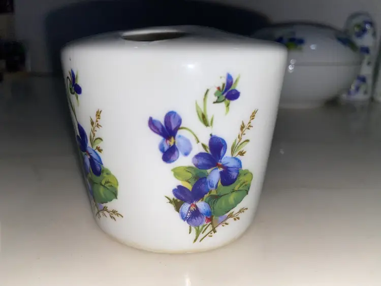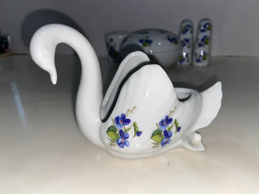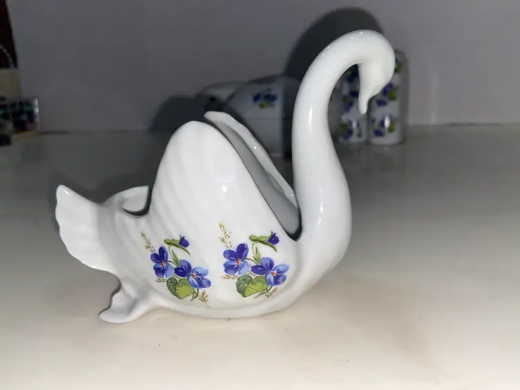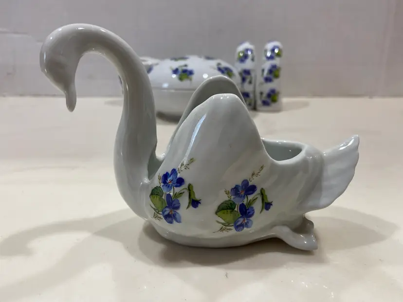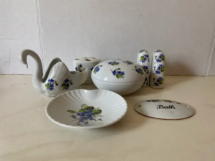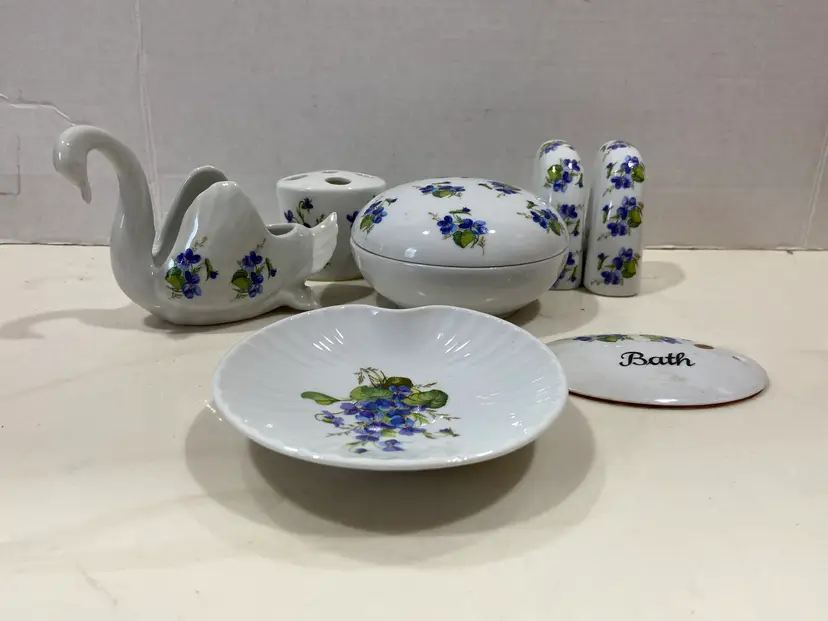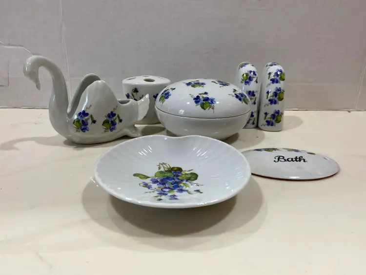 WEST Germany Barvarian Porcelain Bath Set Violets soap dish, toothbrush holder, trinket swan dish, bath wall plaque, small covered bowl, toilet paper holder