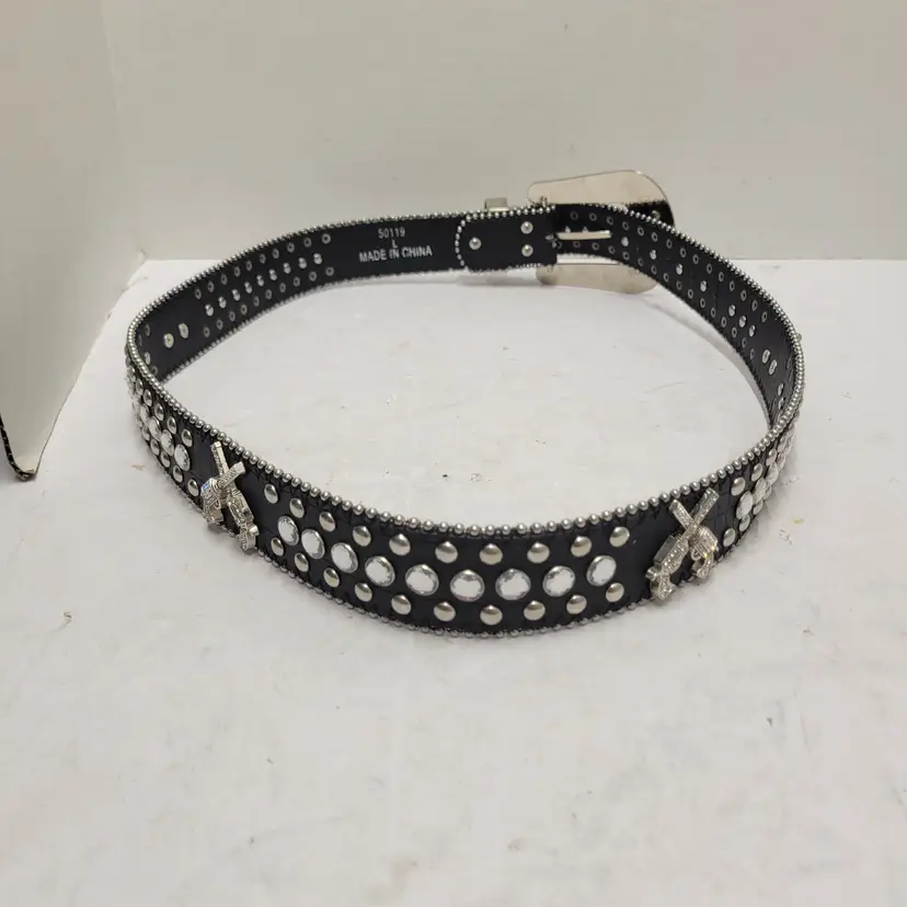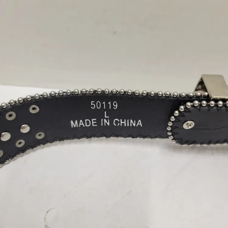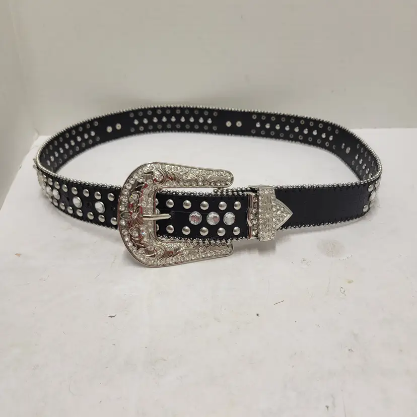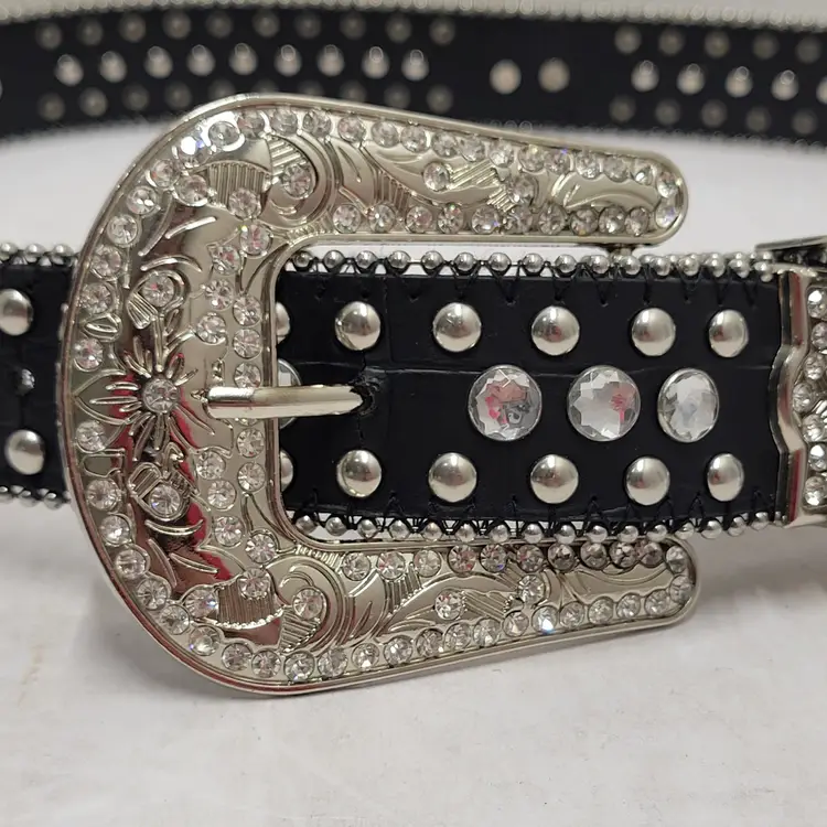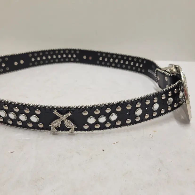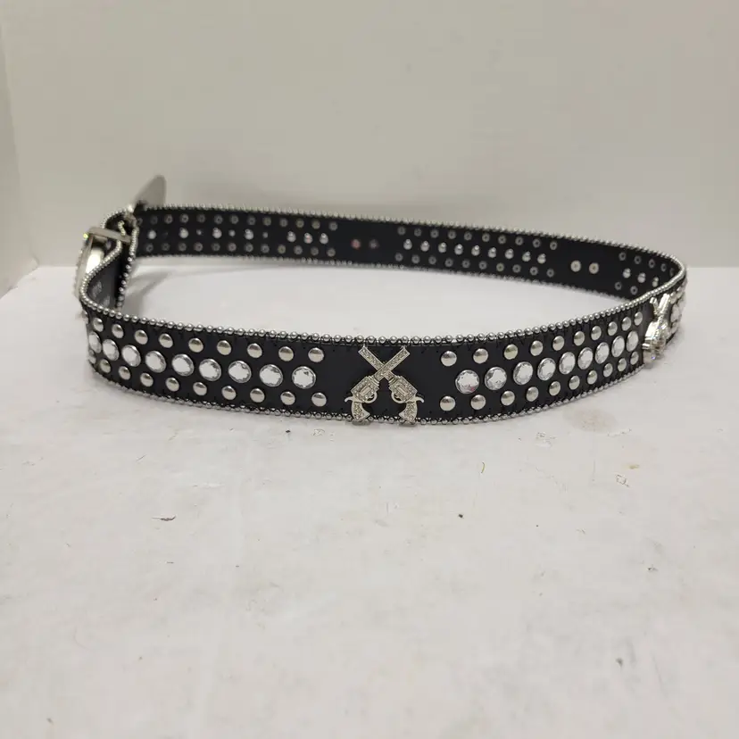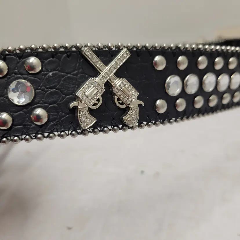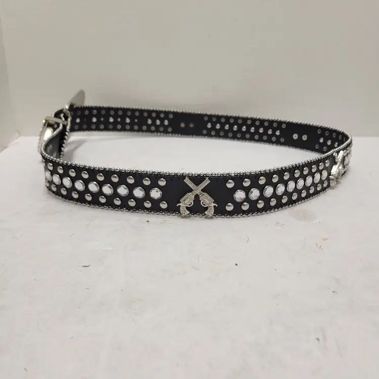 Western Rhinestone Studded Belt Black Faux Leather Crossed Pistols Size L 50119