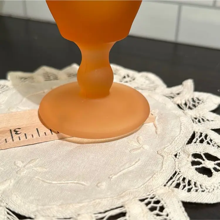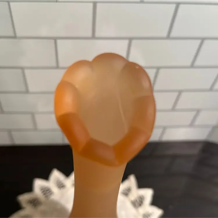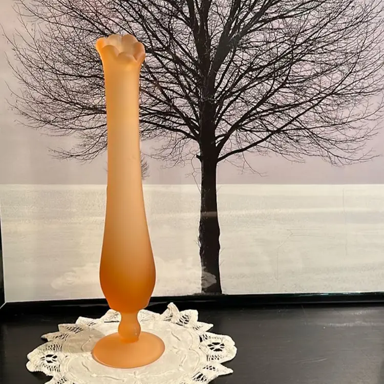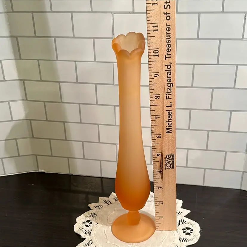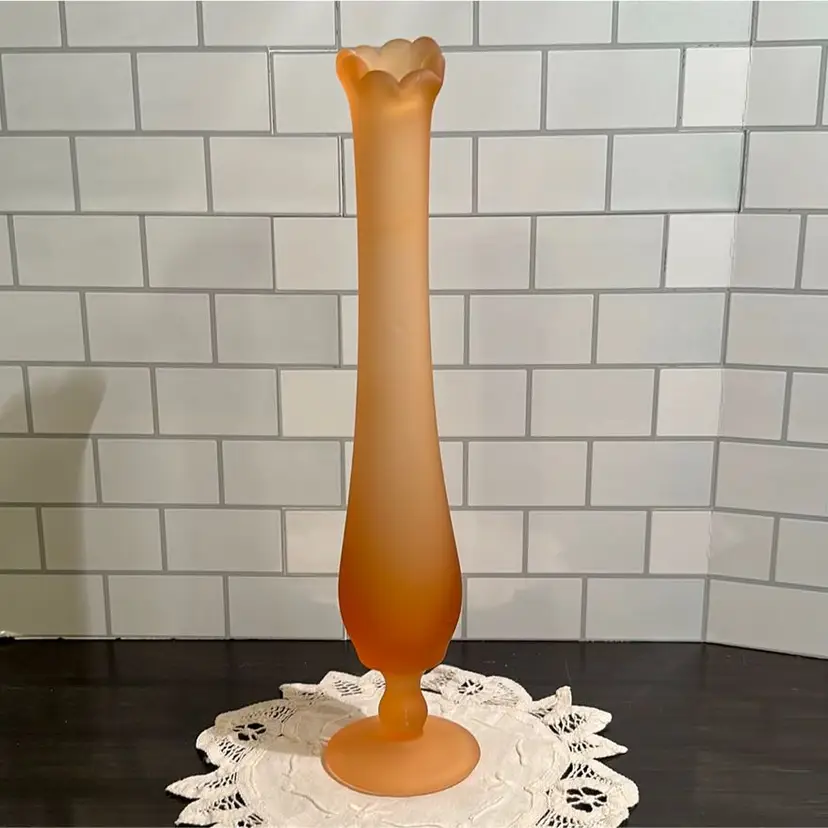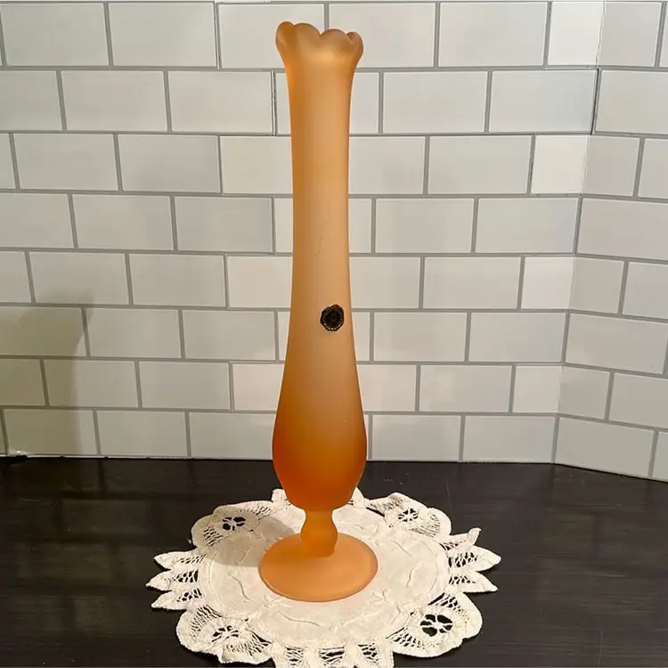 Welcome to the stage… Amber Mist! This Westmoreland Bud Vase stands at 10 3/4” tall and has a round footed vase that is roughly 3 1/2” in diameter. There are a couple of possible inclusions shown in the pictures.