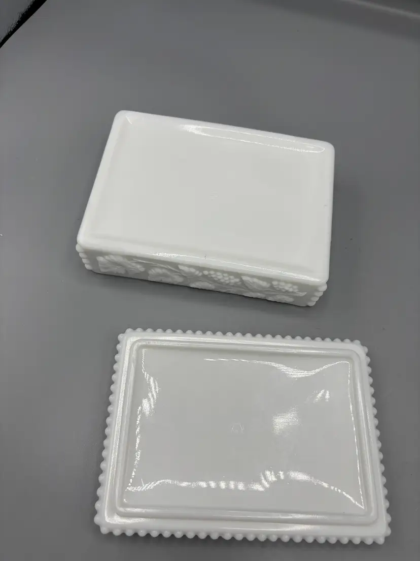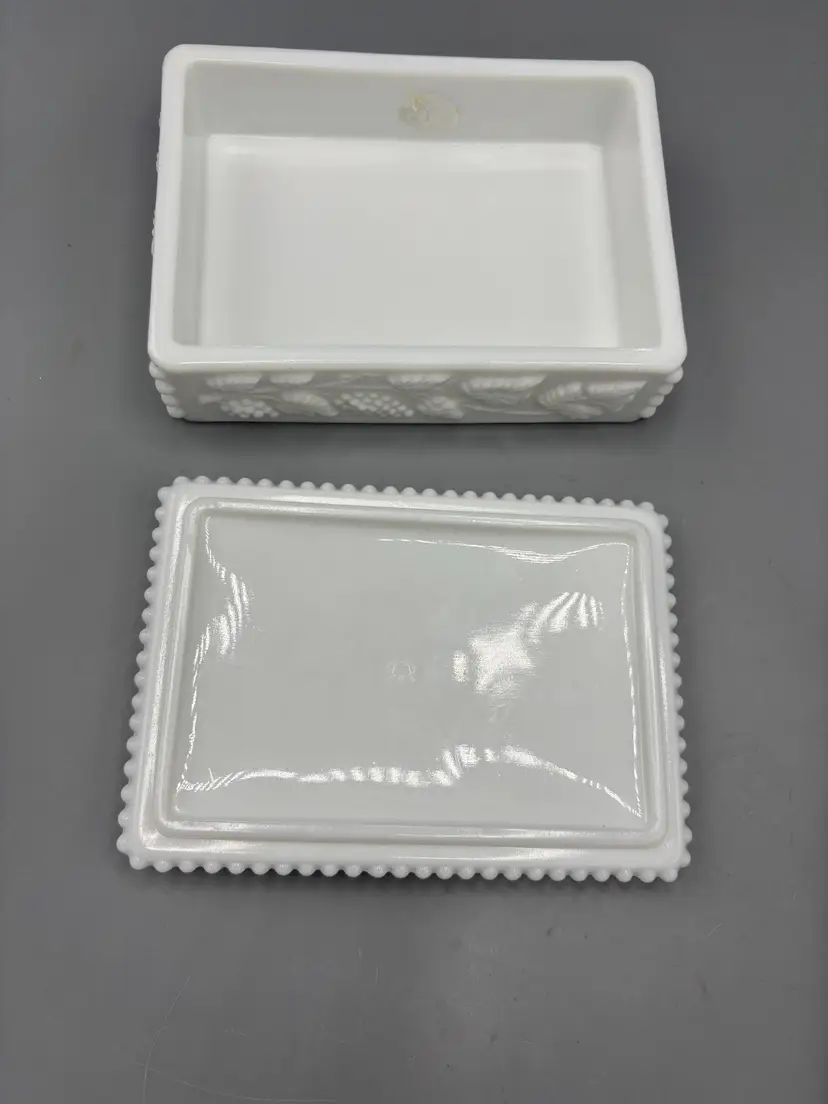 Westmoreland beaded Milk glass grape cigarette box that is great to hold keys, change, jewelry and more. This is a lovely milk glass box! Refer to pictures for details.