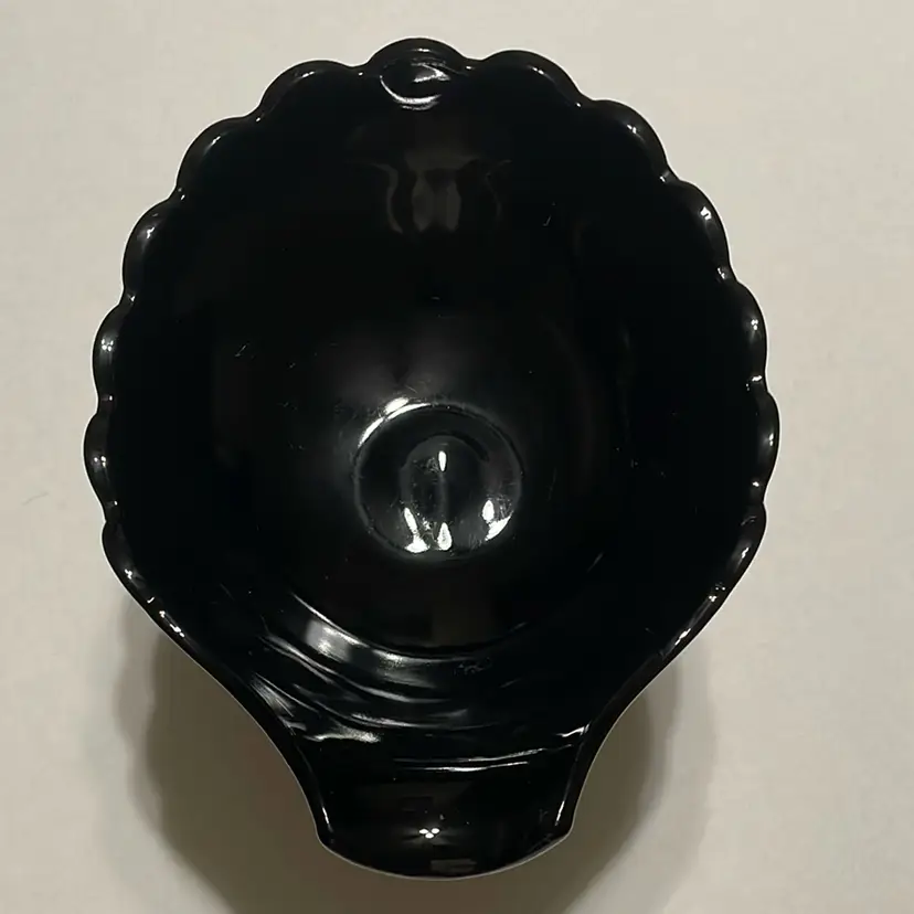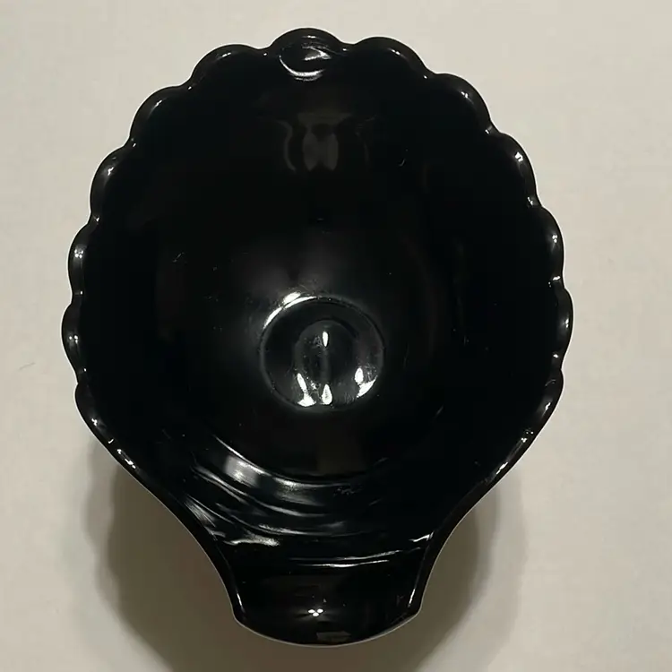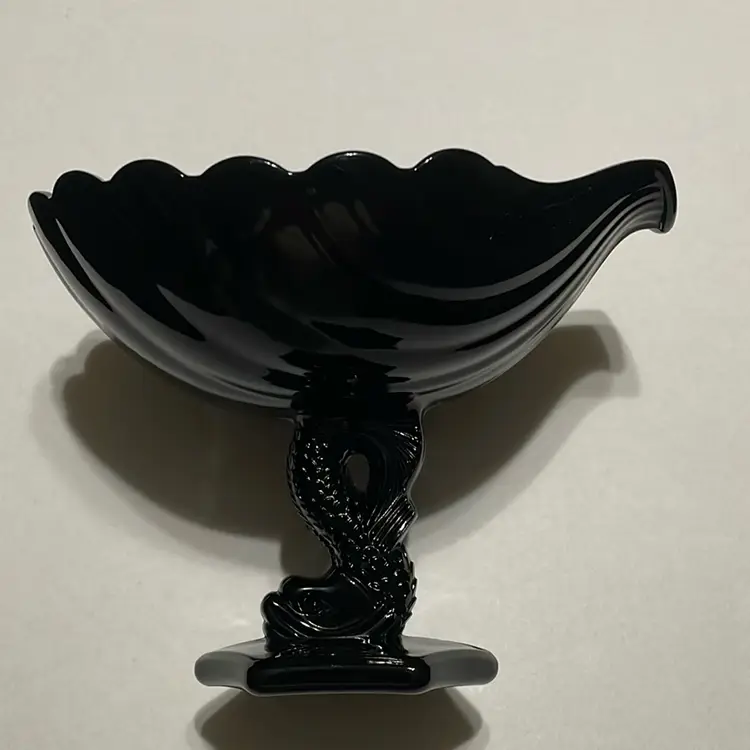 This beautiful black glass compote bowl by Westmoreland features a unique seashell design with a playful dolphin or koi fish pedestal base. Measuring 6.75 inches in diameter and 8.5 inches in length.