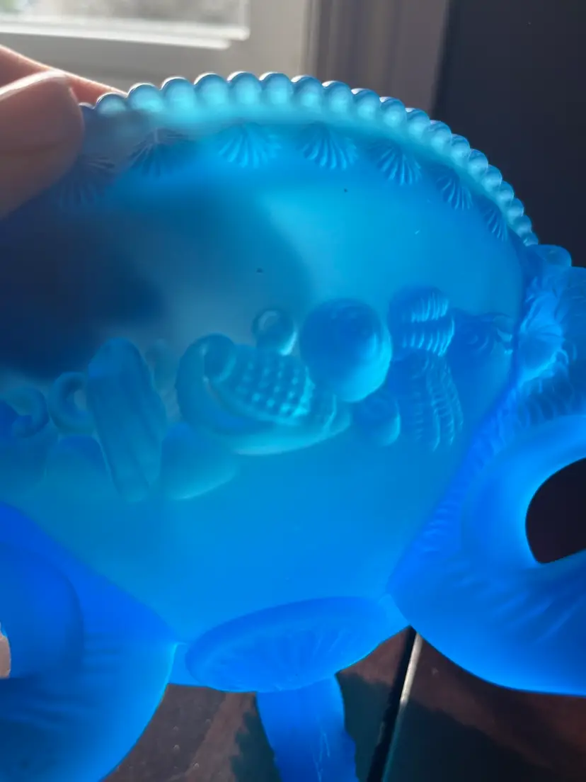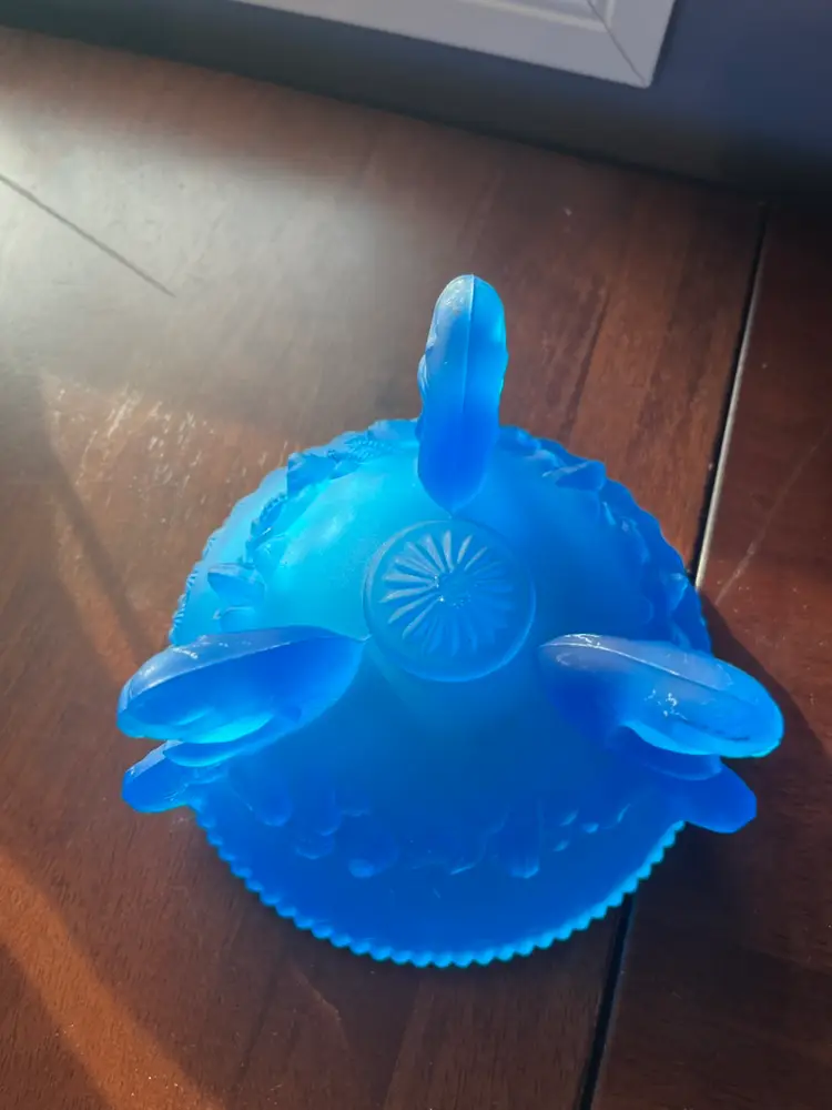The Argonaut Shell pattern, often produced in various colors and finishes like the blue mist satin seen here, is a distinctive design that evokes marine themes. This particular piece, likely intended as a candy dish or decorative bowl, showcases the company's ability to create intricate molded designs with an appealing satin texture, characteristic of their popular mid-century offerings. 3.5” tall x 5” wide