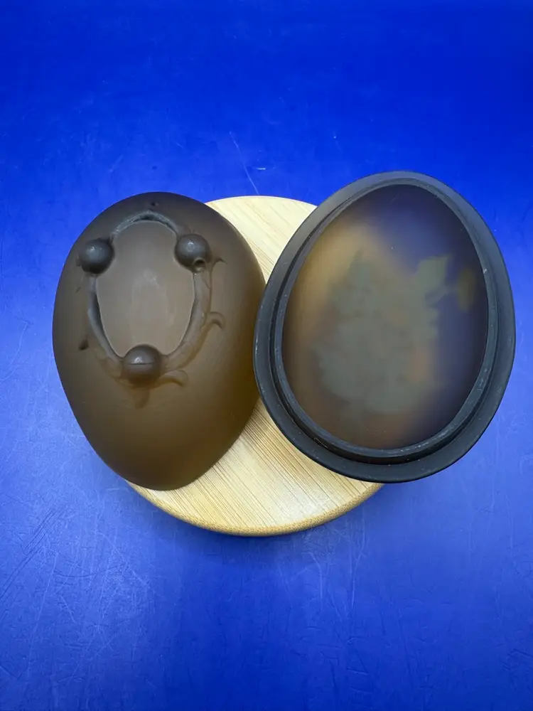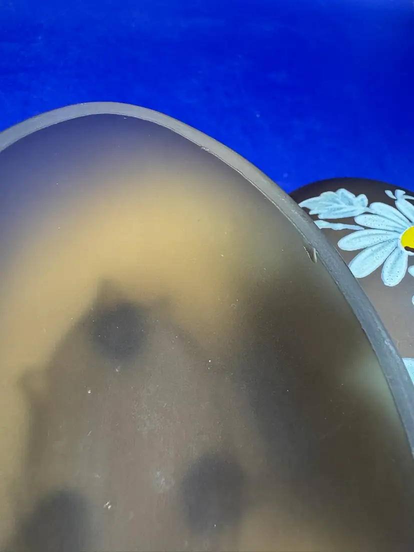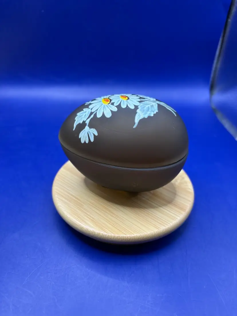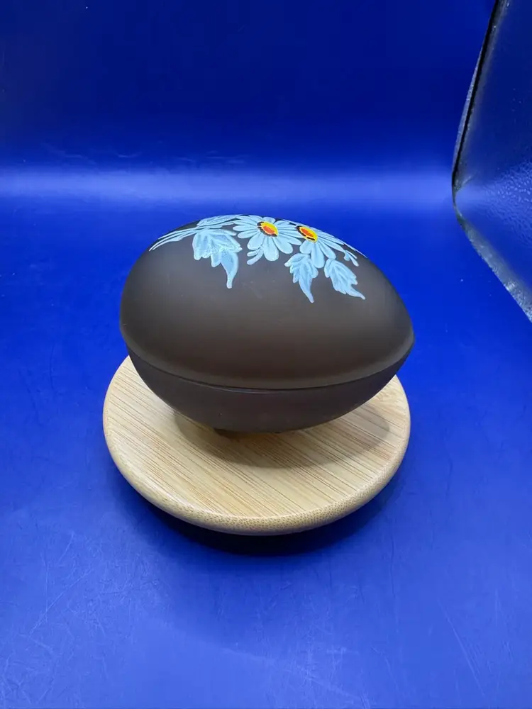 Westmoreland glass egg trinket box Brown glass with hand painted painted daisies 3 legged 1970/80s Measures 3 1/4 inches by 2 1/4 inches by 2 1/4 inches tall There is a small chip on inside edge in bottom part. See last photo