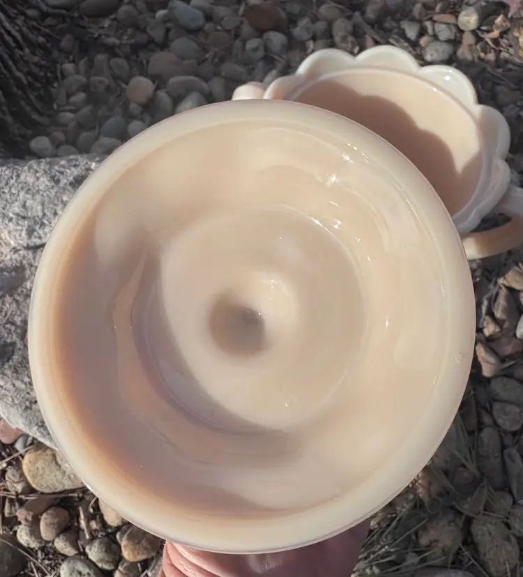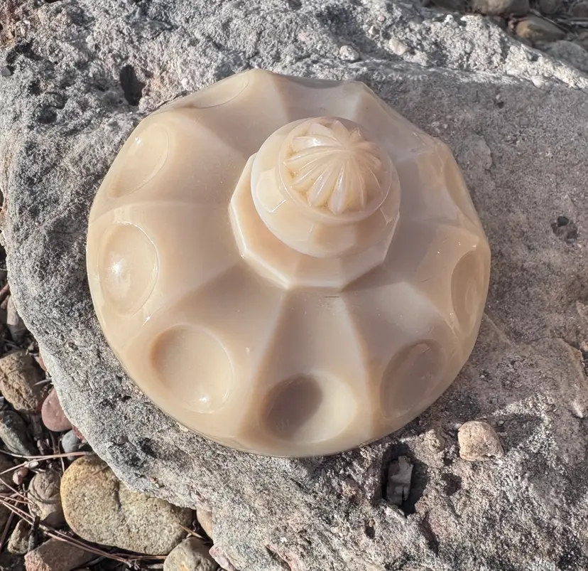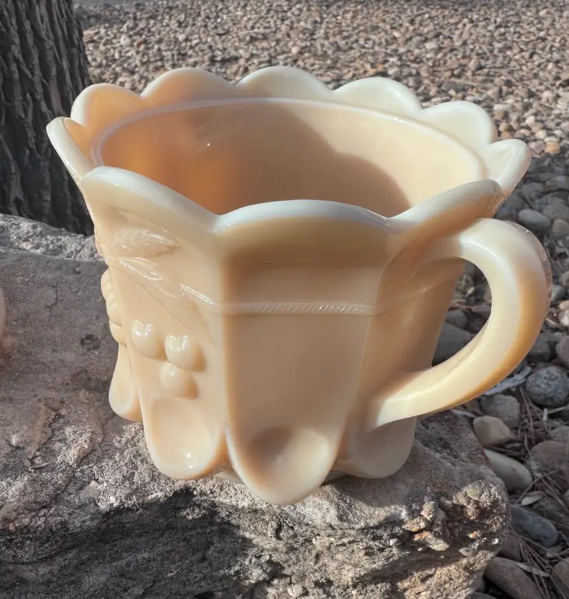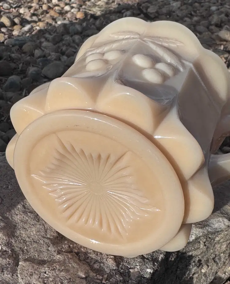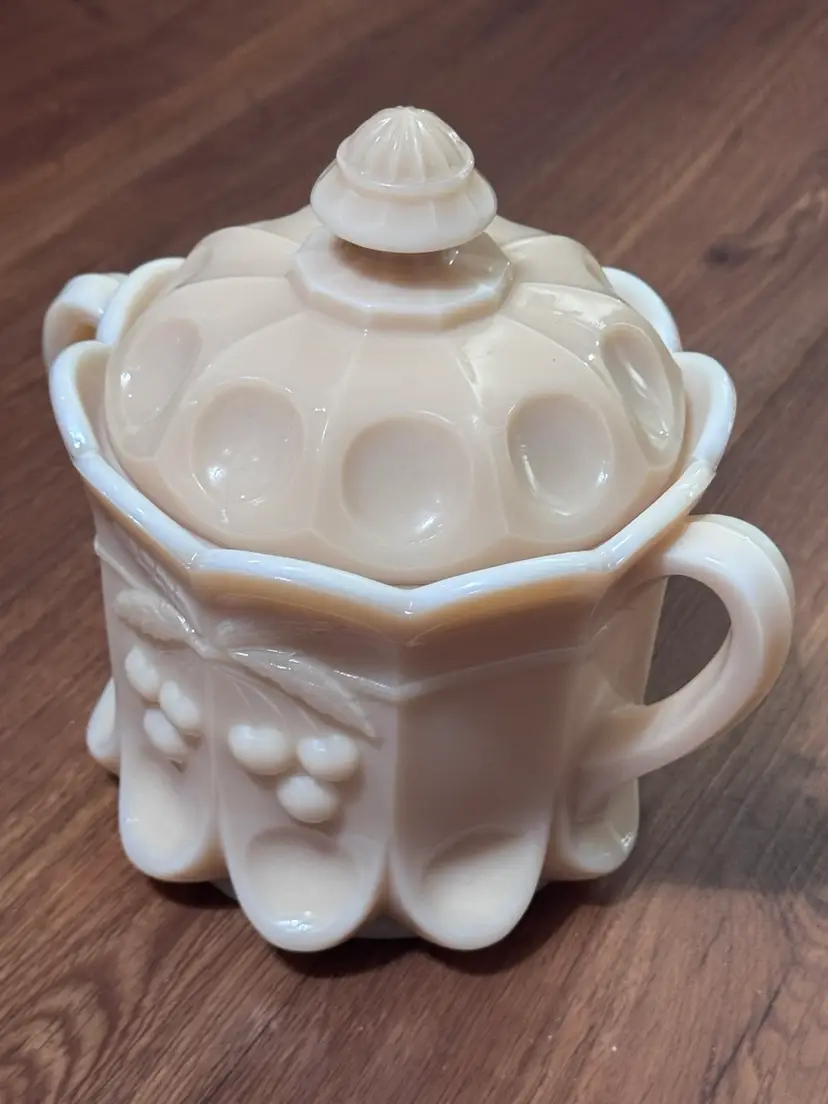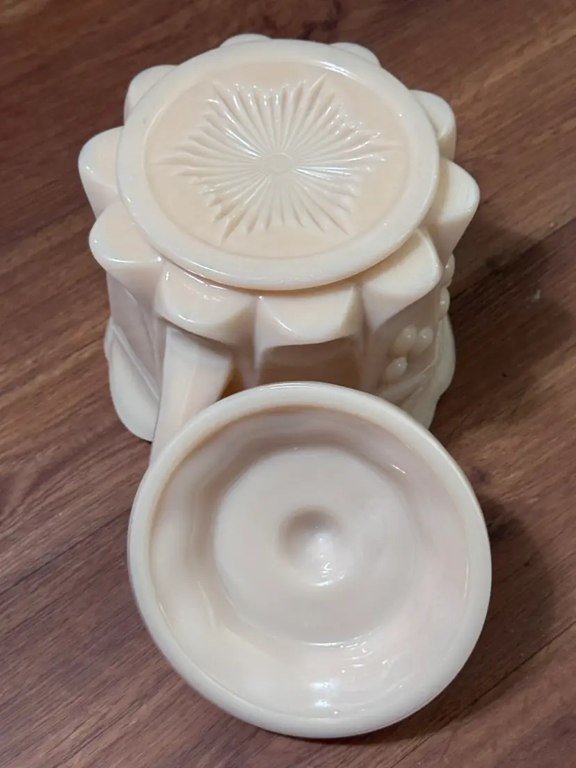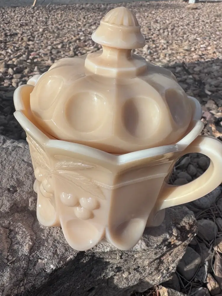 This is in excellent condition with no chips or cracks. This is in the Almond color (not milk glass). Please see pictures for the Westmoreland makers mark. Very heavy piece and can be candled. 8 x 8 x 6"
