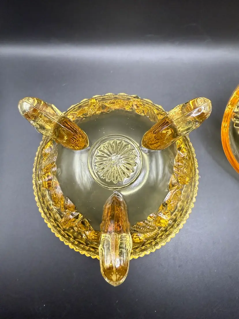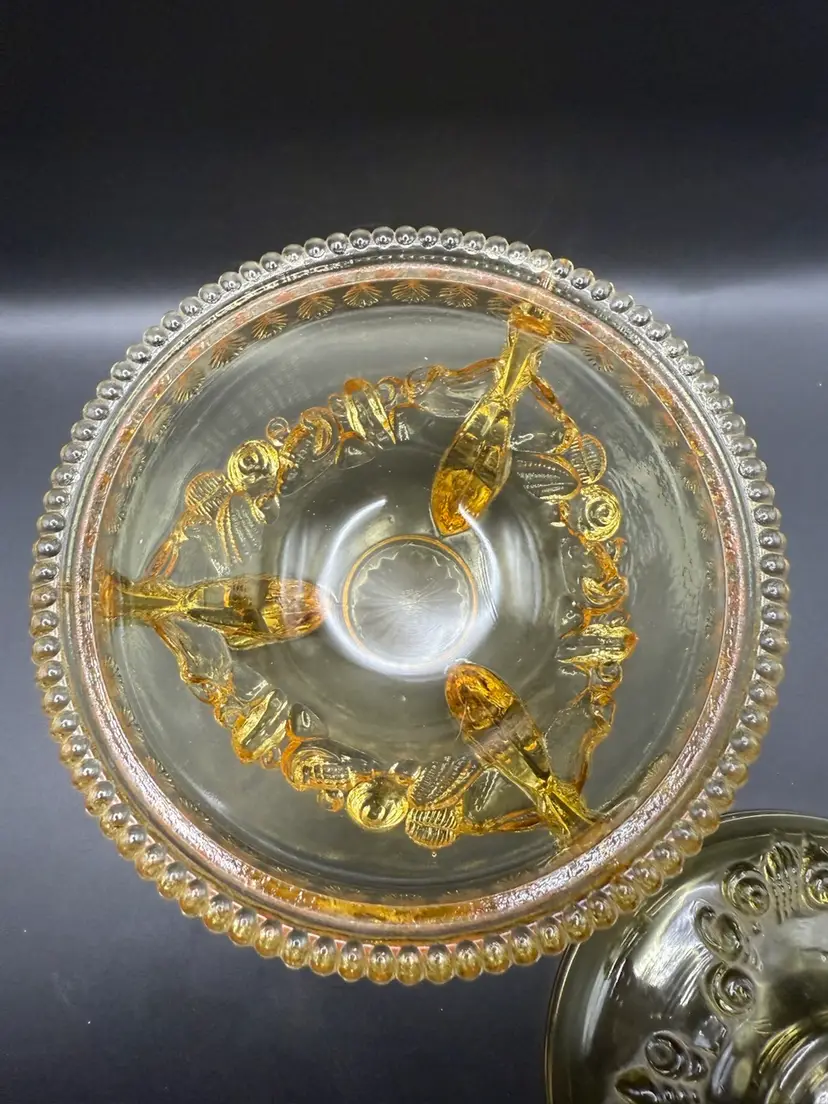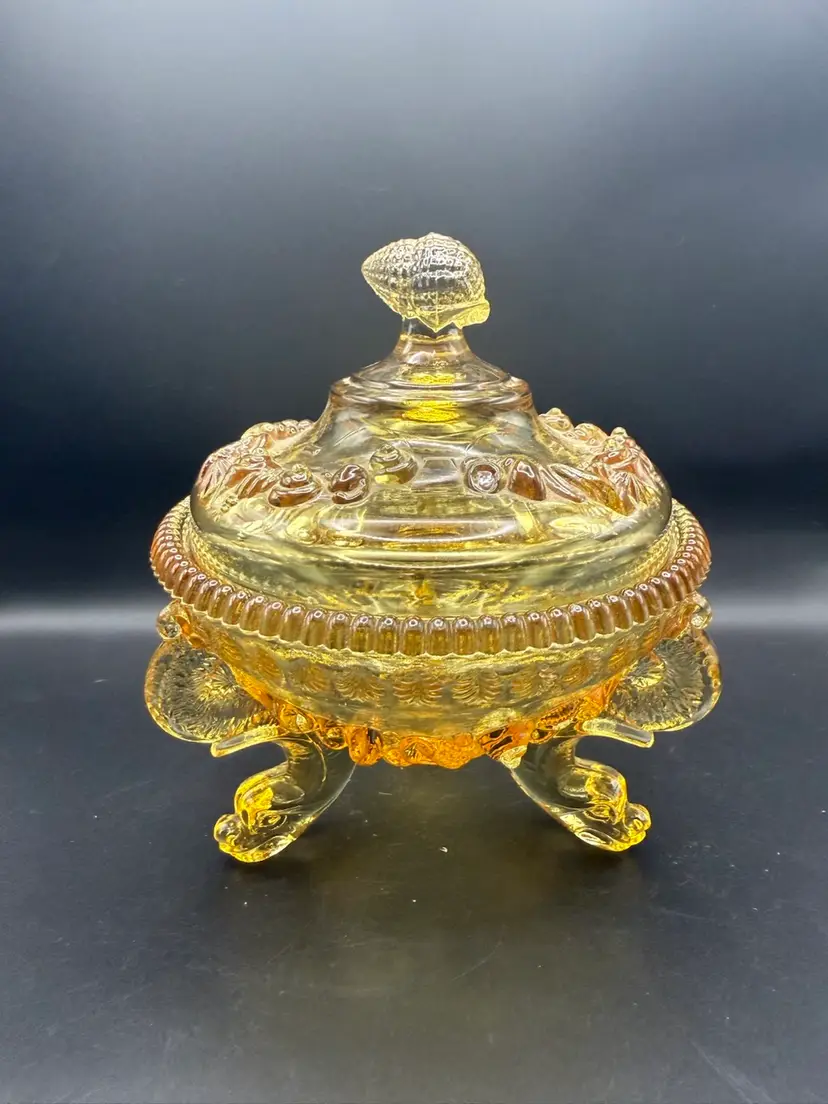The Westmoreland Argonaut Shell pattern, featuring dragon feet, is one of Westmoreland's iconic designs. This pattern typically appeared in various colors, including amber, pink, and milk glass, and was produced from the mid-20th century. The intricate detailing of the shell and dragon elements makes this piece absolutely stunning.