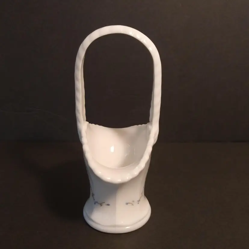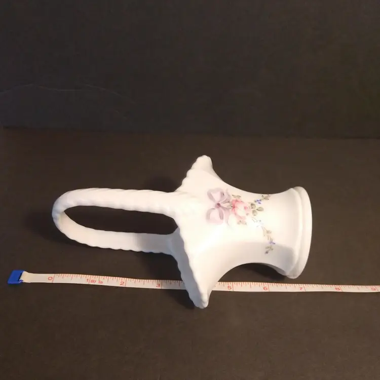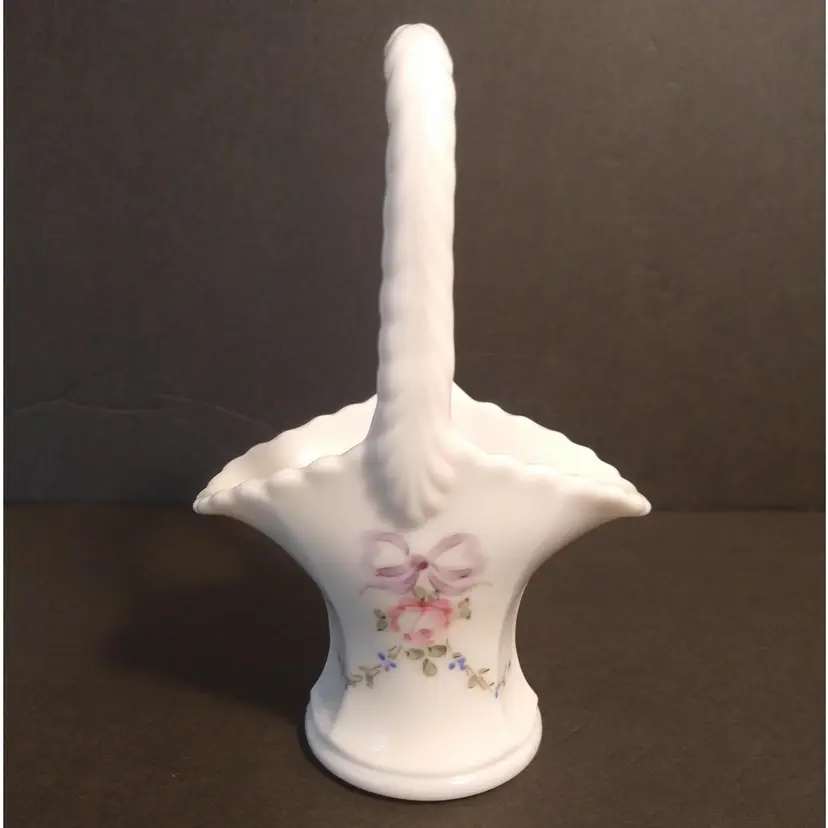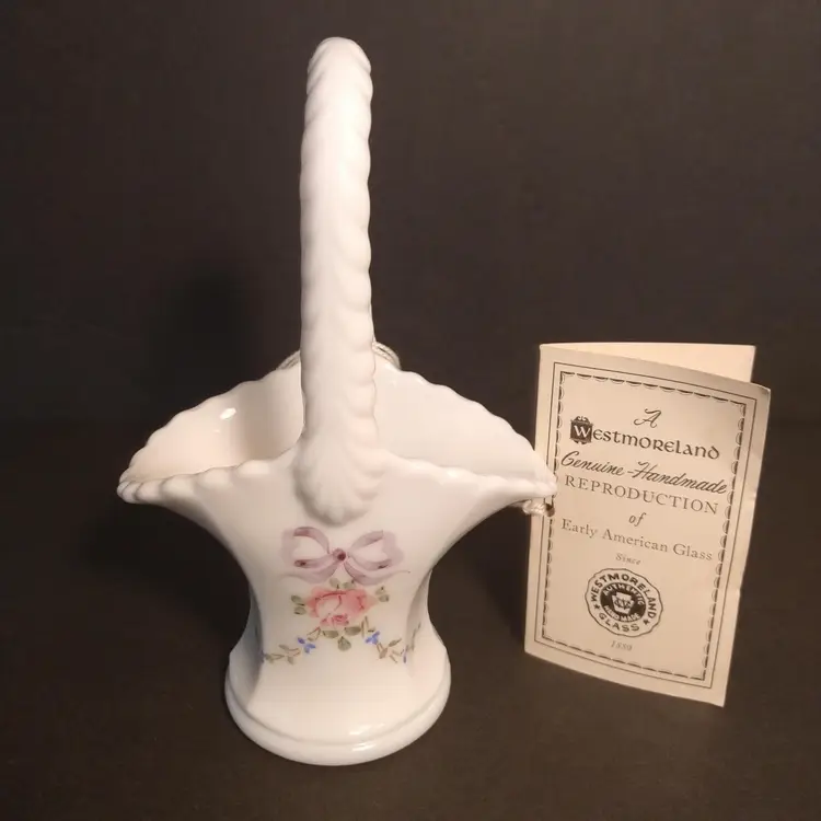 This is a Westmoreland hand painted milk glass basket. Painted in the roses and bows pattern. The painting is absolutely beautiful. It comes with the Westmoreland authenticity card that has information about Westmoreland Glass. It is marked on the bottom and there are no chips or cracks or flea bites.