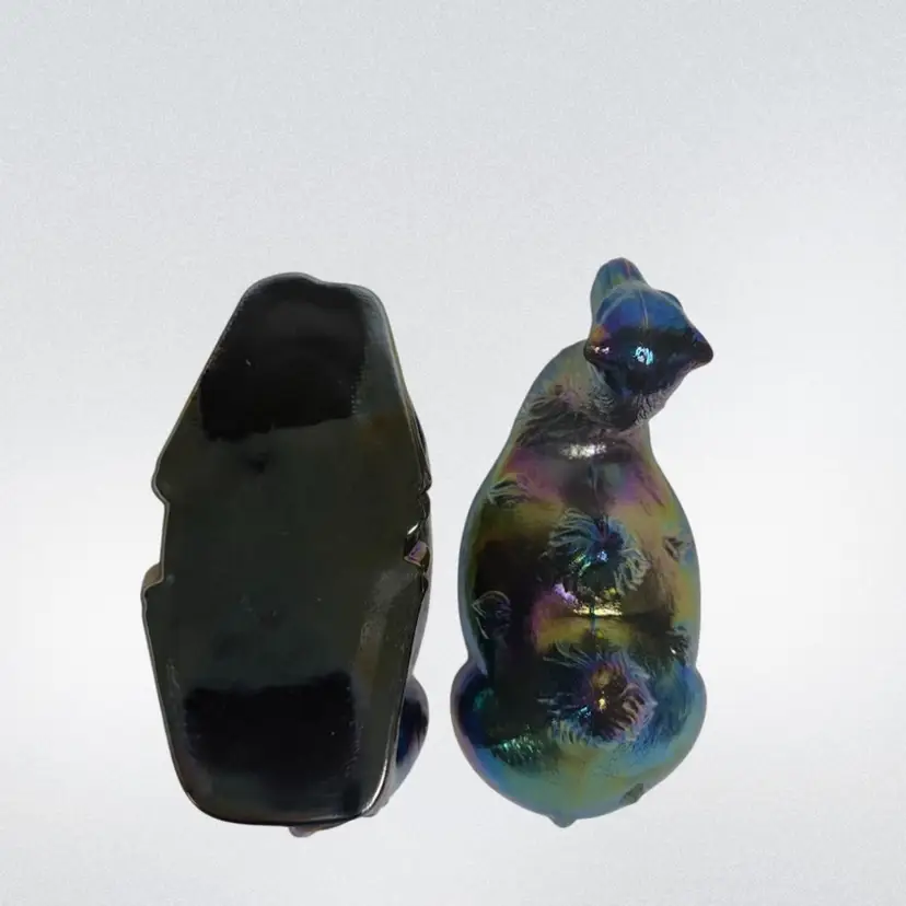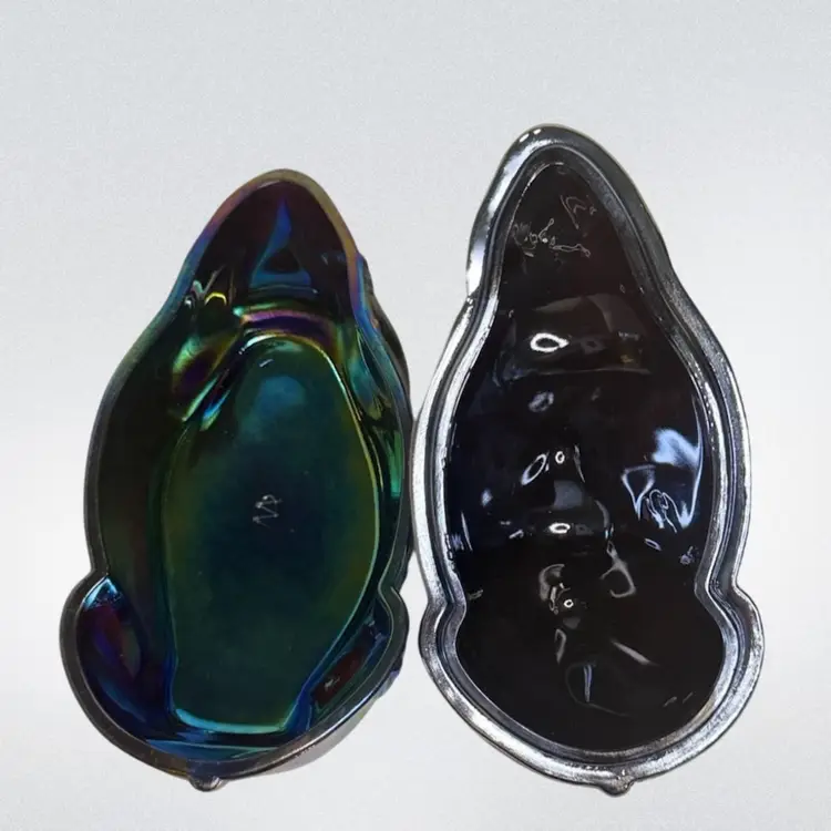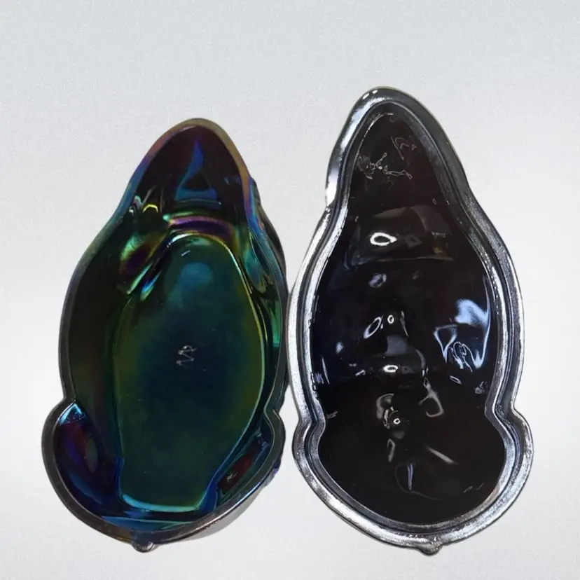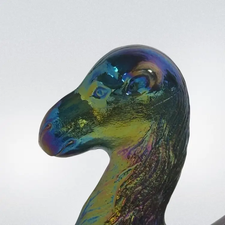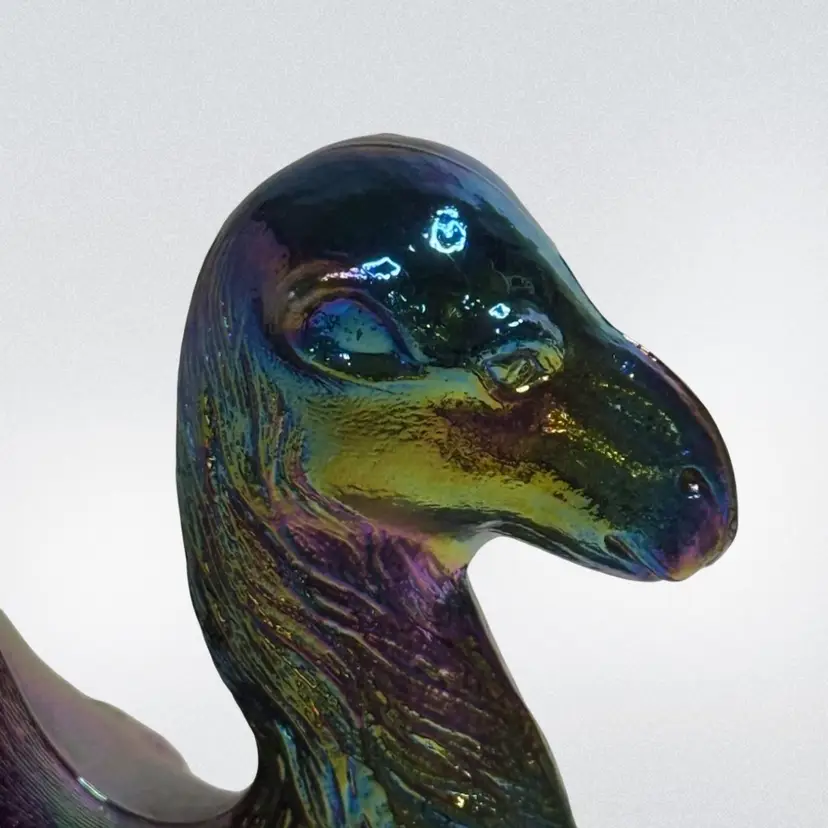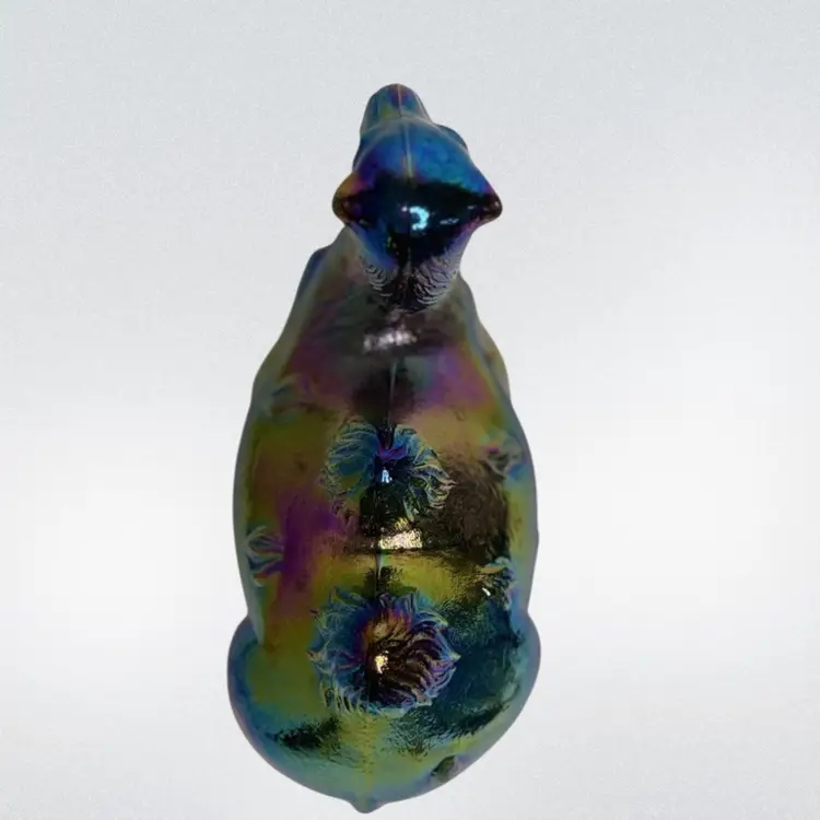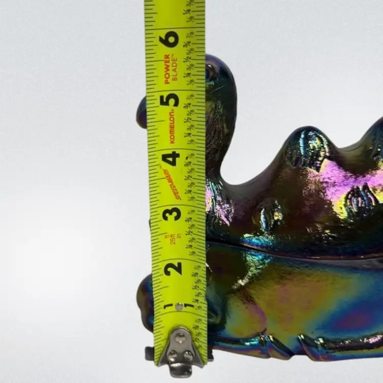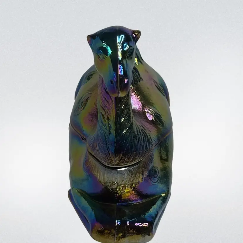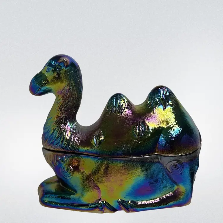 This stunning covered dish is a must-have for any collector of decorative glassware. Westmoreland's Humphrey Camel Covered Dish is in a rich purple and blues with a mix of magenta, gold-metallic sheen.