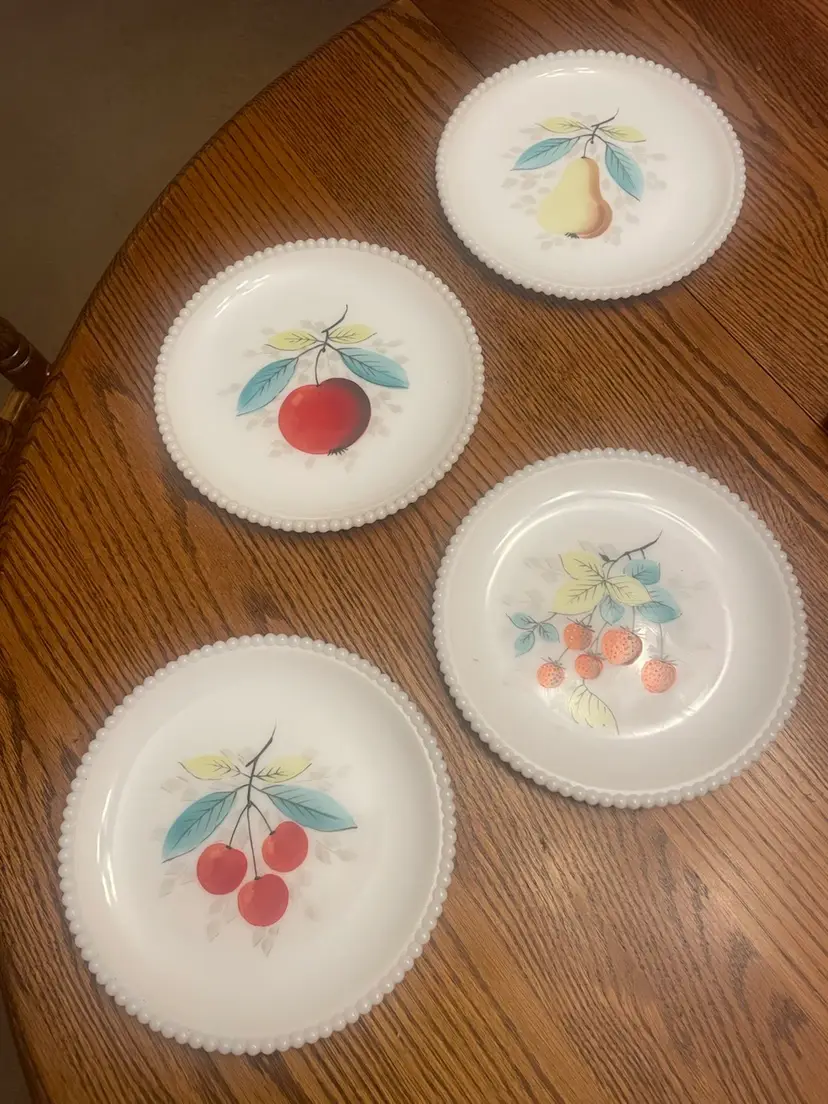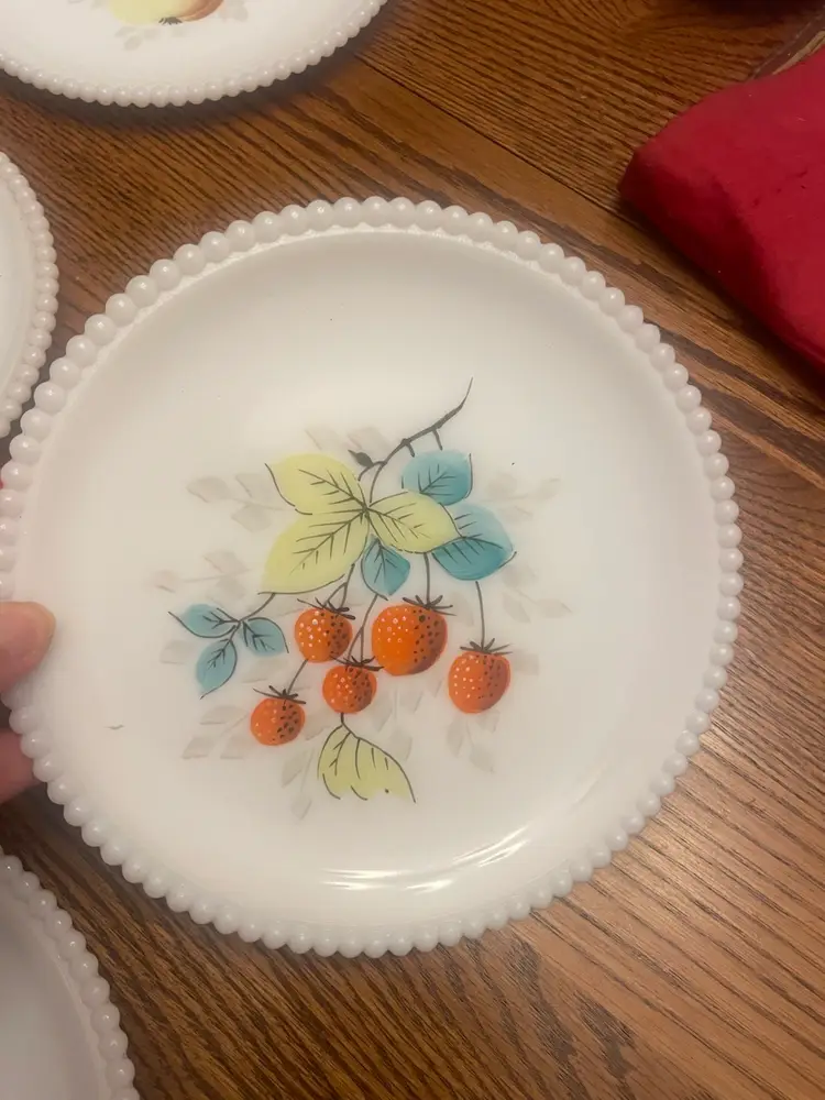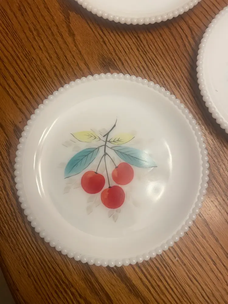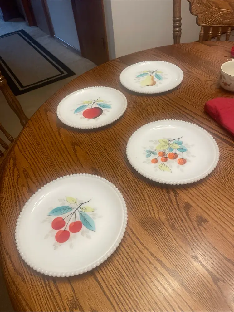 Dairy clean, set no chips, crack features, cherries, pair, apple and strawberries. The place you see in the picture are the plates you will receive