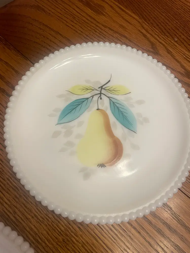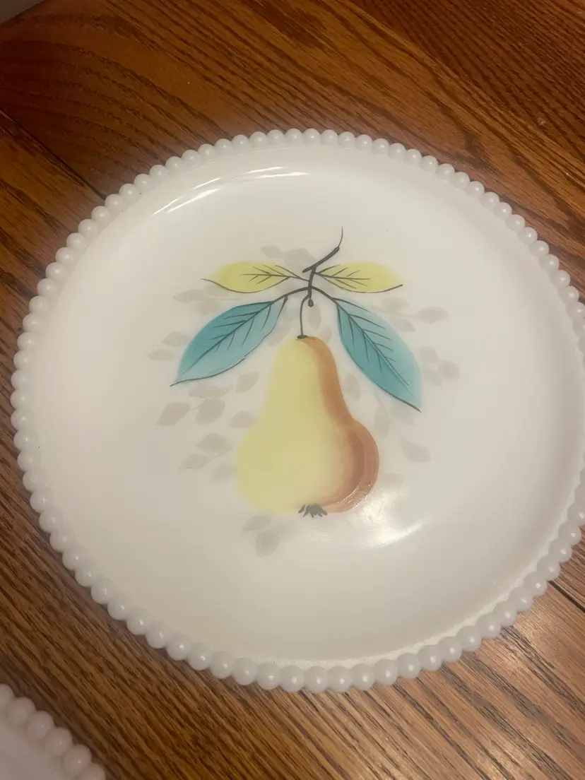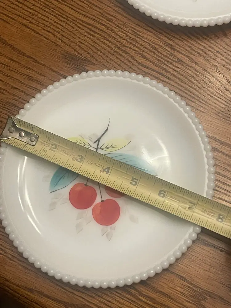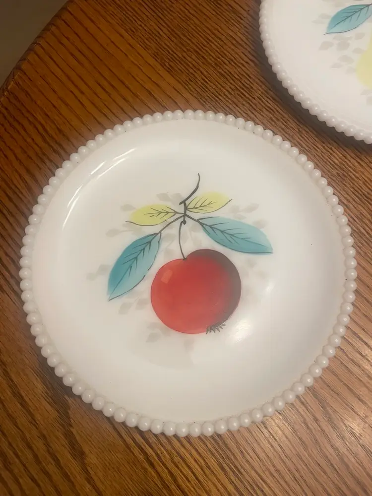 Dairy clean, set no chips, crack features, cherries, pair, apple and strawberries. The place you see in the picture are the plates you will receive