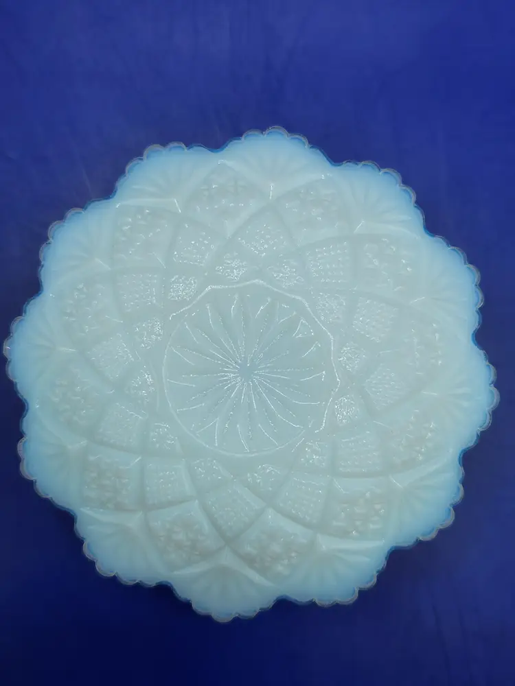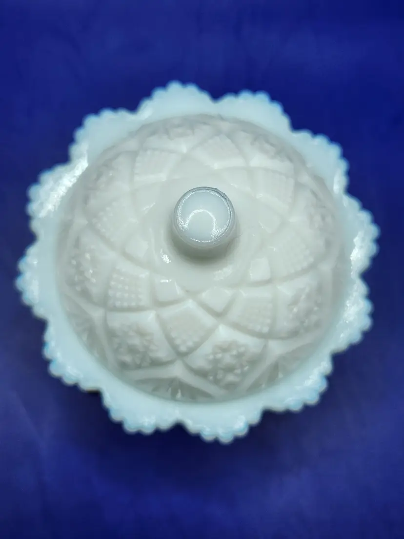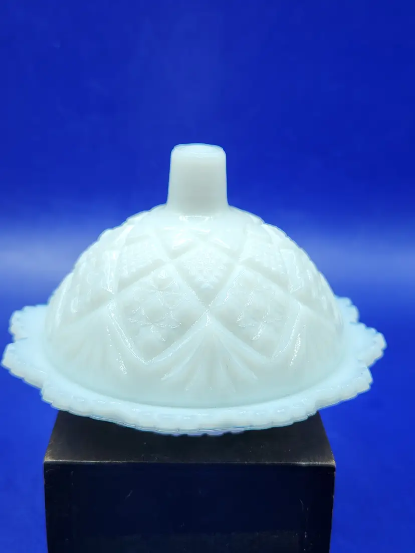 Westmoreland Milk Glass Butter Pat Dish Thumbalina pattern (?) Bottom shallow dish with domed lid Measurement 2 1/2 inches tall 3 1/2 inches bottom dish No chips or cracks