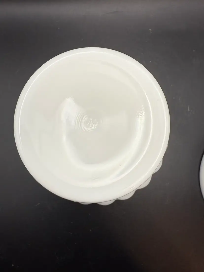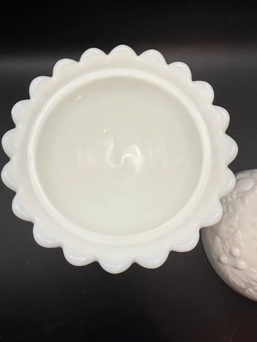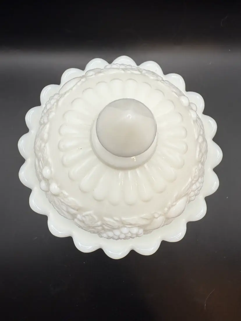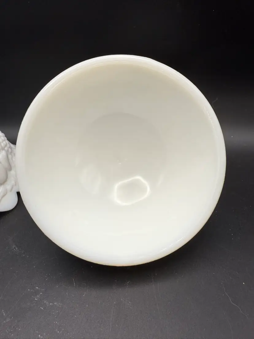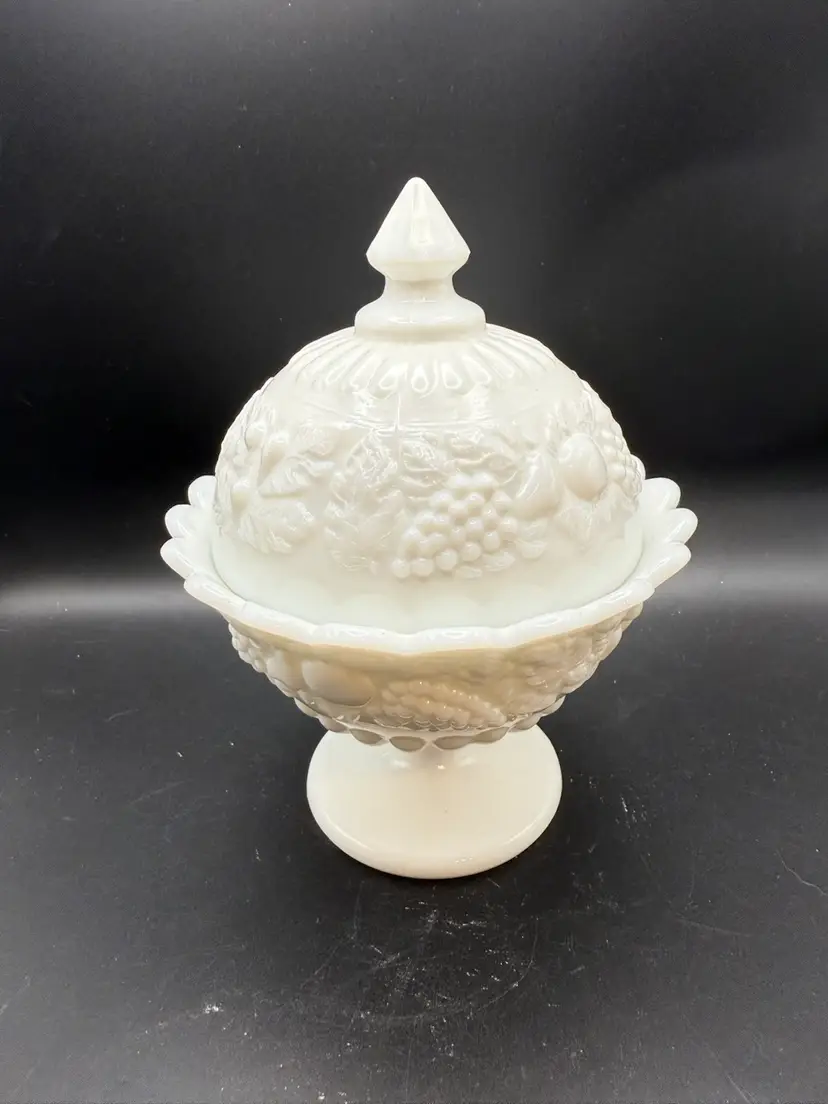 Westmoreland Specialty Company was a prominent American glass manufacturer, established in Grapeville, Pennsylvania, in 1889. The 'Della Robbia' pattern, named after the famous Italian Renaissance sculptor, is characterized by its rich, detailed relief work depicting fruits, grapes, and foliage. This particular pattern was popular in the mid-20th century, especially for serving pieces like candy dishes, compotes, and butter dishes. The use of milk glass, with its opaque white finish, enhances the three-dimensional quality of the embossed designs, giving them a sculptural appearance. These pieces are sought after by collectors for their aesthetic appeal and nostalgic charm.