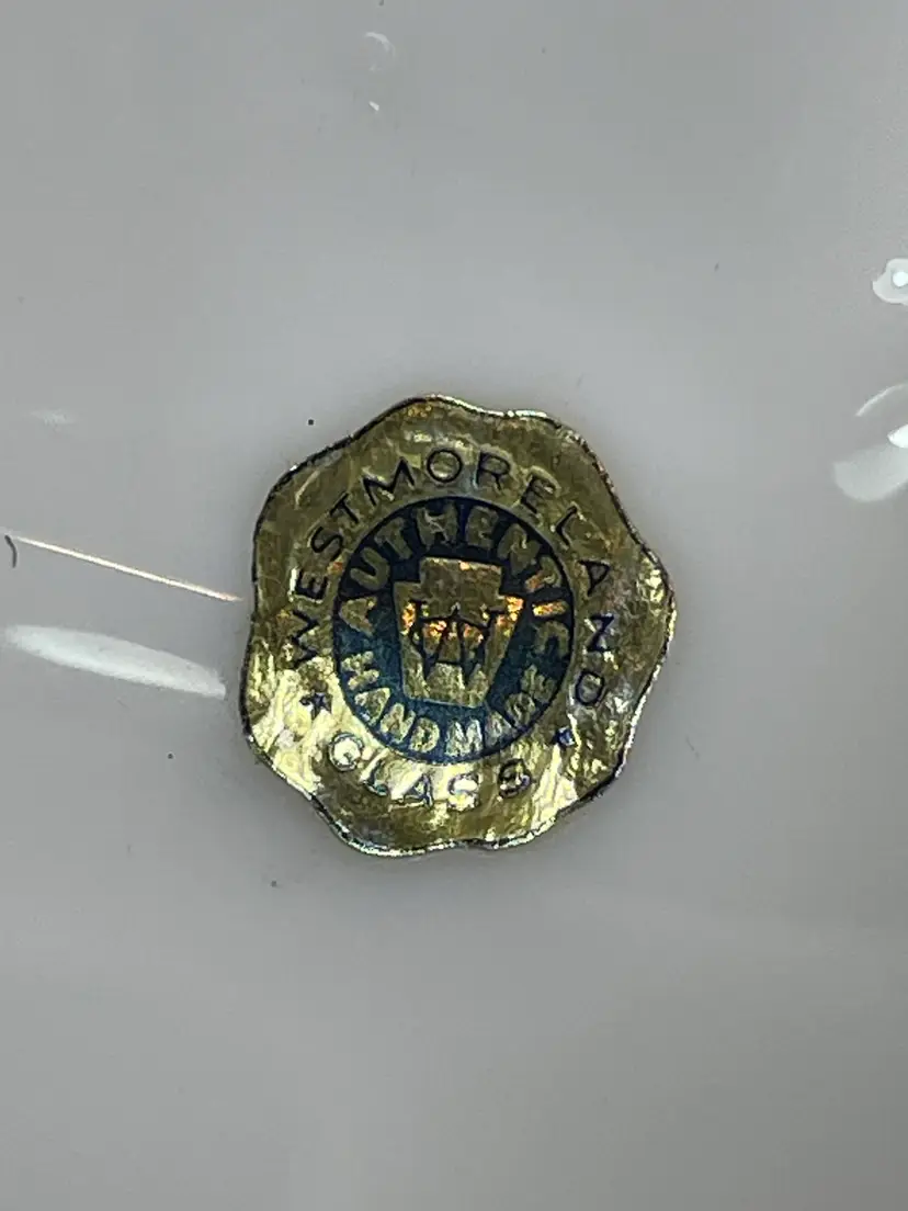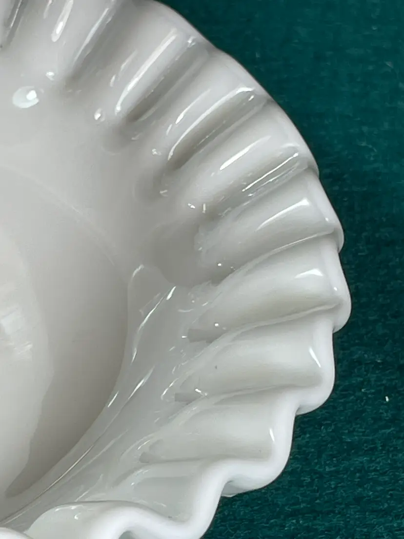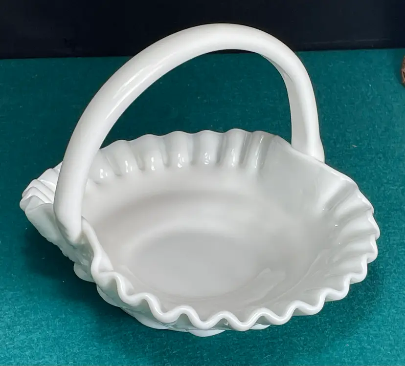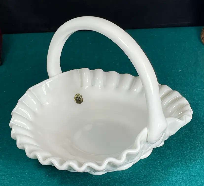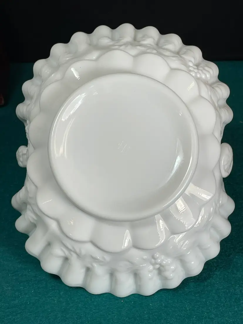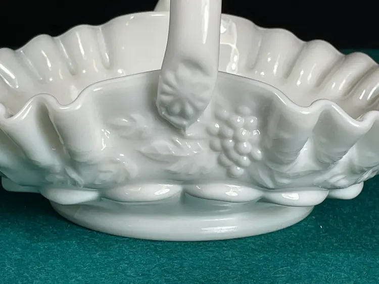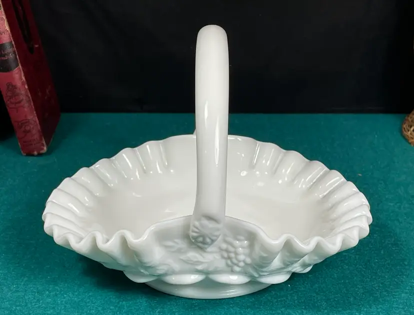 A very nice, Westmoreland milk glass, footed basket with embossed grape pattern, ruffled, crimped edge, and applied handle. Has original sticker. Measures approximately 8" wide, x 6-1/2" deep x 6" tall.