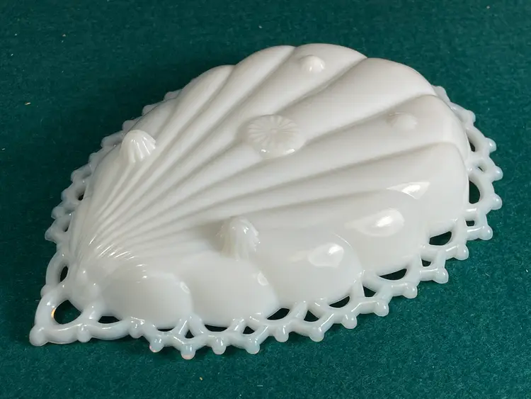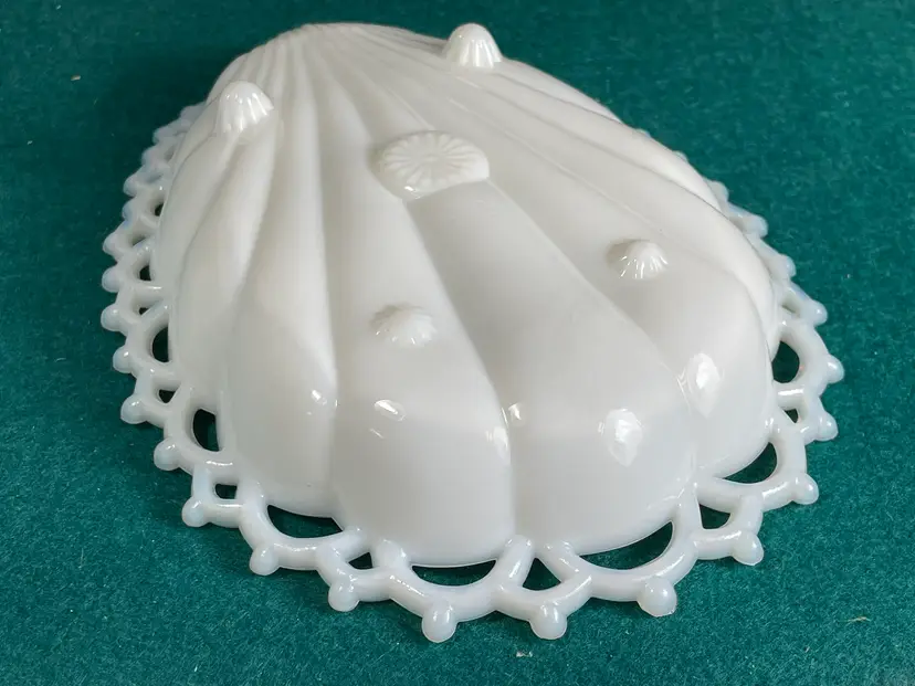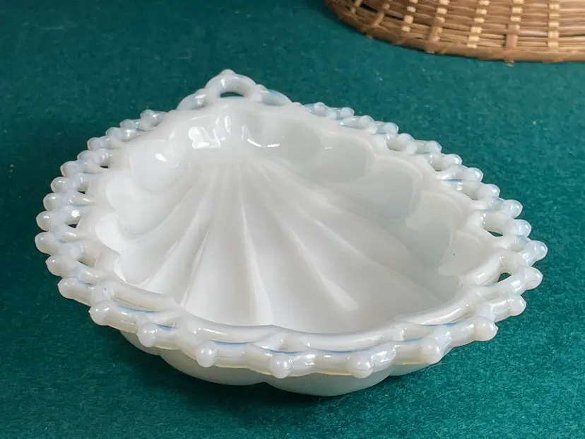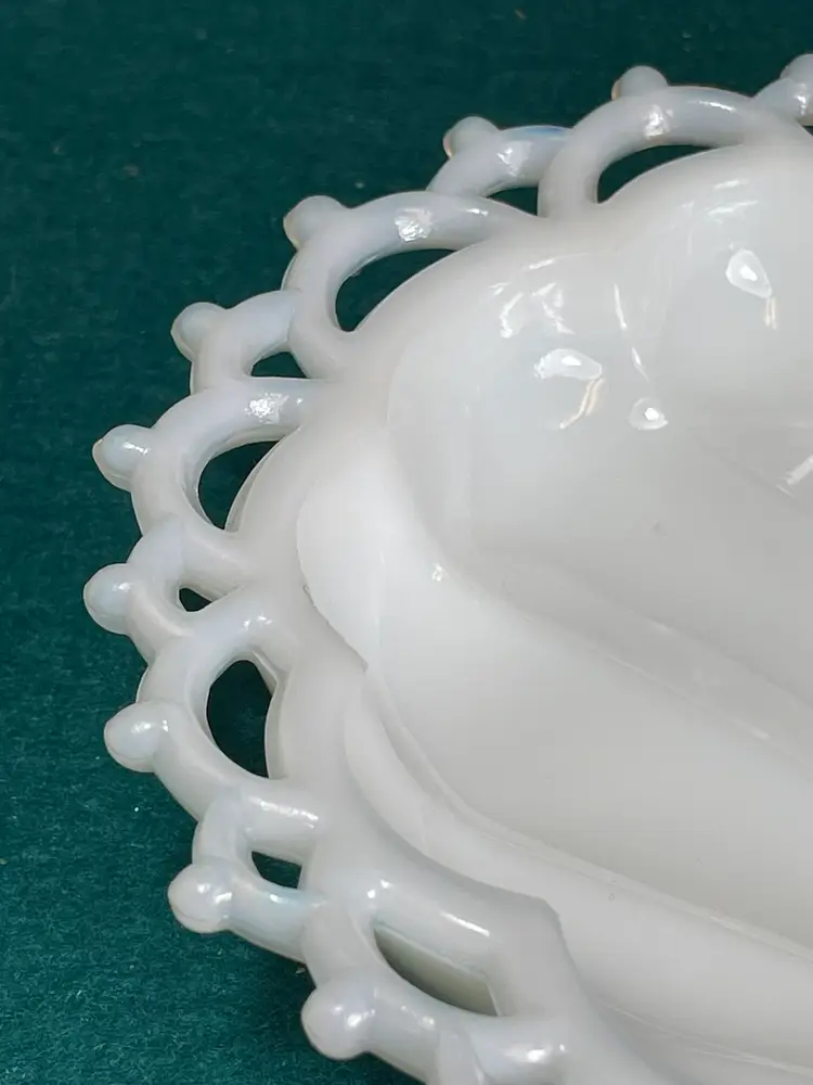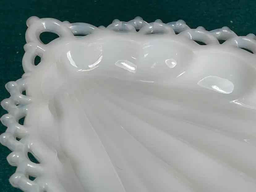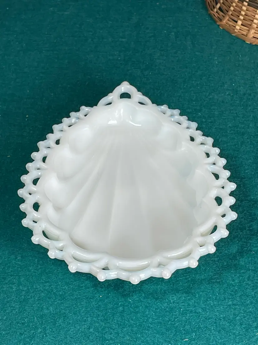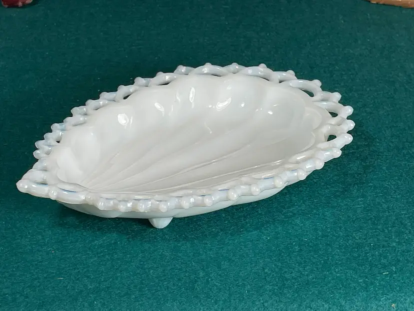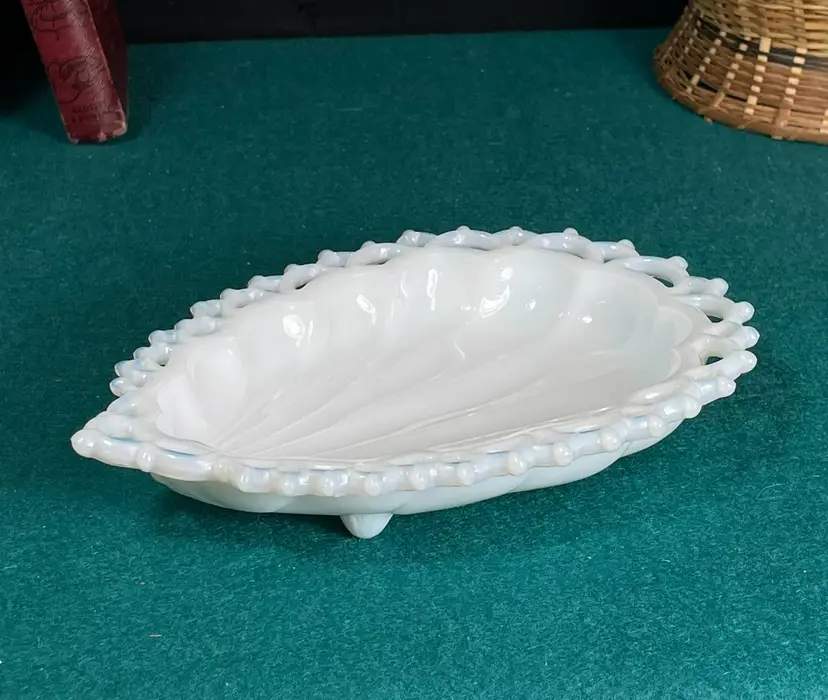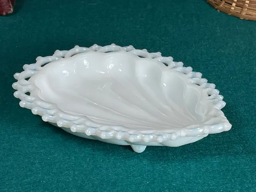 A very nice, Westmoreland milk glass, shell tray with reticulated lace top. Measures approximately 7-1/4" wide, x 5-1/4" deep x 1" tall.