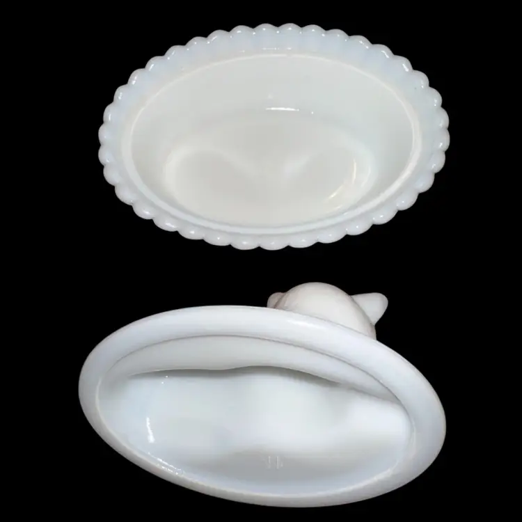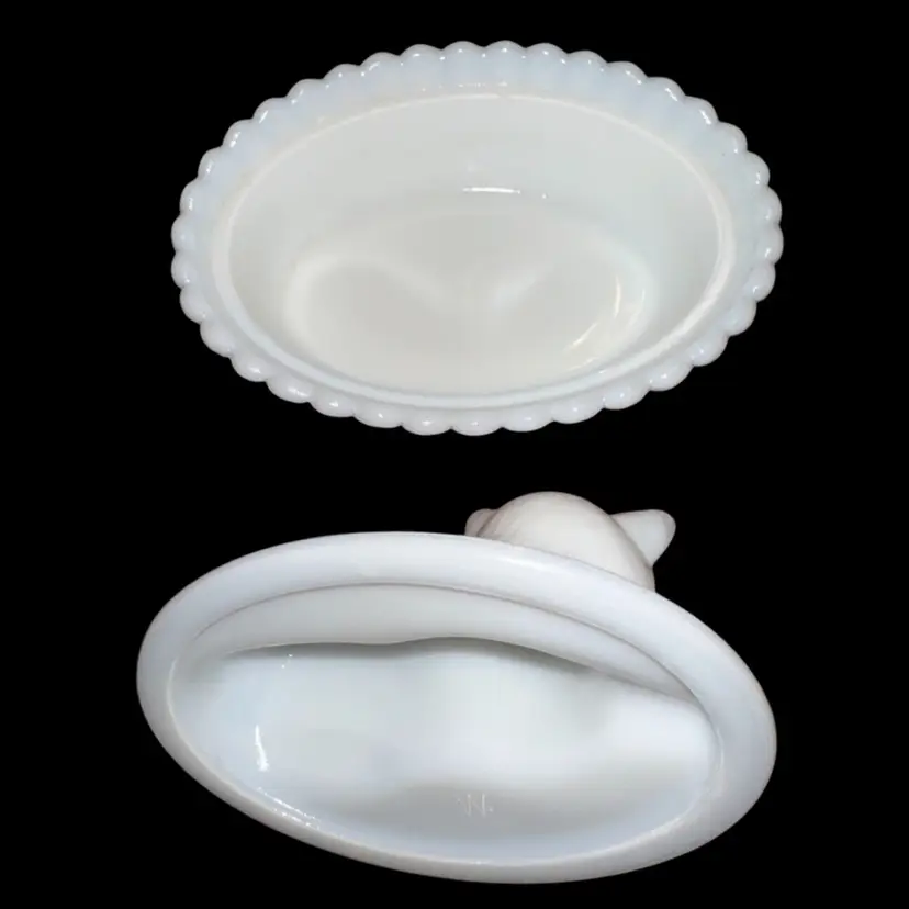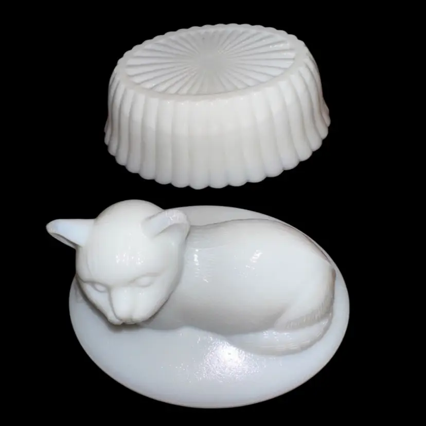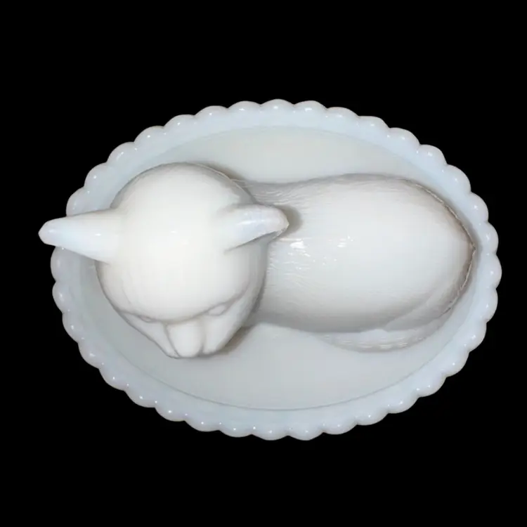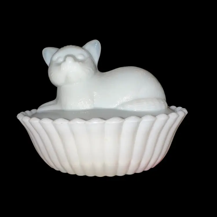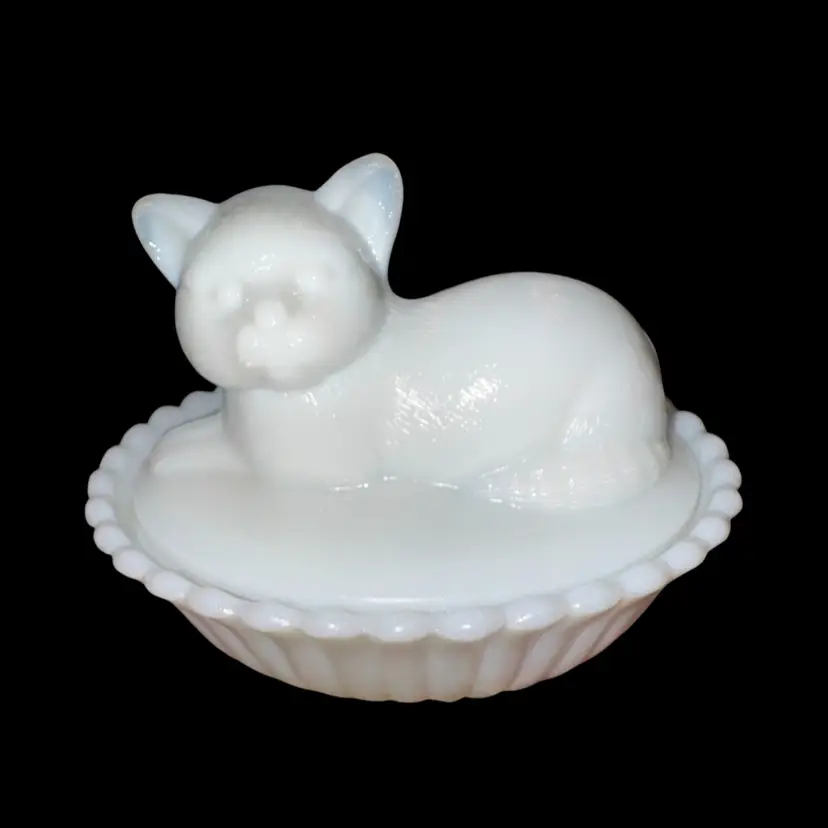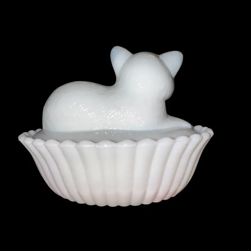 Westmoreland MilkGlass Cat In Basket Covered Dish 3.75-4” Tall X 5.5” Long X 4” Wide No issues - great condition!