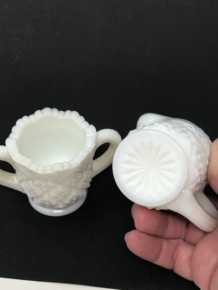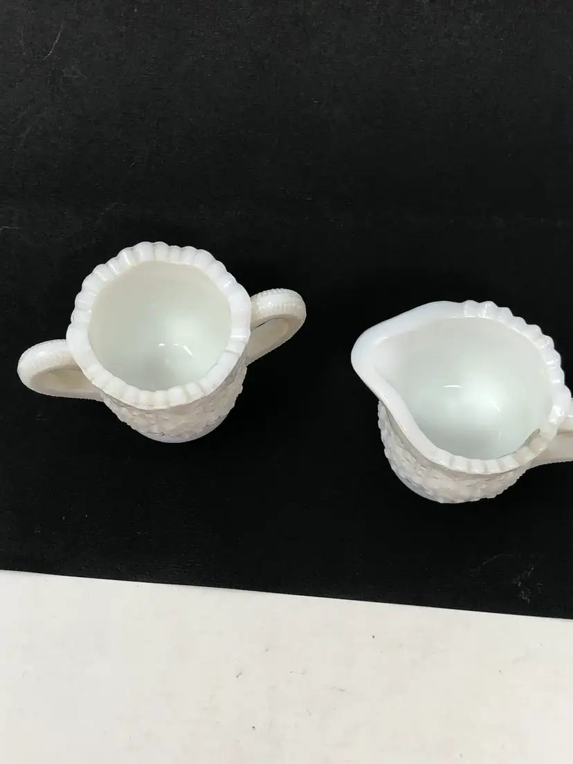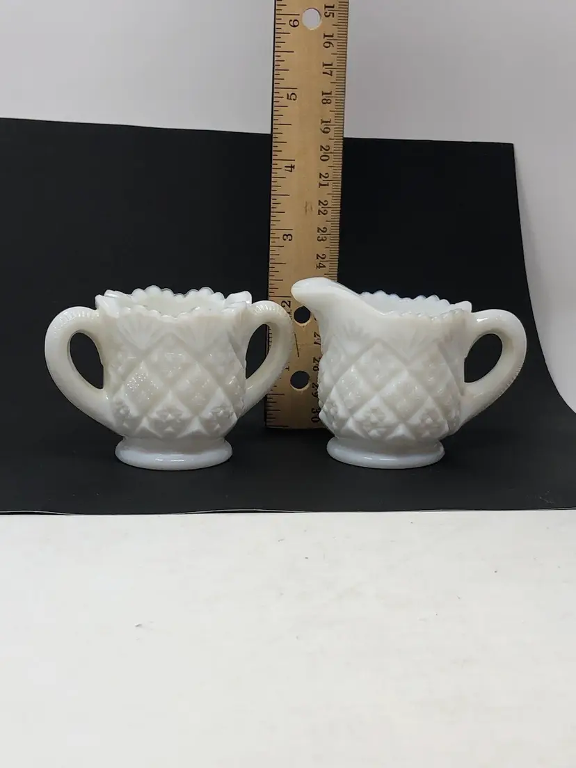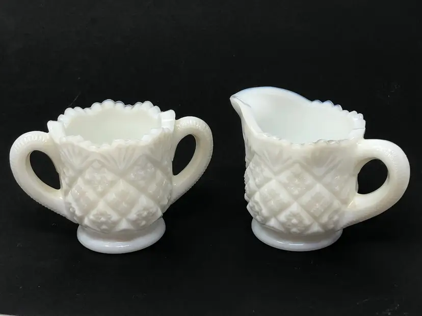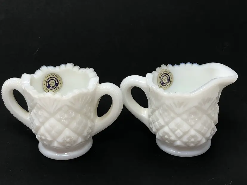 2-piece set includes a cream pitcher and open sugar bowl in quilted diamond pattern. 2 1/4" tall with original label, no chips or cracks