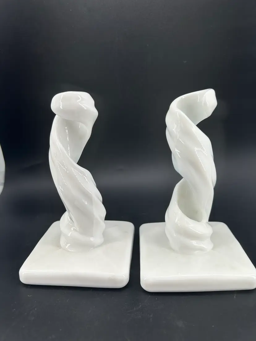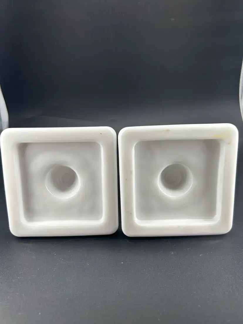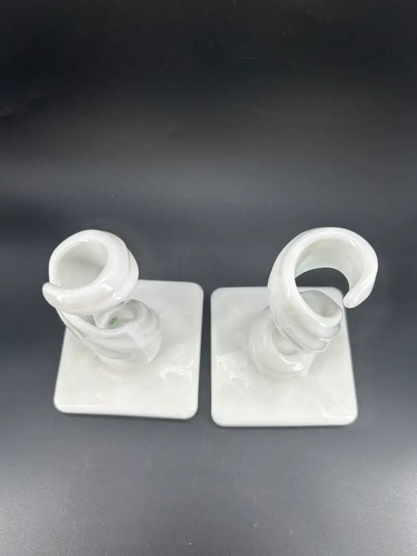 Elegant pair of twisted white milk glass candle holders by the Westmoreland Glass Company. Perfect for adding a modern touch to your decor. Each stands 6 inches tall. There are no chips or cracks.