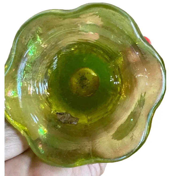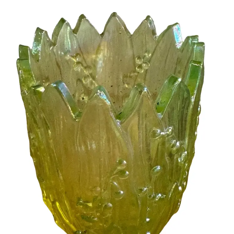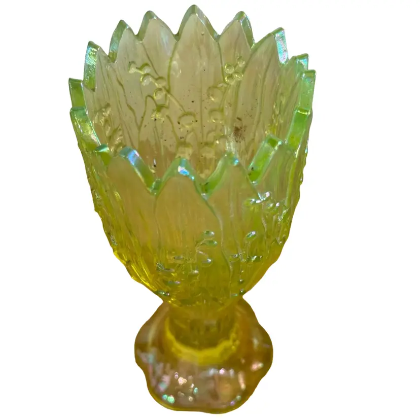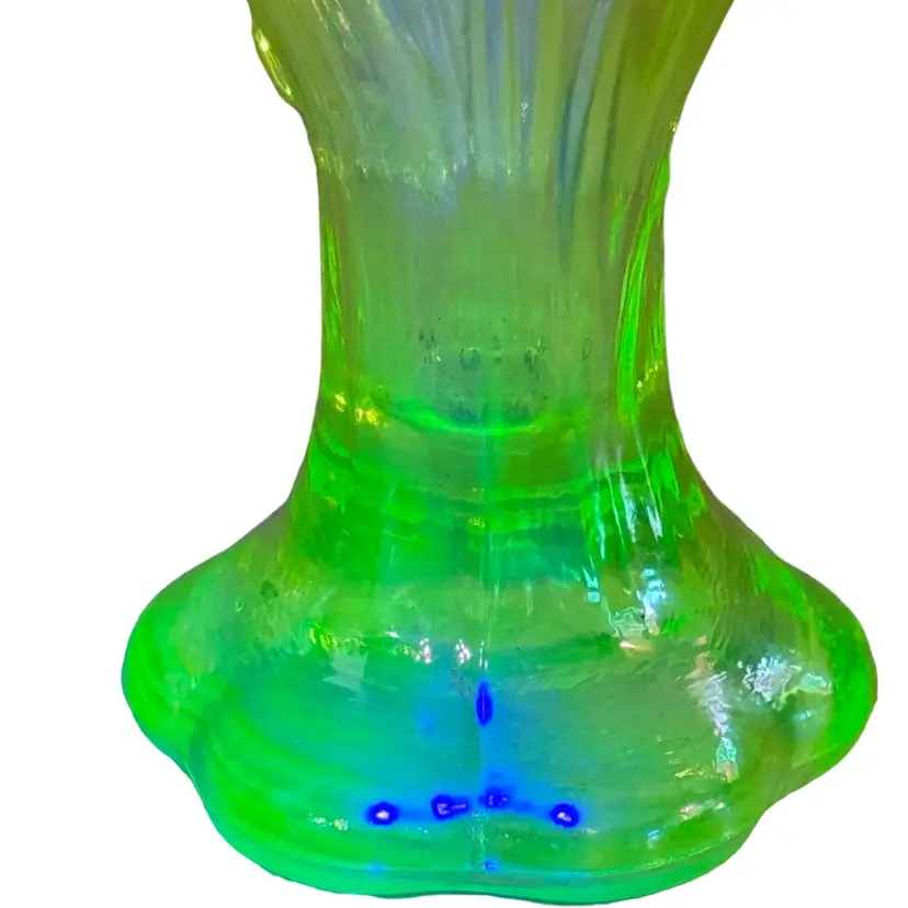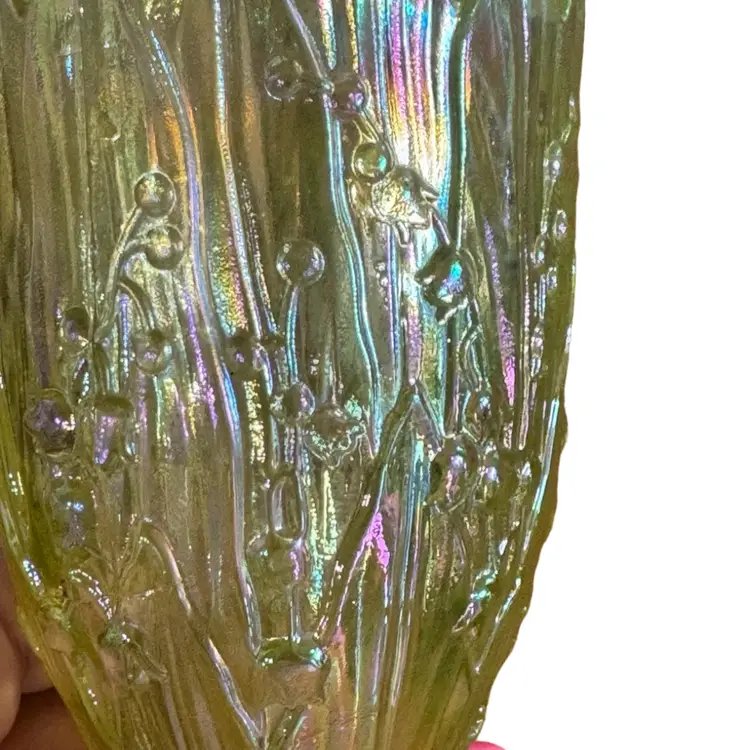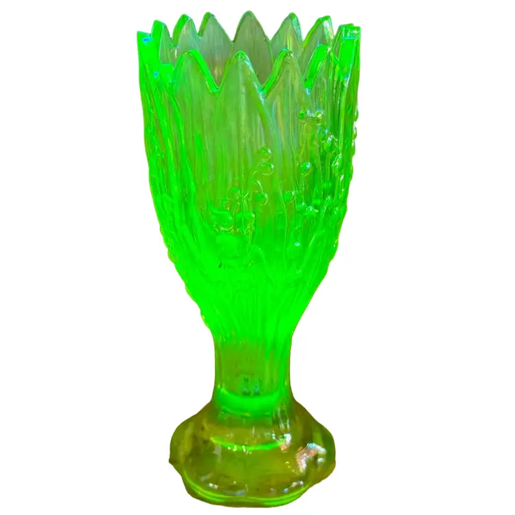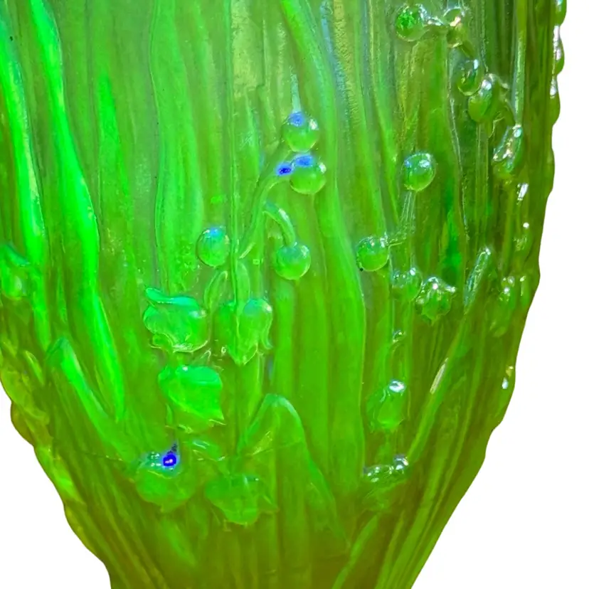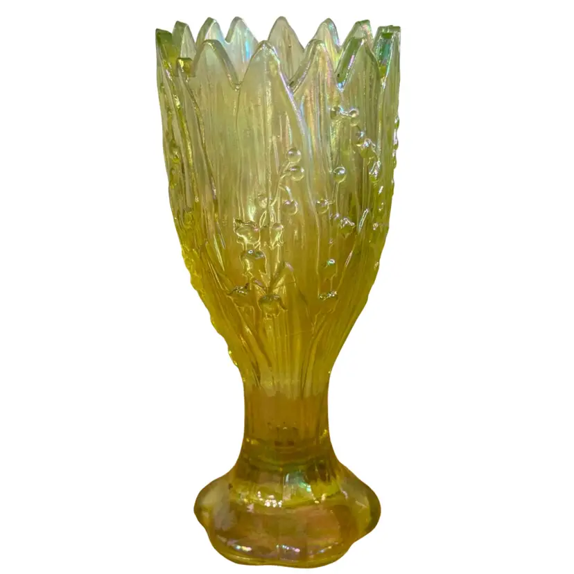 Description Westmoreland Vaseline glass vase in Lily of the Valley pattern, iridescent sheen. 7 1/2" high. Excellent condition. Beautiful glow!!