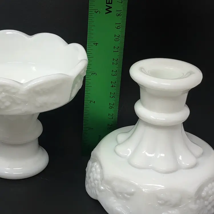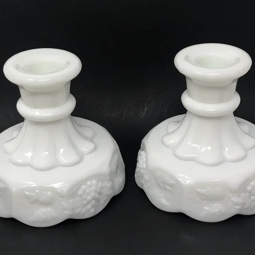 4" candle holders milk glass grape pattern. Westmoreland mark inside large end. Sold as a pair. No chips or cracks