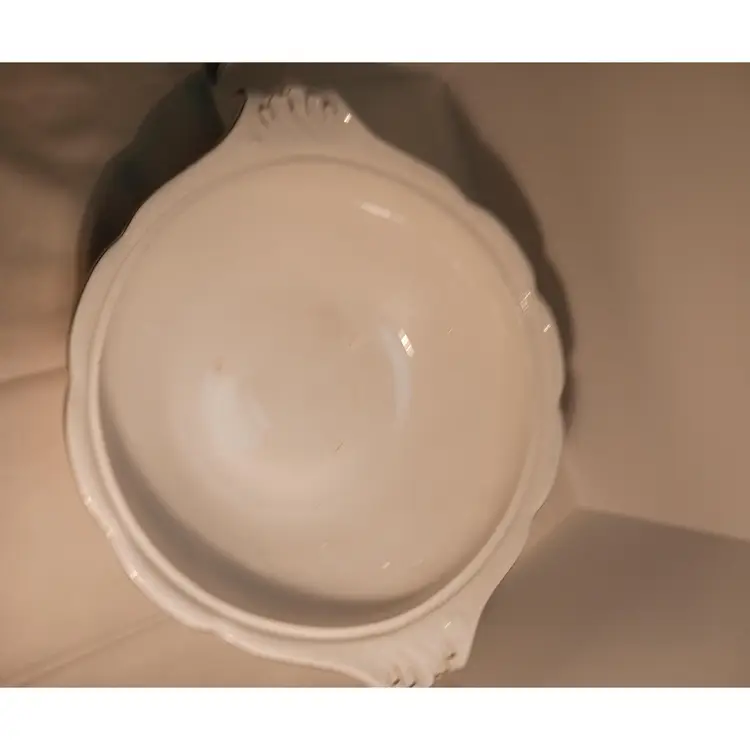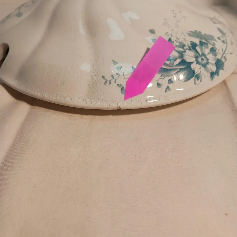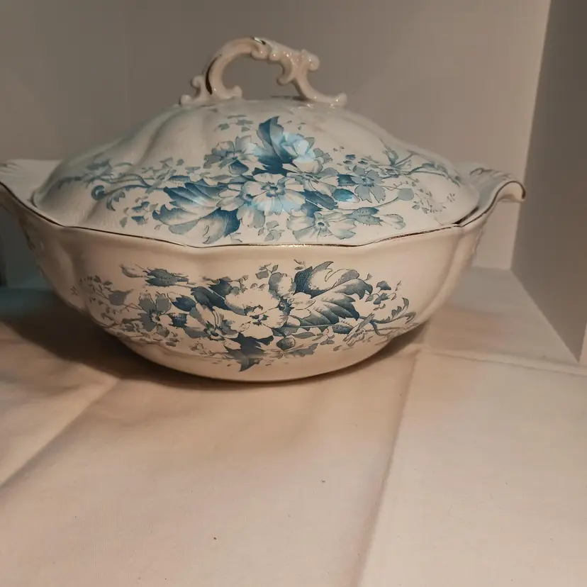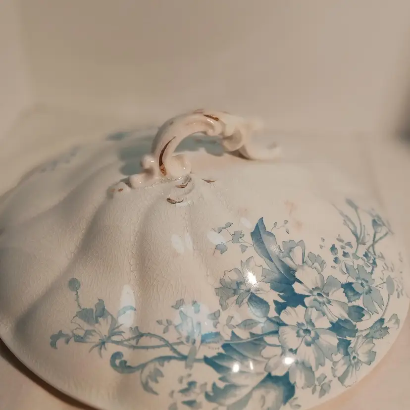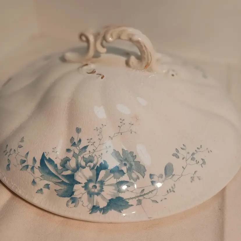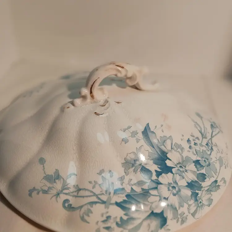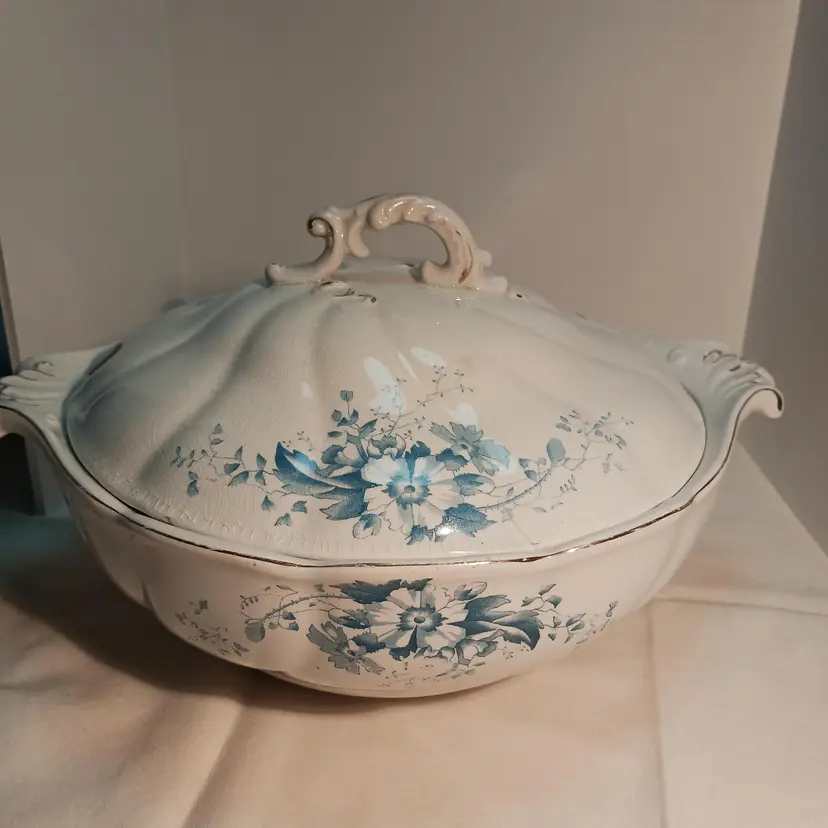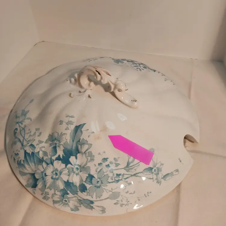 Marked on bottom: Semi-porcelain W.H.Grindley ACP England Also marked PRIMUL on bottom C1900 Measures – width from handle to handle 11 ¾ inches – from front to back 9 ½ inches from top to bottom with lid 6 ½ inches Have photos with pink arrow showing damages. Small chip on outed back edge of lid, crack showing from inside and outside of lid, small stain marked on lid. Also a #10 stamped on inside of lid from manufacture.
