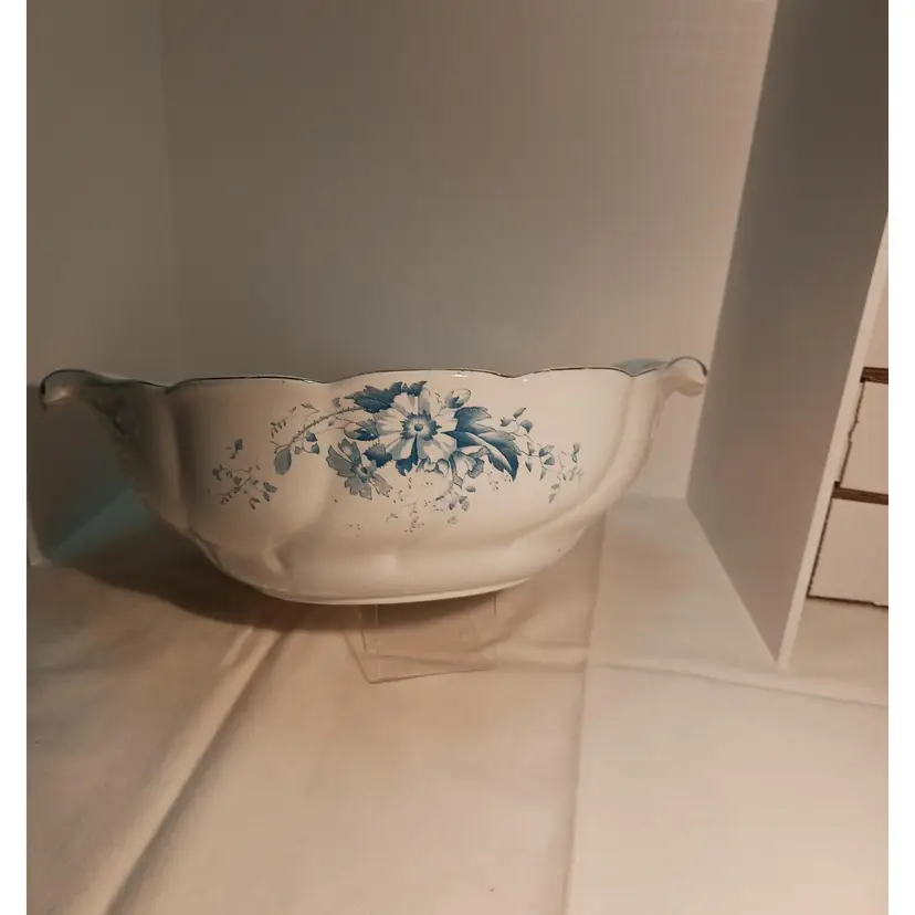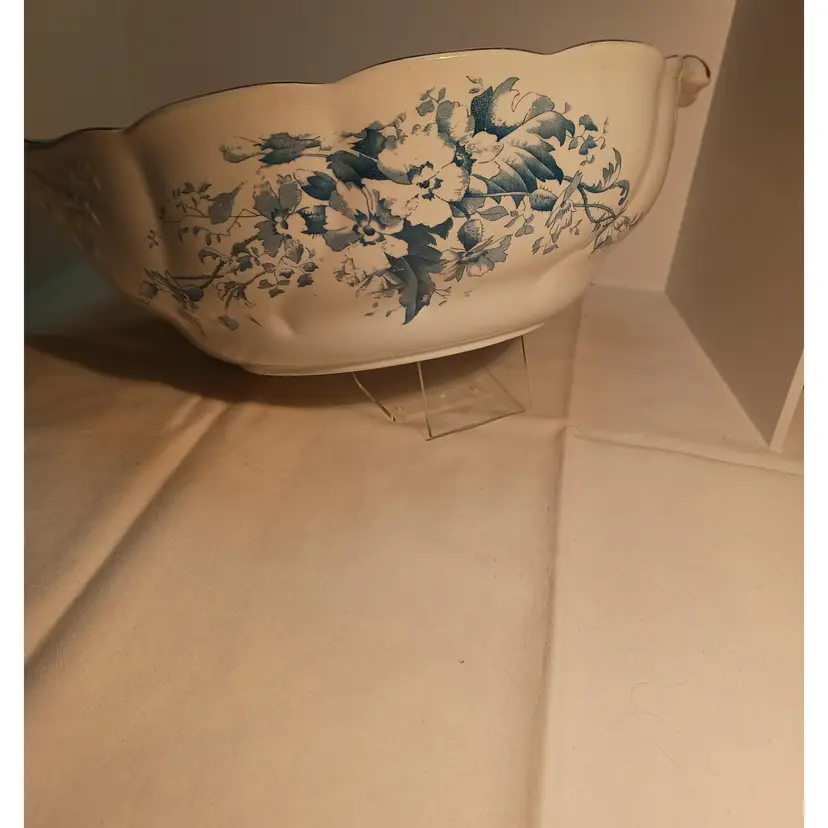 Ceramic/China Blue and White with Bachelor Button Flower motif with Gold Accent Trim.