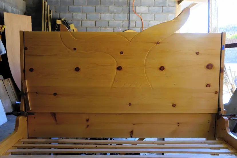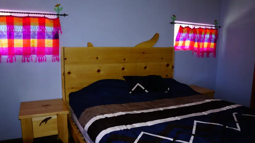King size Bed features a subtle carved outline of a whale and the nightstands follow the theme with hand carved Mesquite whales. All solid Pine with slats as supports. Most of my work is custom, made to order. If you would like a similar piece, contact me to discuss style, material, budget, ideas and shipping options.