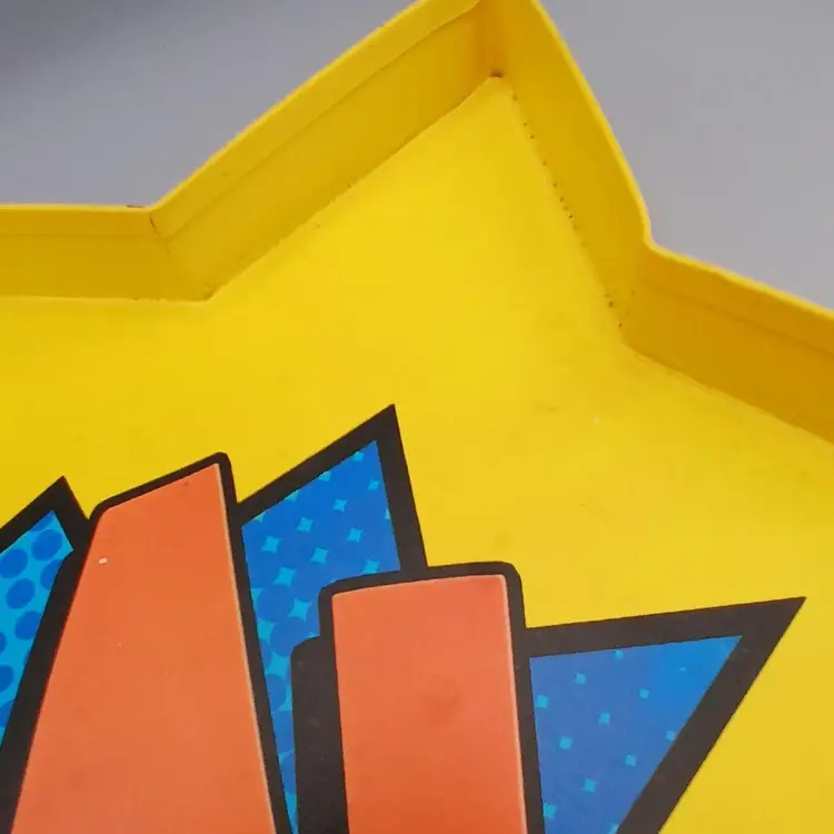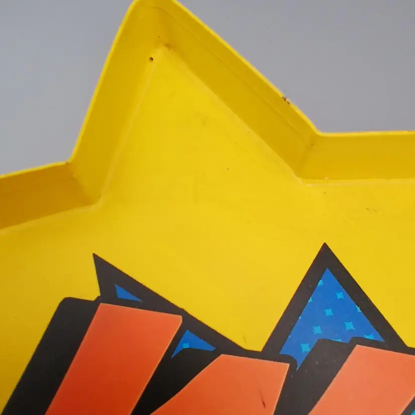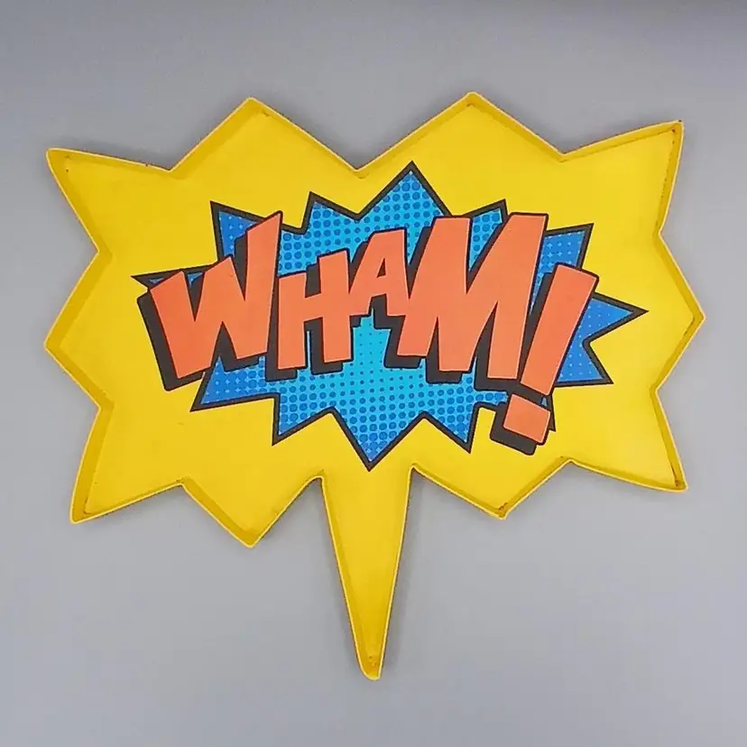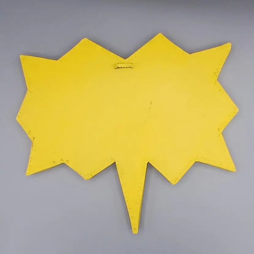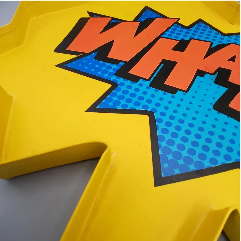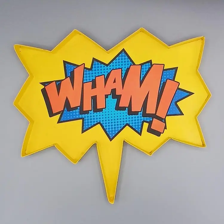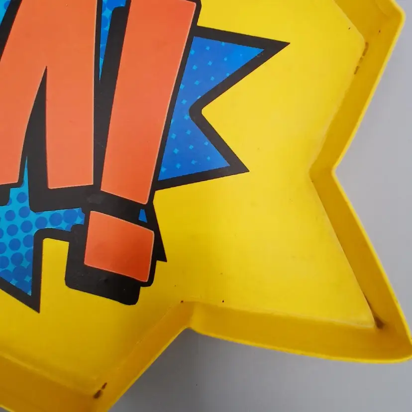 Some staining in the corners, may yet come out. I didn't want to try to hard and remove the paint. This struck me a just a fun and comfortable accent piece, Batman inspired onomotopeia. 12.9" x 11.5" x 5/8"