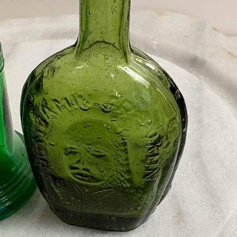 A set of two Wheaton vintage miniature glass bottles featuring a green color scheme. These reproduction bottles depict the Liberty Bell and Ben Franklin, adding a nostalgic touch to any collection. With an original design and no modifications made, these bottles are a unique and charming addition to any collector's display.