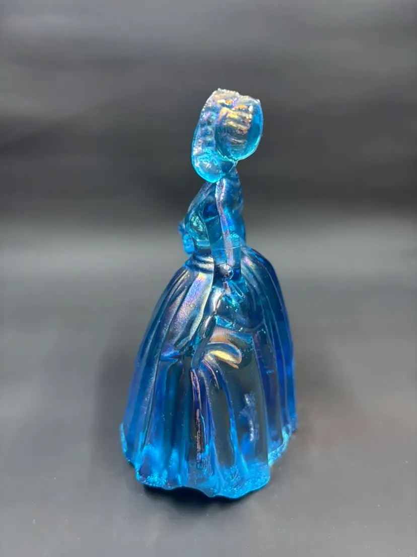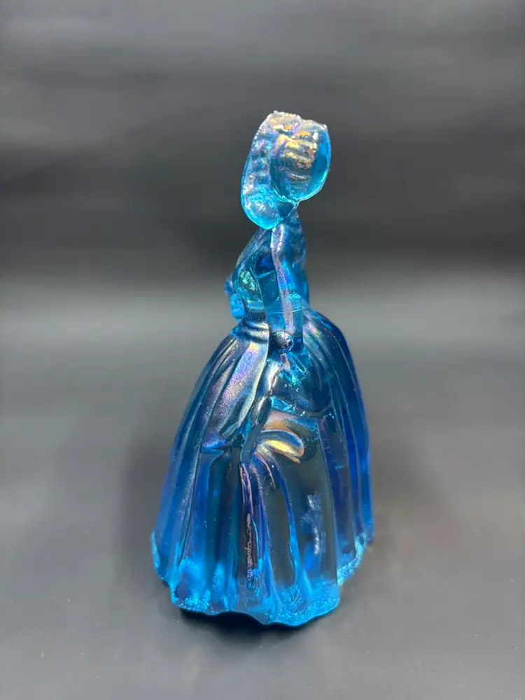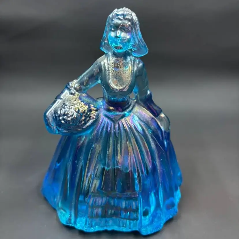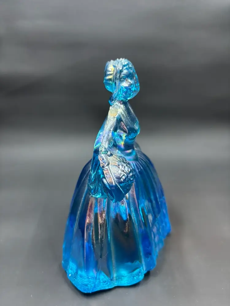 A pressed blue carnival glass figurine of a woman in a full, Victorian-style dress, often called a "Southern Belle" or "Colonial Lady". She is wearing a bonnet and holding a basket. The carnival glass treatment gives it a beautiful iridescent, rainbow-like sheen especially on the dress. At approx. 5.25" tall, this figurine is believed to be made by Wheaton Glass Co. as part of their revival of carnival glass from the 1970s. It is in excellent condition with no chips or cracks.