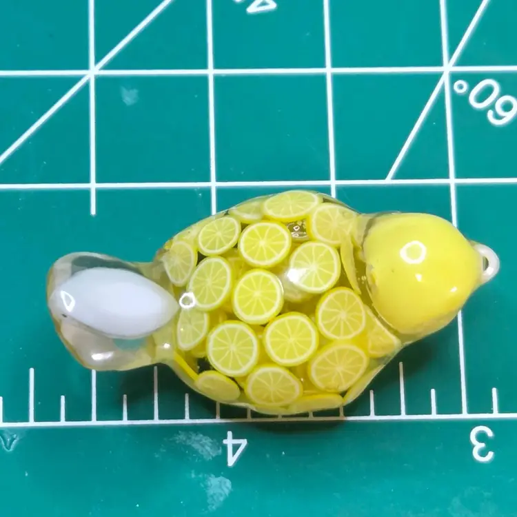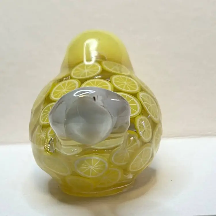 This gal is made made with a white seed bead beak, a yellow bead from my craft pile for her head, a tail feather made from a harvested bead from a necklace and her body is made from polymer clay lemon slices.