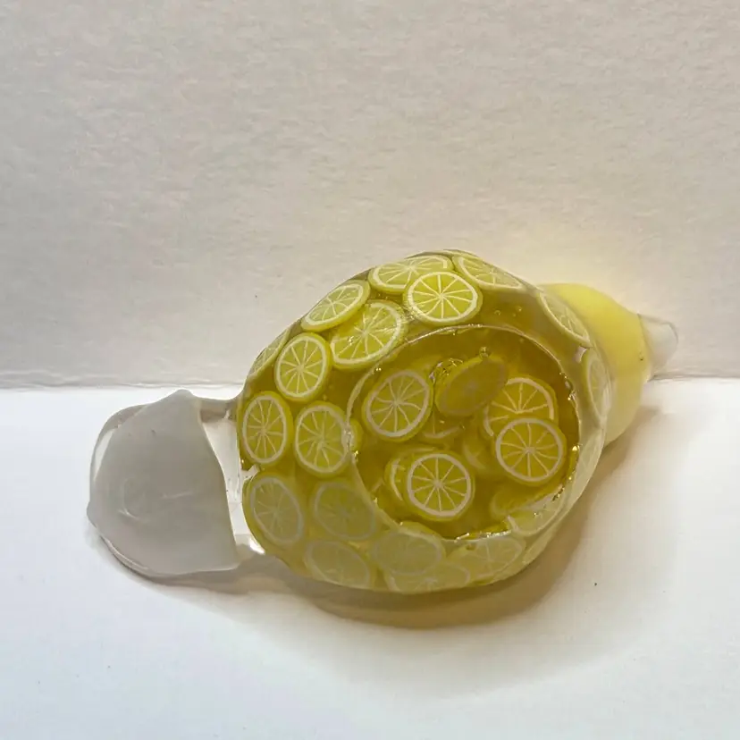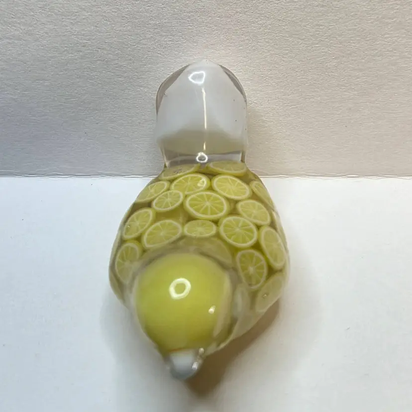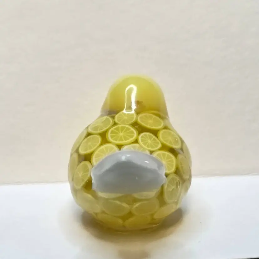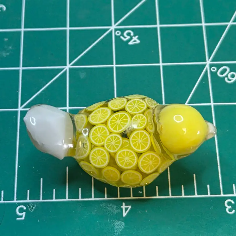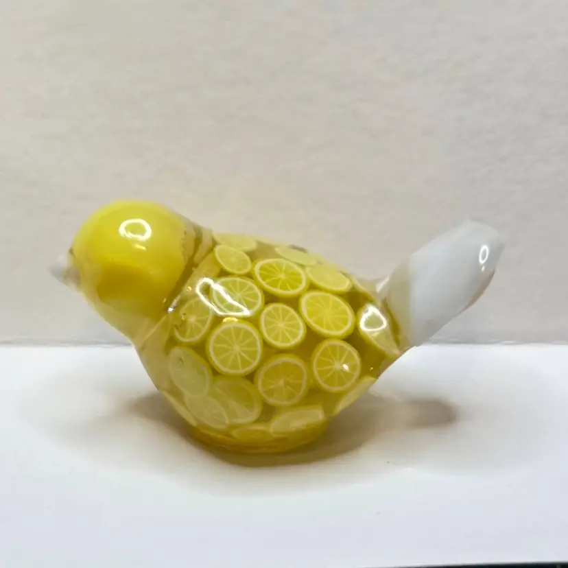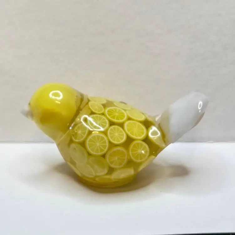 This gal is made made with a white seed bead beak, a yellow bead from my craft pile for her head, a tail feather I made from a cabochon mold. Her body is made from polymer clay lemon slices.