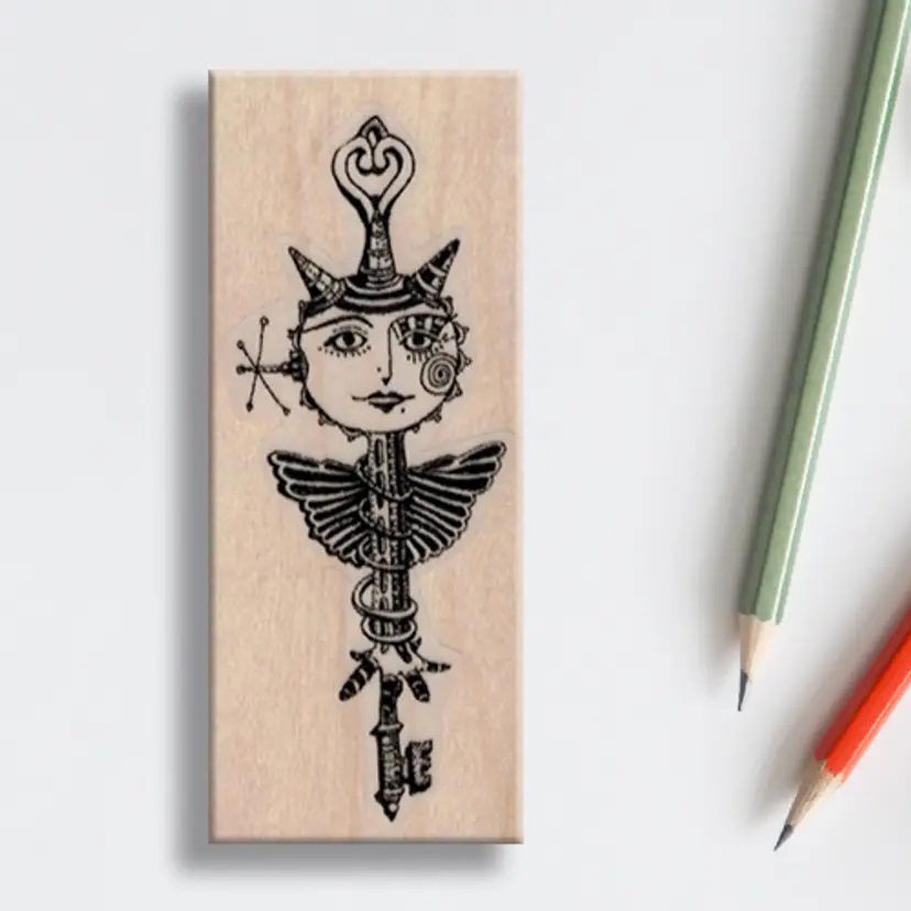 Whimsical Art Key Man Rubber Stamp Size: 1-1/2 x 3-1/1 Wood Mounted - Pink Rubber Brand new/unused • Great for creating backgrounds, junk journals, mixed media projects, collage, card making and tags. • First purchase on District? Use this code for $5 off a $10 min purchase. ALOHAG34