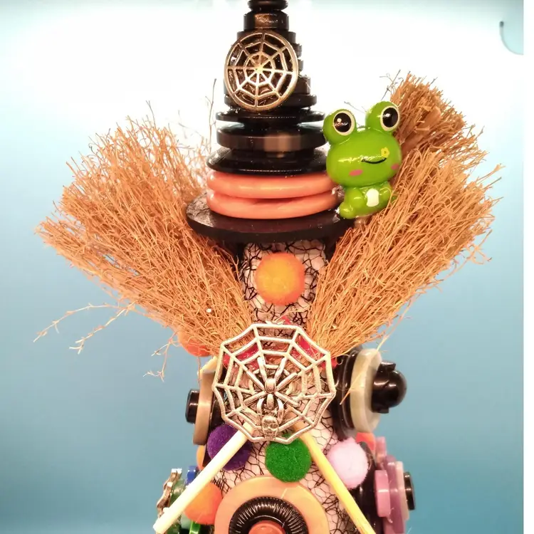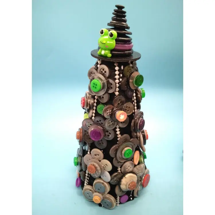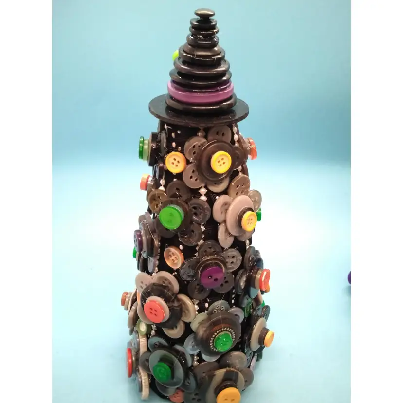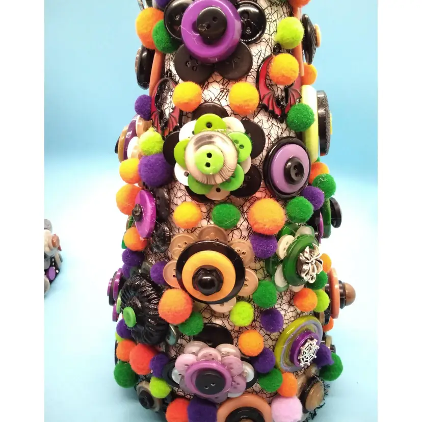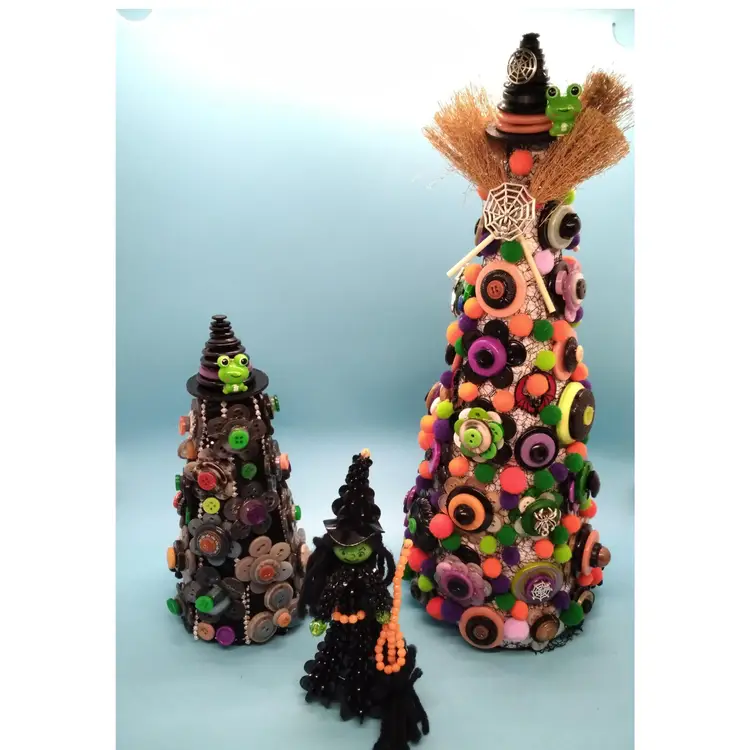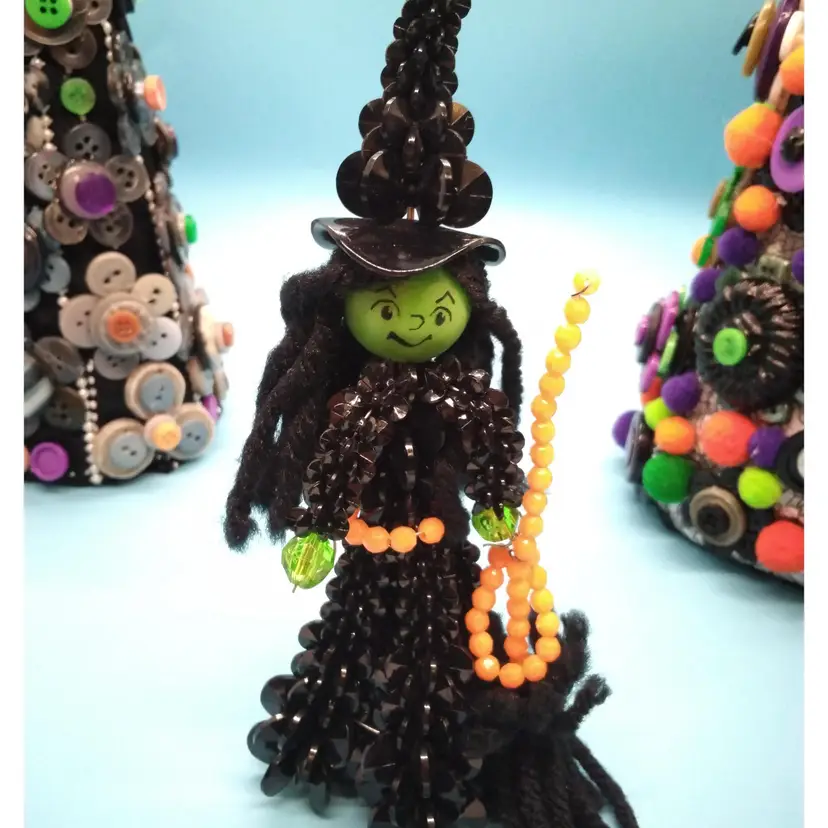 Add a touch of Halloween magic with these handcrafted button trees. Each tree is adorned with colorful Halloween colored buttons and topped with a playful witch hat also made of buttons. Halloween themed trinkets attached to the trees add to the whimsical theme. The small beaded green faced witch is the perfect size for the whole display to look amazing in any homes halloween decor.