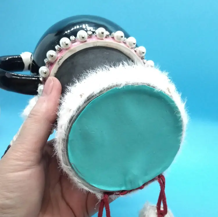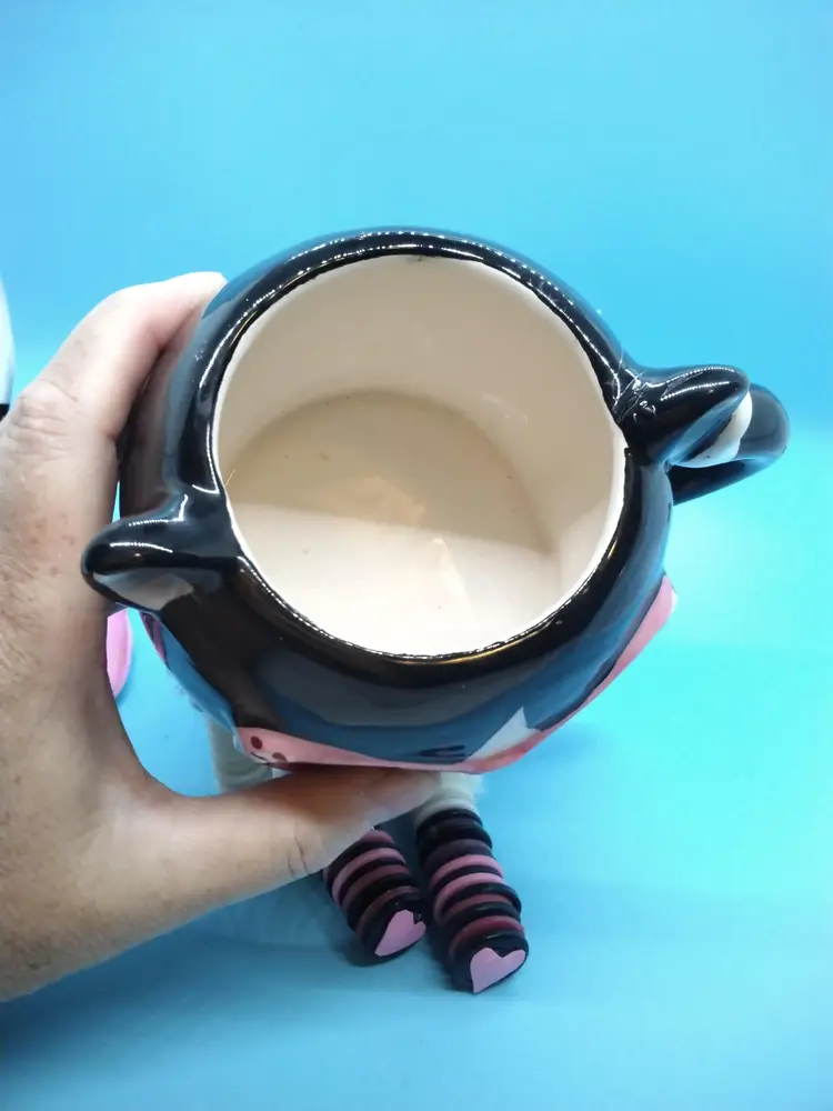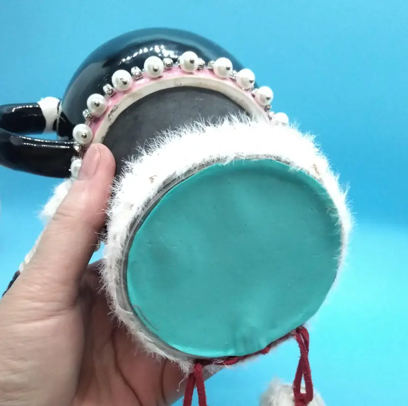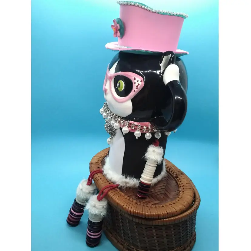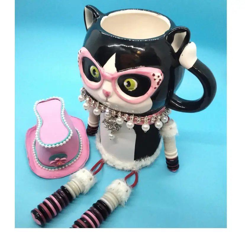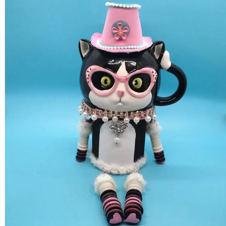 This whimsical cat mug shelfsitter is a delightful addition to any collection. Featuring a black and white cat adorned with pink glasses. I added a jeweled collar and tag, a body, four legs from vintage buttons, and a cute handcrafted hat. This mug is both functional and decorative. It has a secret with its design. It has two compartments that could be used as secret hiding spaces. Perfect for cat lovers and those who enjoy unique, quirky items.