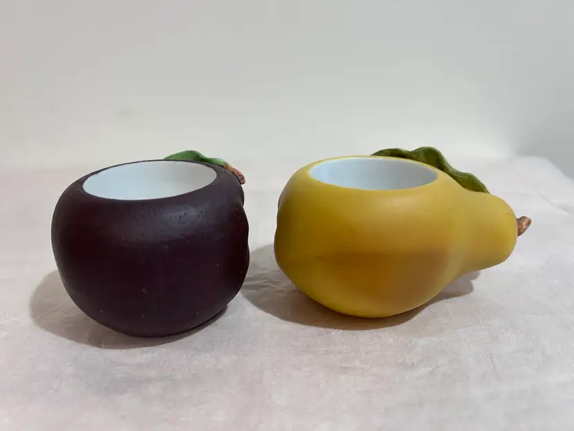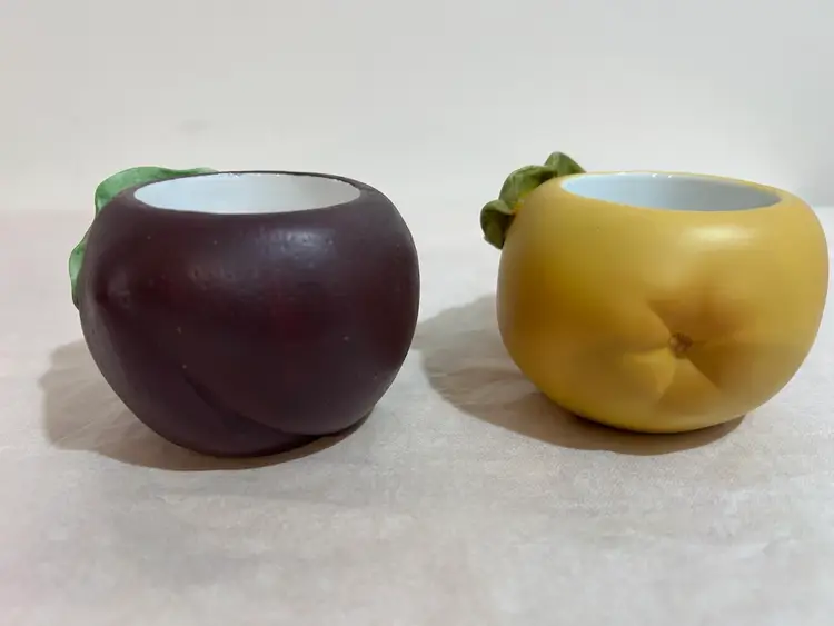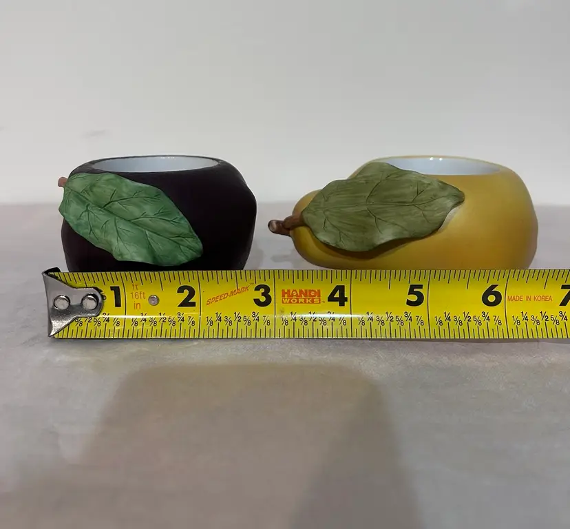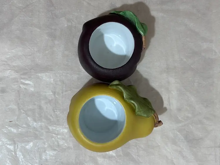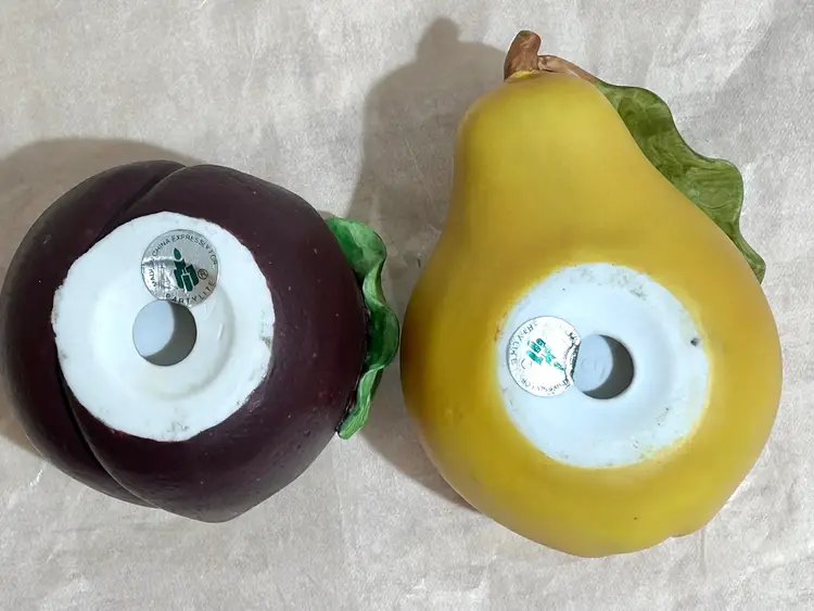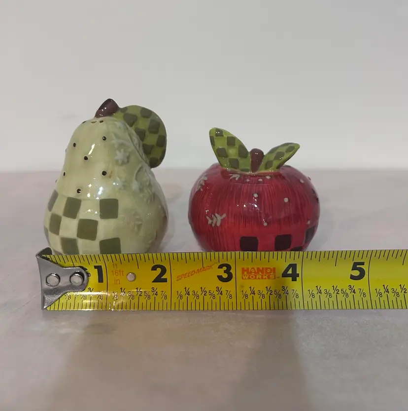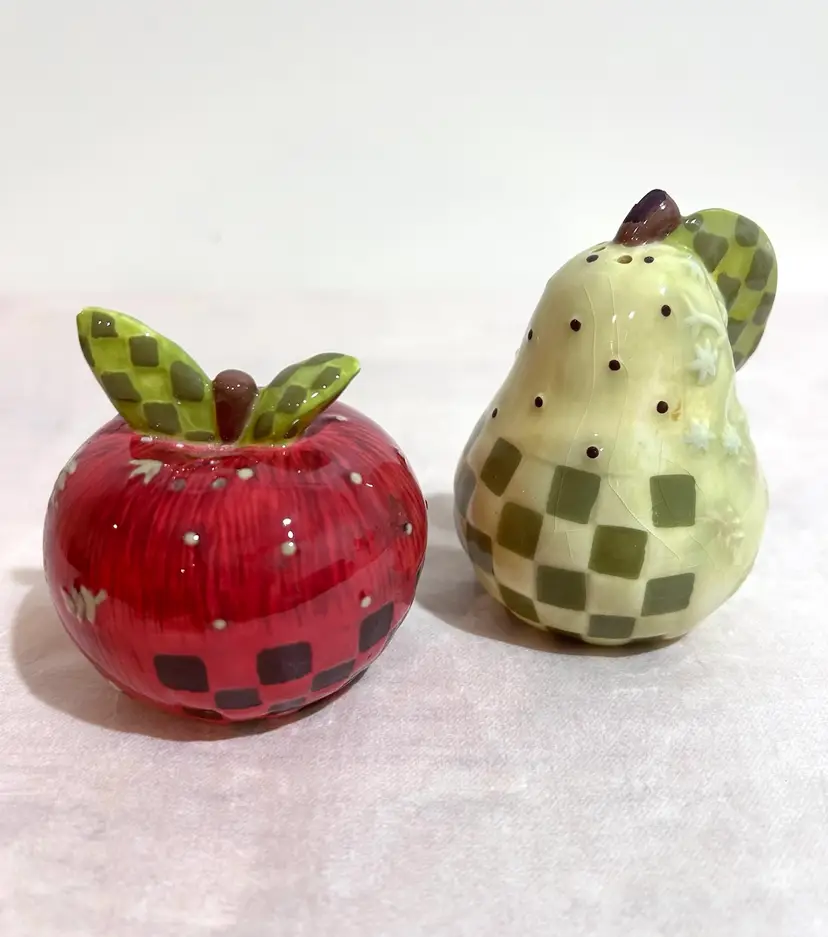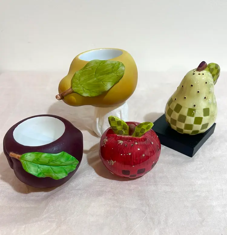 Whether displayed together as a centerpiece or scattered for a fun accent, this kitschy fruit set adds personality and a touch of farmhouse or cottage-style charm. Add a pop of charm to your table with this whimsical ceramic fruit collection featuring an apple, pears, and plum design. This delightful set includes salt and pepper shakers along with candleholders, creating a cheerful, vintage-inspired display perfect for kitchens, dining tables, or seasonal décor. *browse my vintage collection of kitschy items and fun decor accents