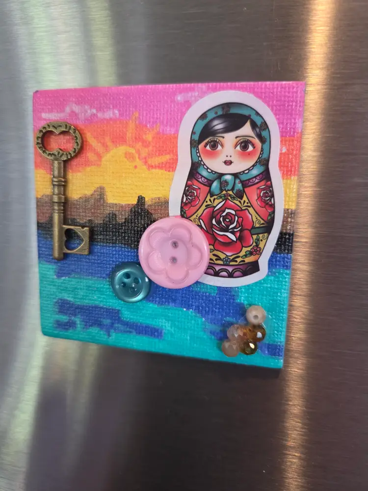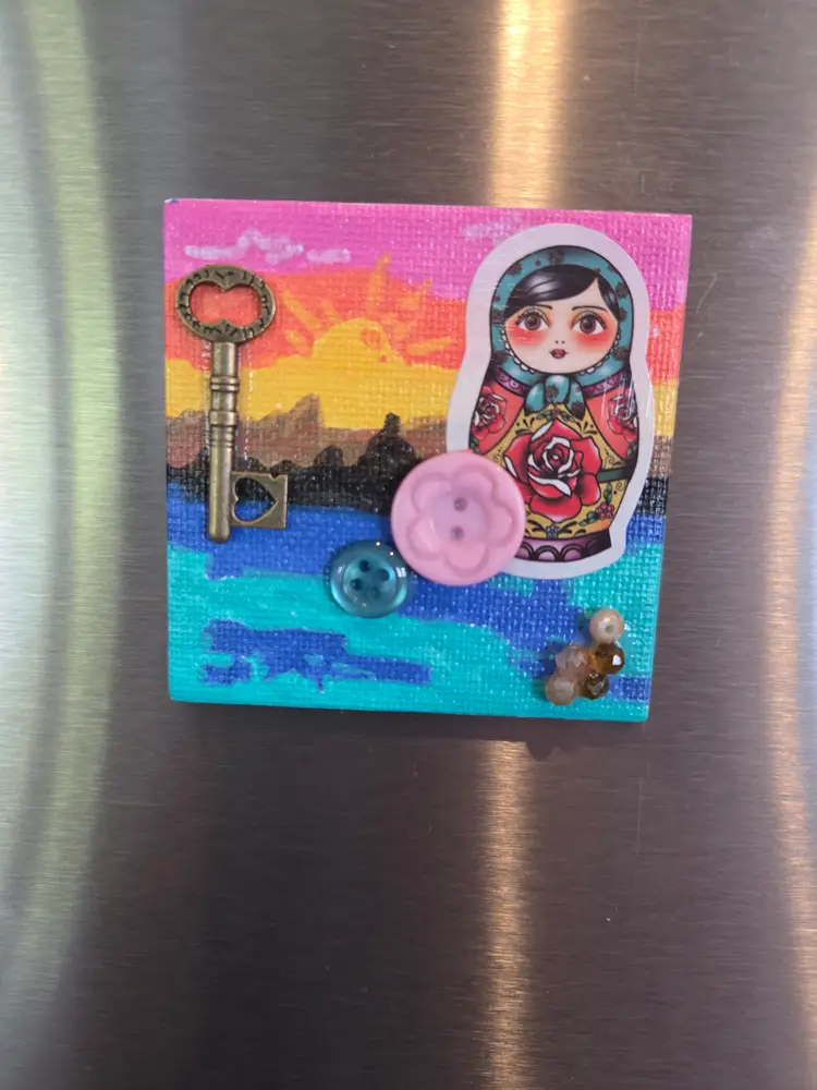 Brighten up your space with this whimsical magnet featuring a colorful matryoshka doll, a vintage-style key, and charming buttons. Perfect for adding a playful touch to your fridge or magnetic board.