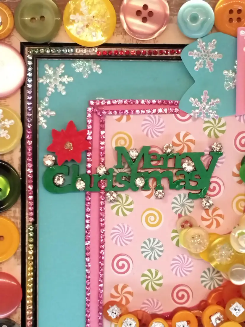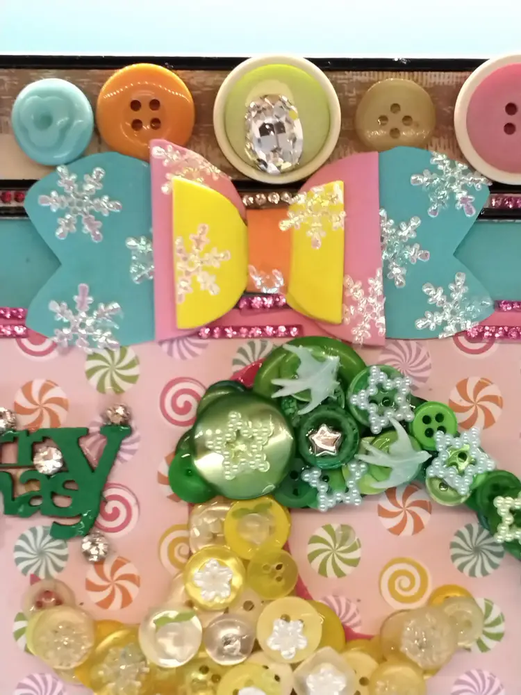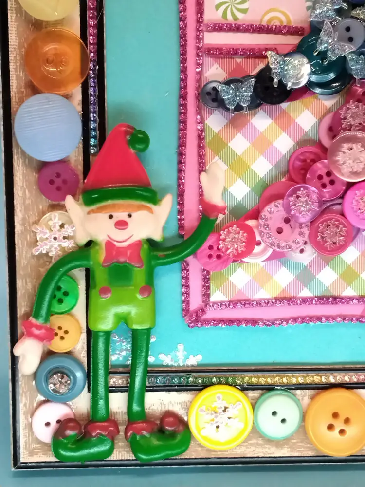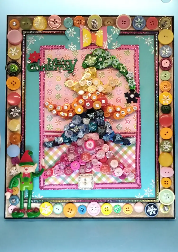 Add a touch of festive cheer with this whimsical button Christmas tree art. Crafted with colorful buttons and a playful elf, it's perfect for holiday decor or as a unique gift.