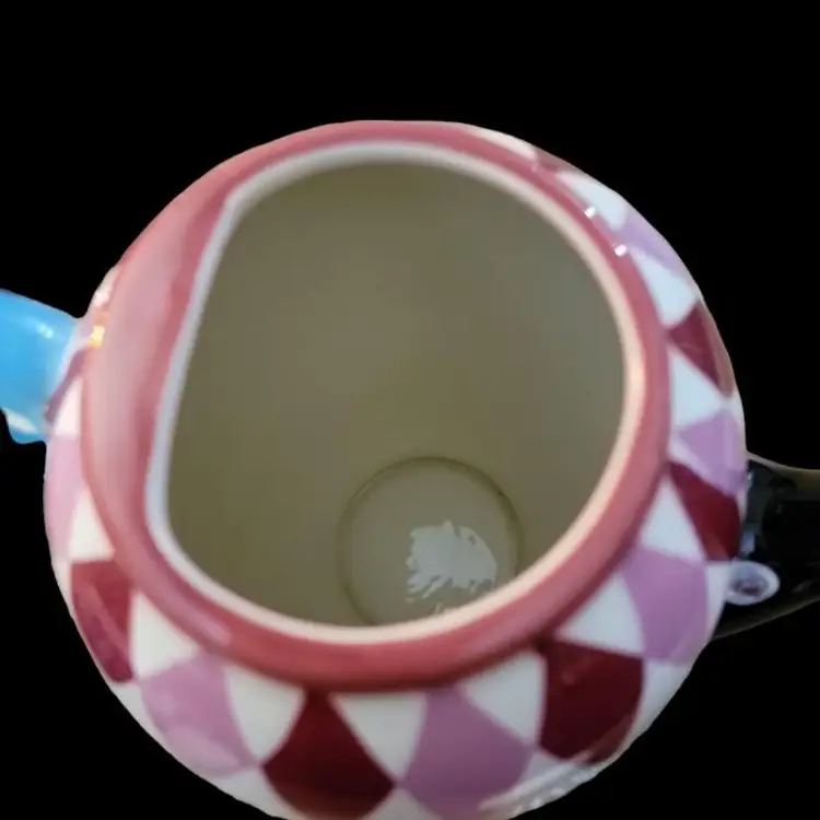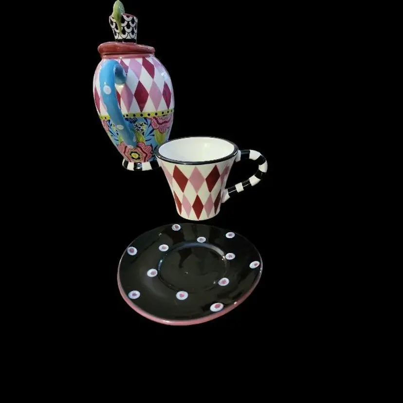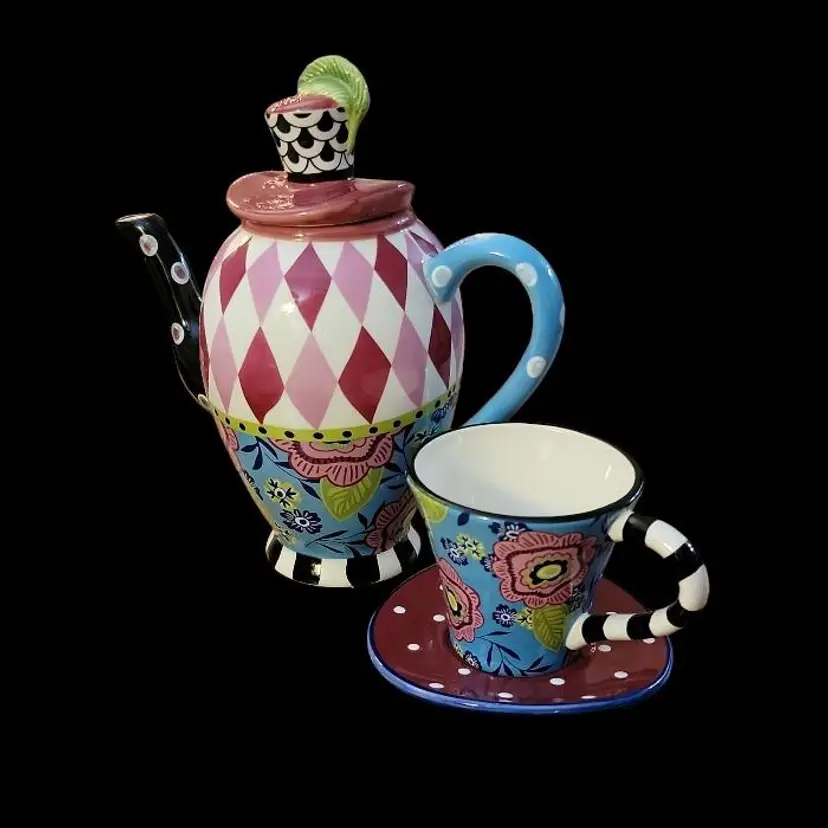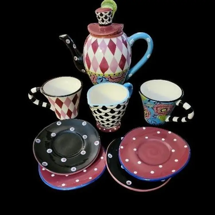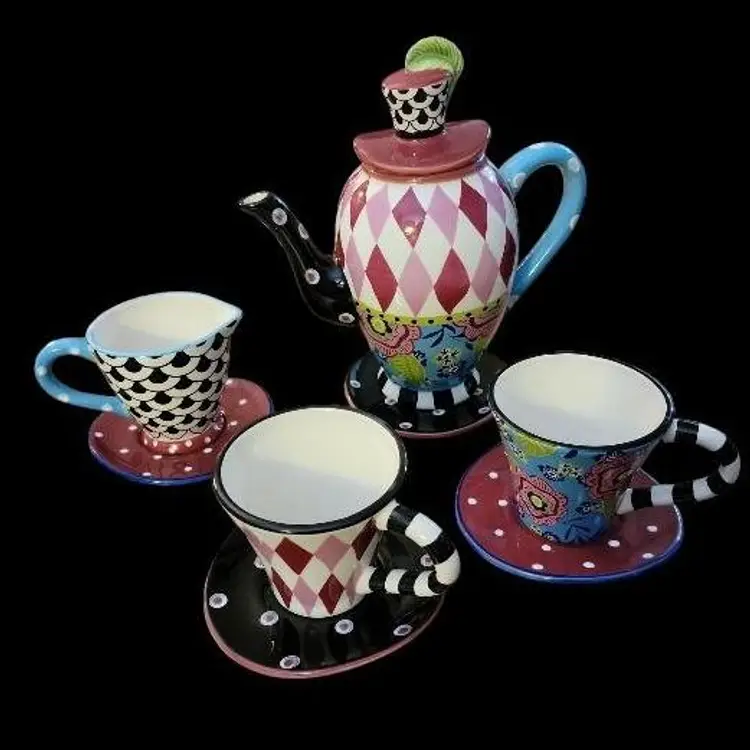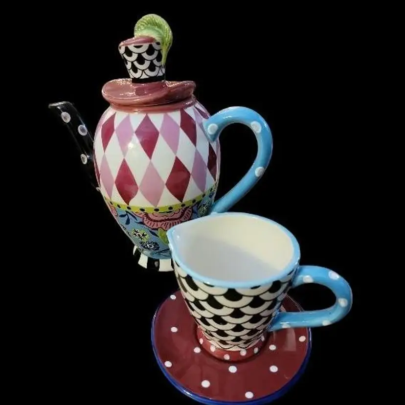 Joyce Sheldon's charming tea set is a wonderful way to commemorate special days with your children, grandchildren or special someone. The set, produced with quality standards by Certified International, includes the numerous teapot with a wacky top hat and feather, matching (in the most extraordinary ways) cups and saucers, as well as a matching creamer. The sugar bowl is missing although it is possible to find and add one to your collection. The teapot with lid is 9" tall and about 9" wide from handle to spout. The diameter of the opening at the rim is 2 3/4" and the depth is about 6 1/2". The cups are 3 1/4" tall and 3 1/2" in diameter and 3" in depth. The saucers are 5" in diameter. The creamer is 3 1/2" tall and 3 3/4" in diameter measured from spout to handle and 3 1/2" in depth. There is one tiny white flea bite just off the rim of the blue cup and what appears to be a slight chip under the glaze on the rim of the creamer. The bottom edge of the pitcher has one place that seems worn down a bit but it doesn't affect the pitcher standing flat nor can it be seen when the pitcher is upright. This set would be packaged in at least two separate packages to prevent breakage. In winter months caution should be taken to let the package remain unopened for a day or so to bring the pottery to room temperature after being out in frigid weather.