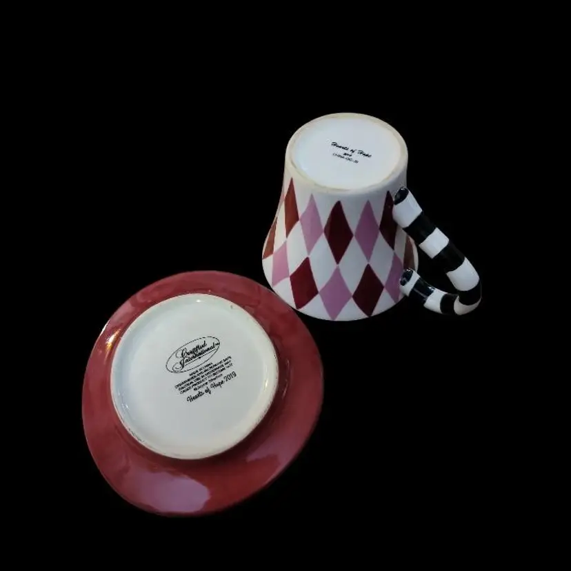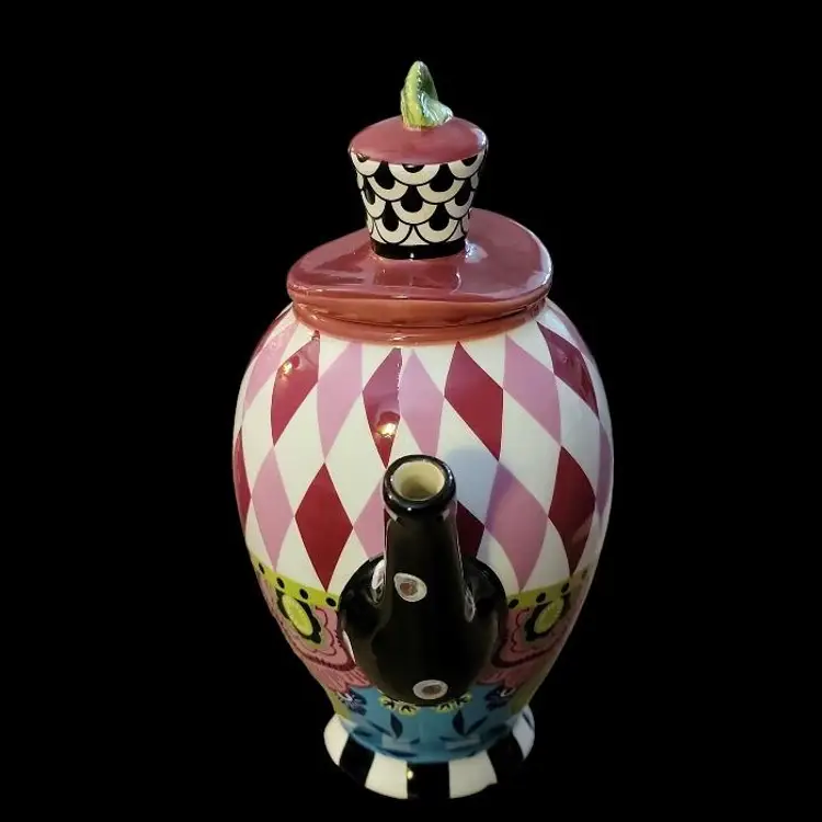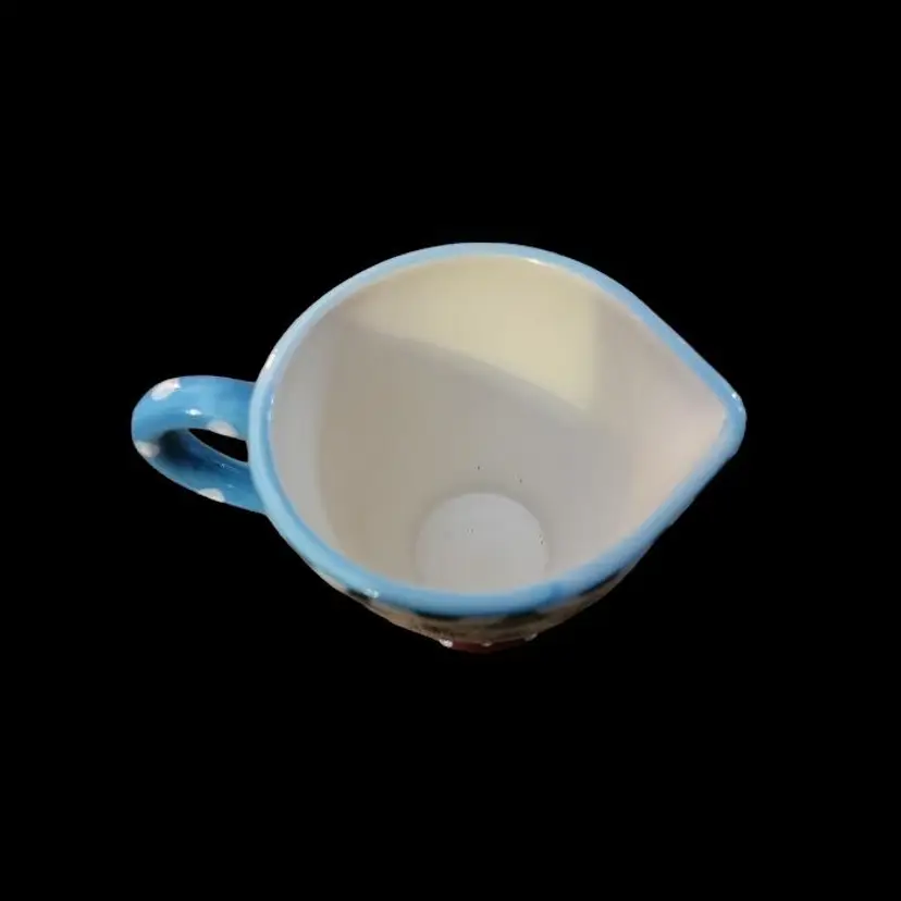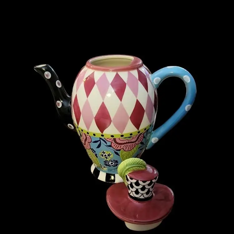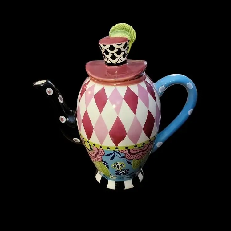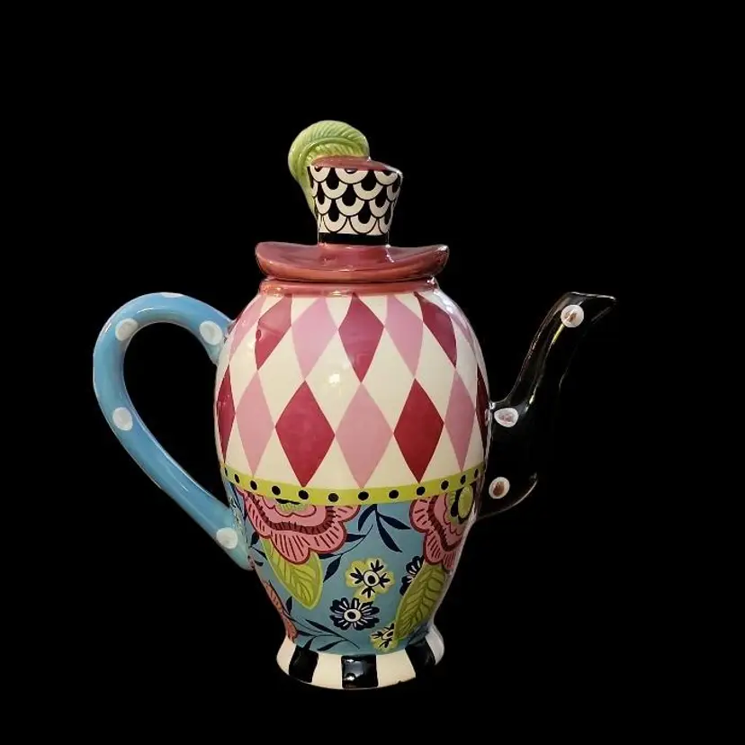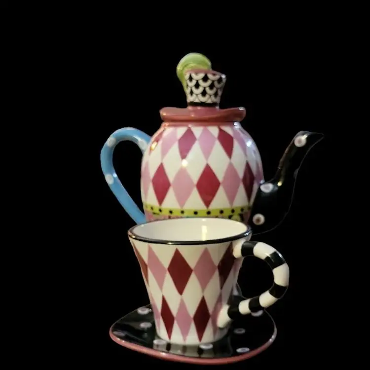 Joyce Sheldon's charming tea set is a wonderful way to commemorate special days with your children, grandchildren or special someone. The set, produced with quality standards by Certified International, includes the numerous teapot with a wacky top hat and feather, matching (in the most extraordinary ways) cups and saucers, as well as a matching creamer. The sugar bowl is missing although it is possible to find and add one to your collection. The teapot with lid is 9" tall and about 9" wide from handle to spout. The diameter of the opening at the rim is 2 3/4" and the depth is about 6 1/2". The cups are 3 1/4" tall and 3 1/2" in diameter and 3" in depth. The saucers are 5" in diameter. The creamer is 3 1/2" tall and 3 3/4" in diameter measured from spout to handle and 3 1/2" in depth. There is one tiny white flea bite just off the rim of the blue cup and what appears to be a slight chip under the glaze on the rim of the creamer. The bottom edge of the pitcher has one place that seems worn down a bit but it doesn't affect the pitcher standing flat nor can it be seen when the pitcher is upright. This set would be packaged in at least two separate packages to prevent breakage. In winter months caution should be taken to let the package remain unopened for a day or so to bring the pottery to room temperature after being out in frigid weather.