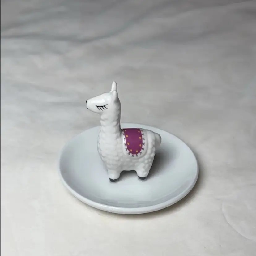 This whimsical white ceramic llama/alpaca trinket tray/jewelry holder is a charming way to organize your bracelets, rings, and earrings. Made in China, this jewelry organizer is a stylish addition to any vanity or dressing table. The white color and unique design make it a versatile piece that can complement any decor. Perfect for keeping your precious accessories neat and tidy while adding a playful touch to your space. Diameter of the dish is 4.25”. Stands 3” tall.