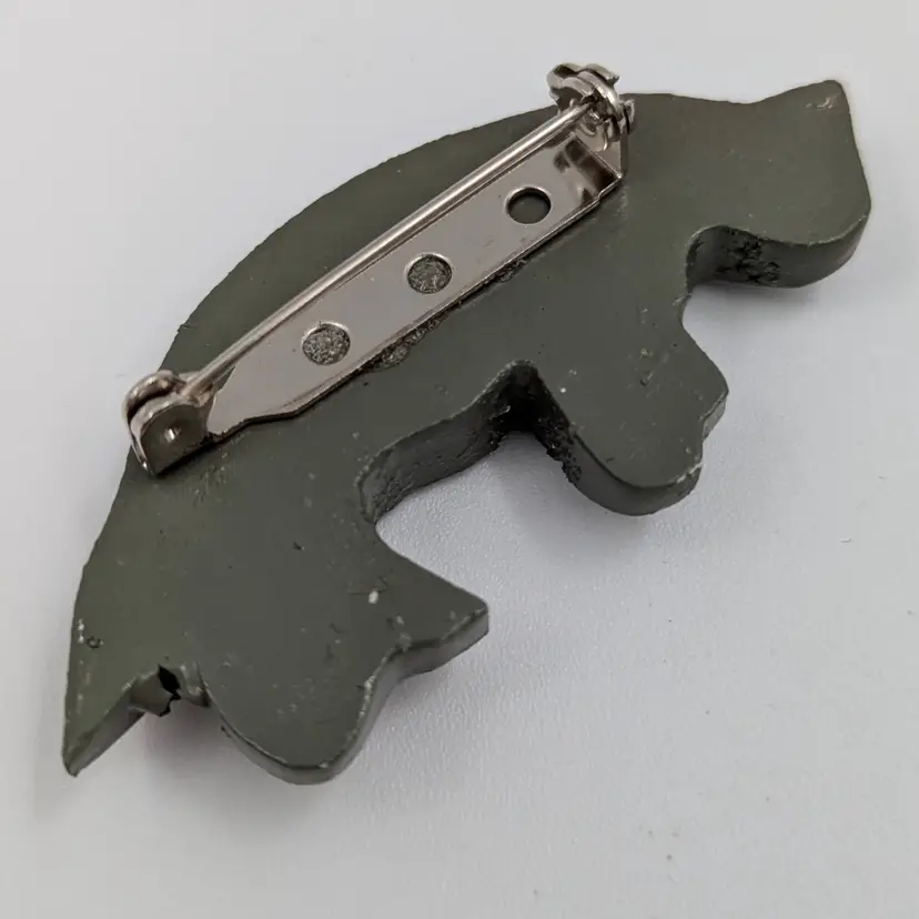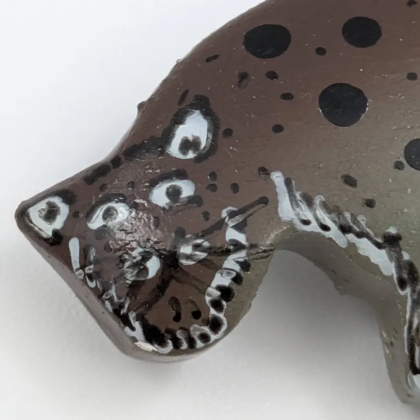 Adorable hand-painted brooch featuring a whimsical spotted snow leopard (other possiblity some other big cat) Perfect for adding a touch of fun to any outfit. Measures 2.5" x 1". Good vintage condition.