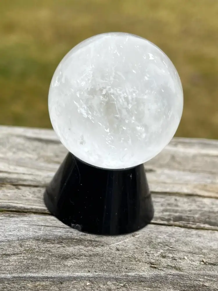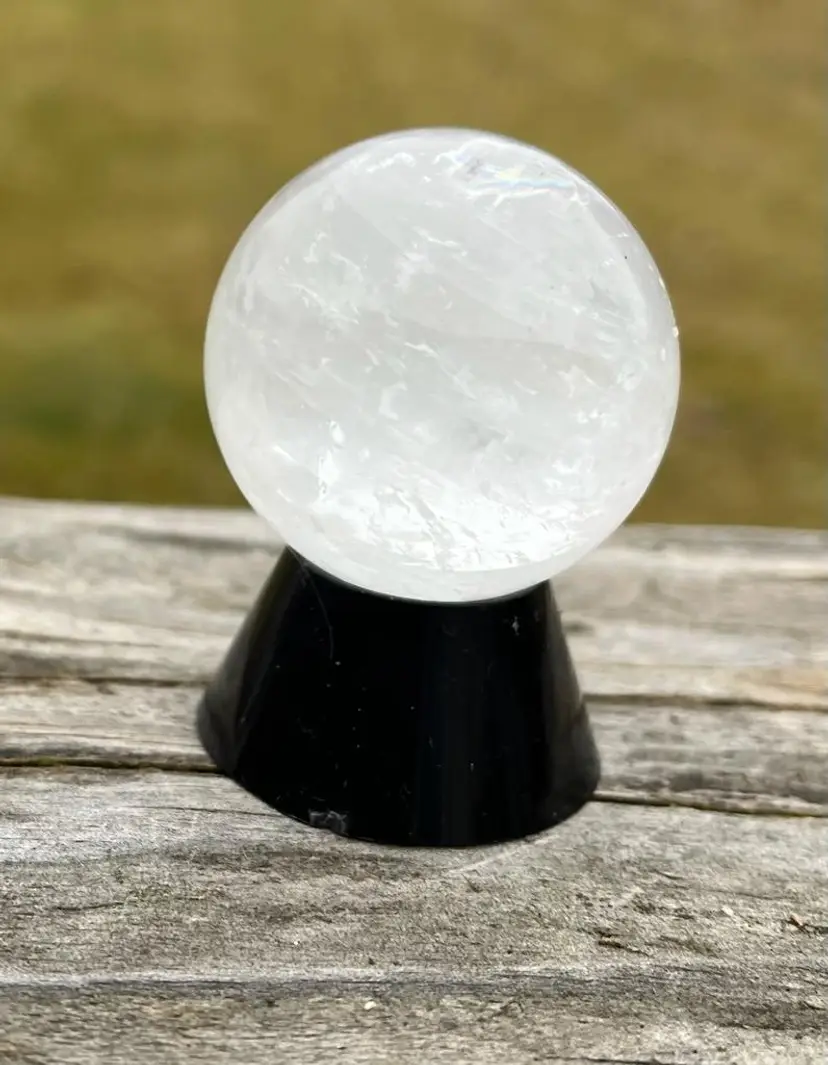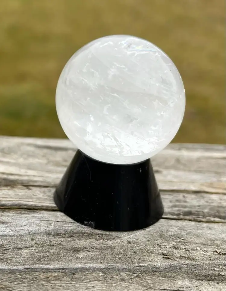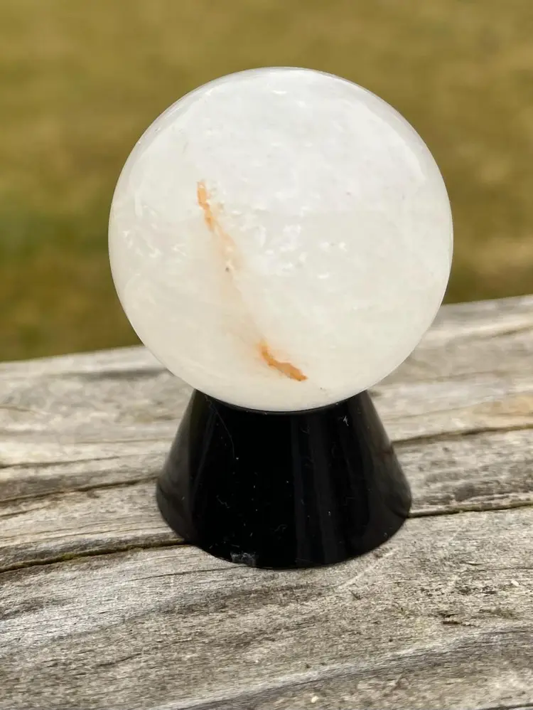 A White and Clear Quartz Orb Sphere. 40 mm. Some beautiful iridescent in this! There is a small brown line of another stone in it. A stand is included. There are two small rough spot that are not noticeable. I can barely feel it. A stand is included.