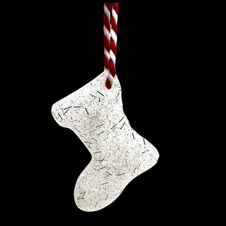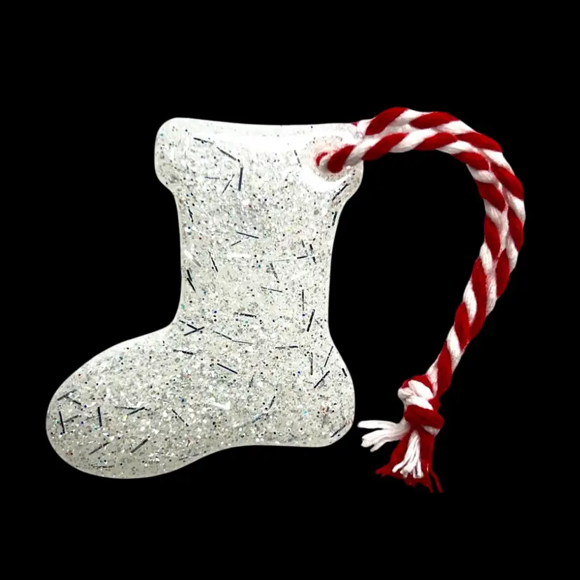 Handmade by me 🫶 White stocking ornament with silver threads in resin. Comes with hanging ribbon! 1-3/4” x 1-1/2” x 1/8”