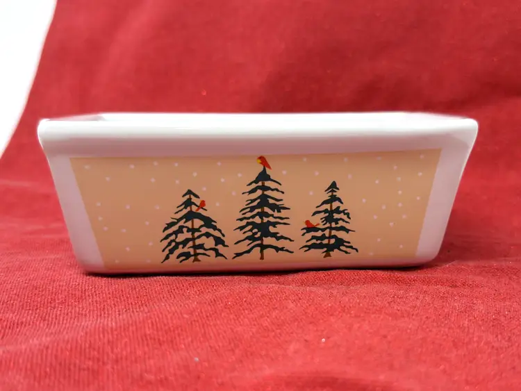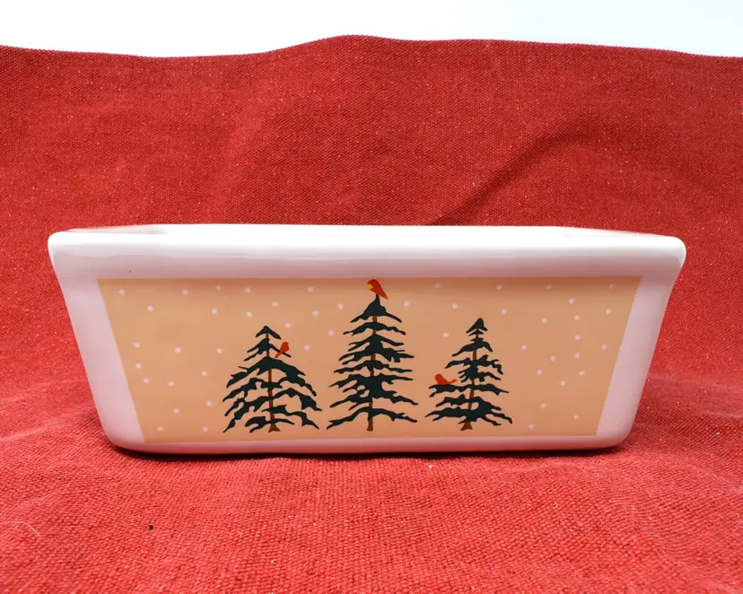 This vintage ceramic loaf pan brings the timeless charm of 1980s holiday kitchens to your home. Decorated with bright red cardinals perched on pine trees against a warm tan band, it captures the nostalgic beauty of winter gatherings.