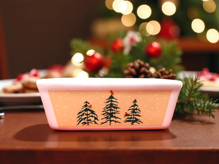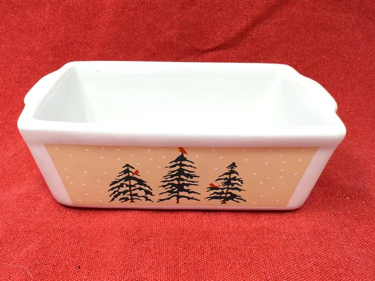 A charming 1980s holiday loaf pan featuring cardinals and pine trees — vintage warmth for your Christmas kitchen.