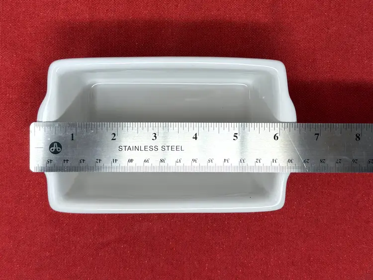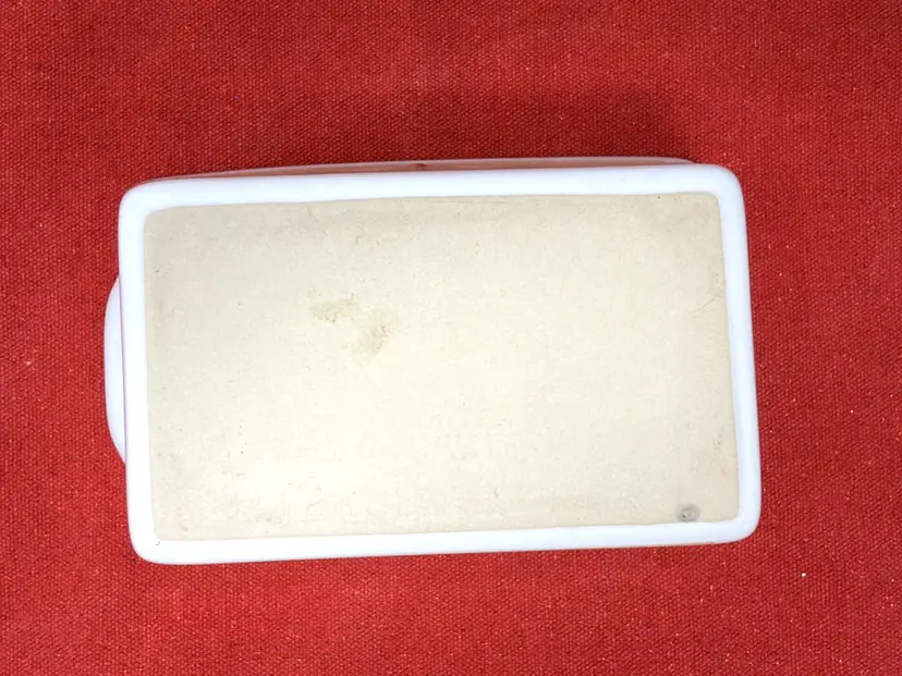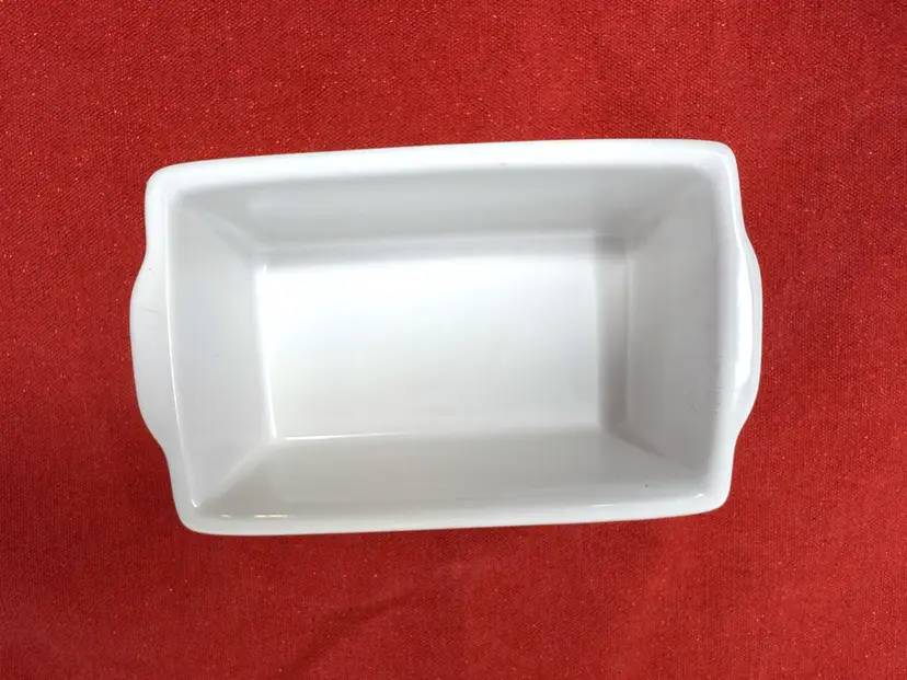 Crafted from sturdy glazed ceramic with a smooth white finish, this small rectangular bakeware dish was likely produced for U.S. import during the late 20th century. Its understated design and compact size make it ideal for both baking and display — perfect for collectors of vintage kitchenware or cozy Christmas décor.