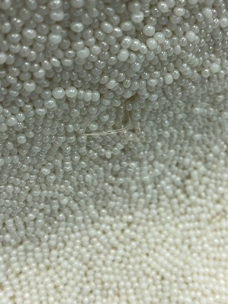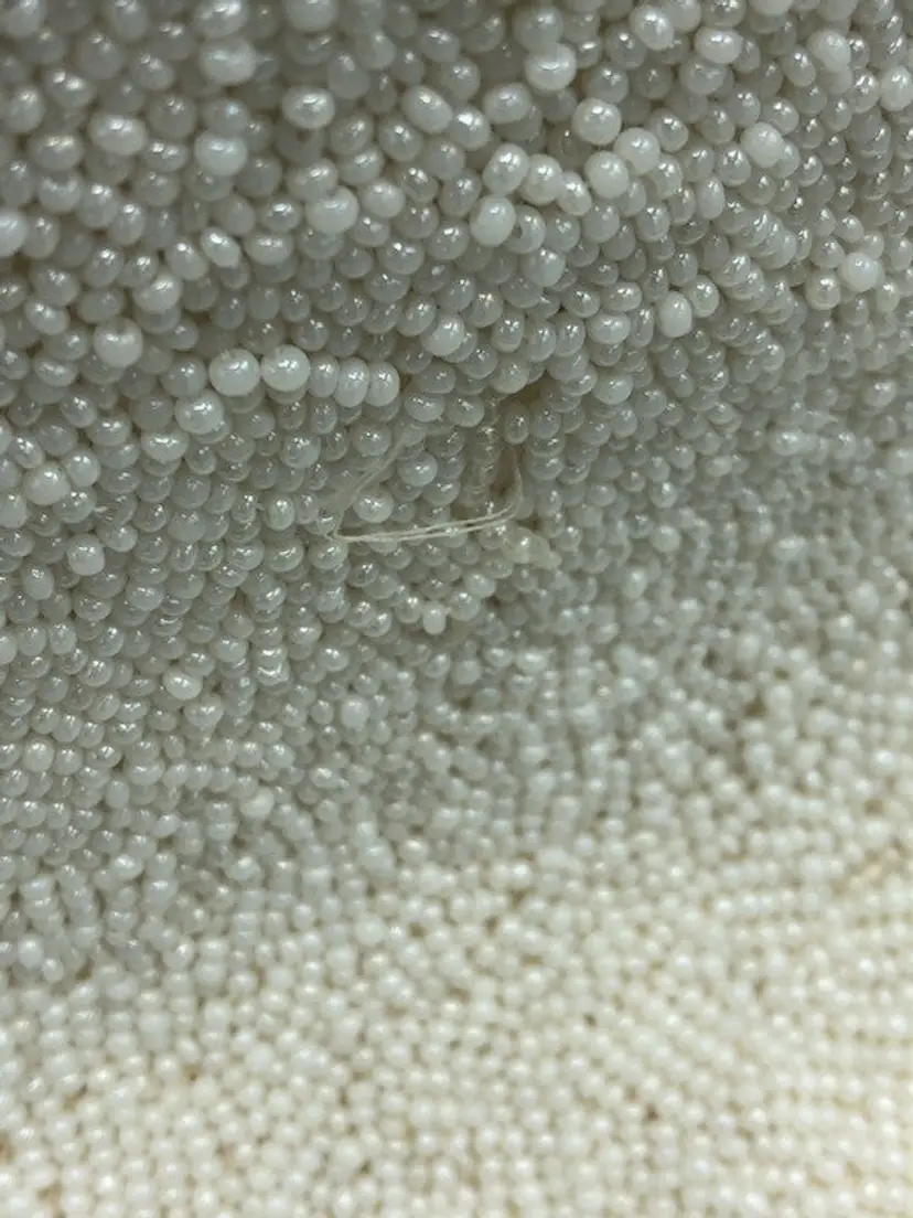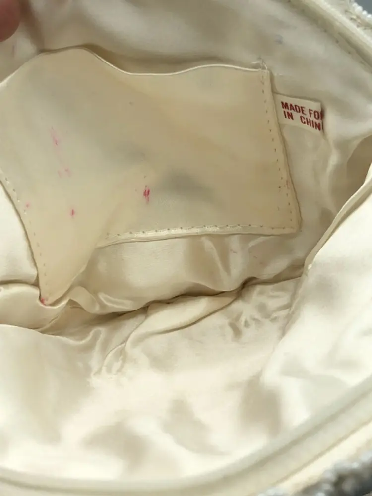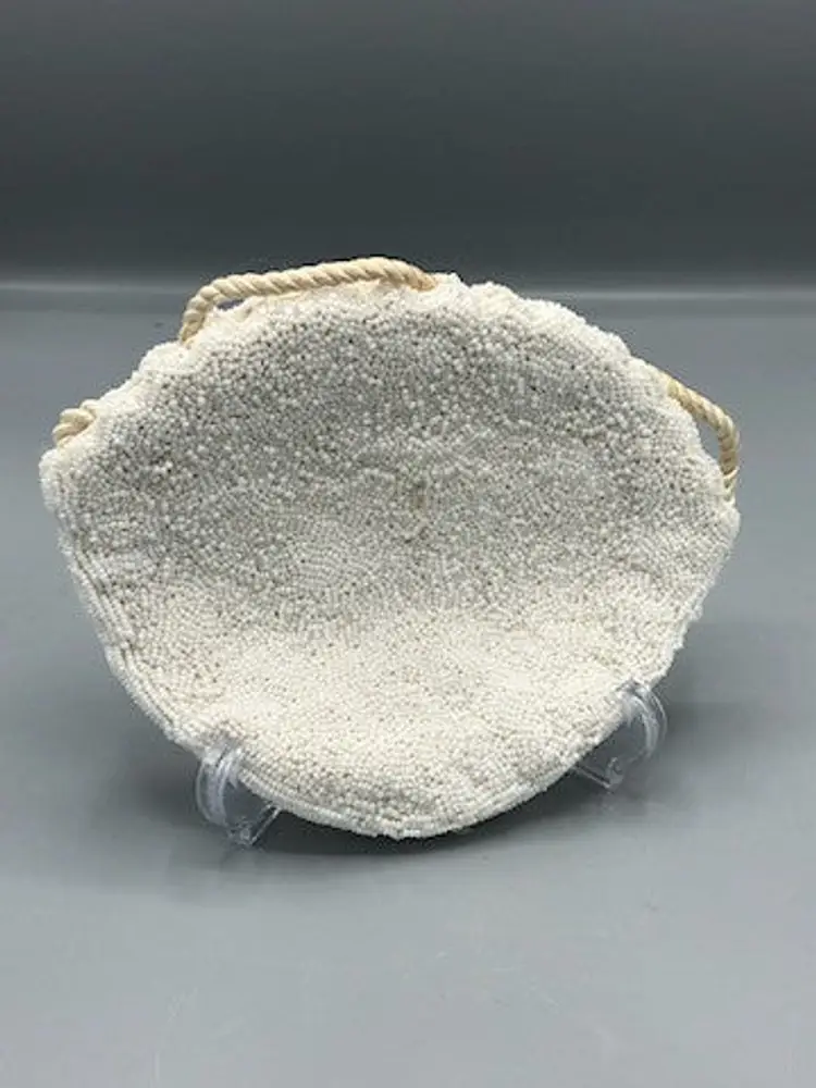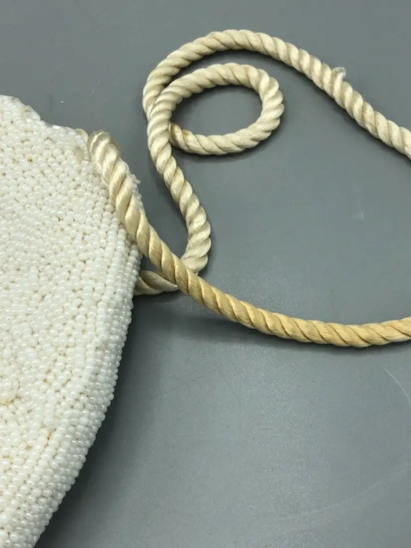 White beaded purse that is a cute vintage bag. The bag does have a stain on the inside, strap is discolored, beads are missing and loose. Refer to pictures for details.
