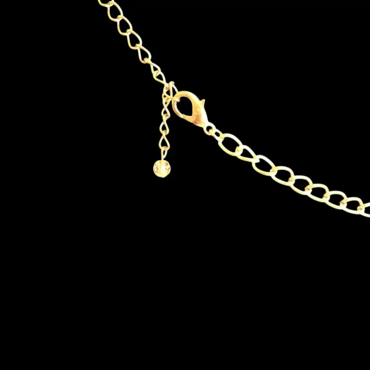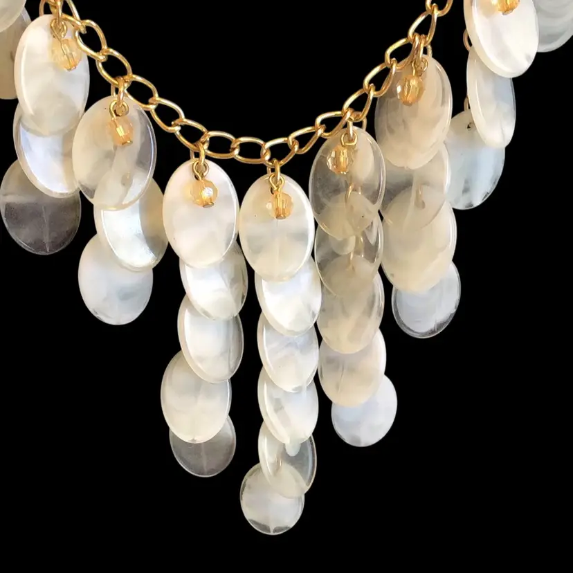 19” gold tone with white acrylic disc dangles in graduating lengths to form a bib style. #051